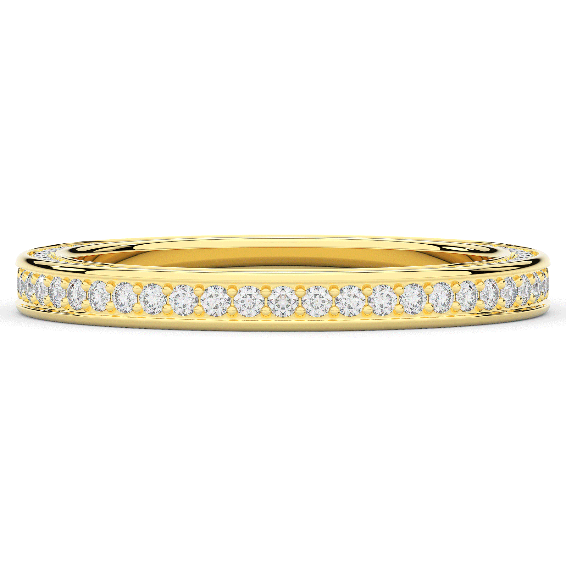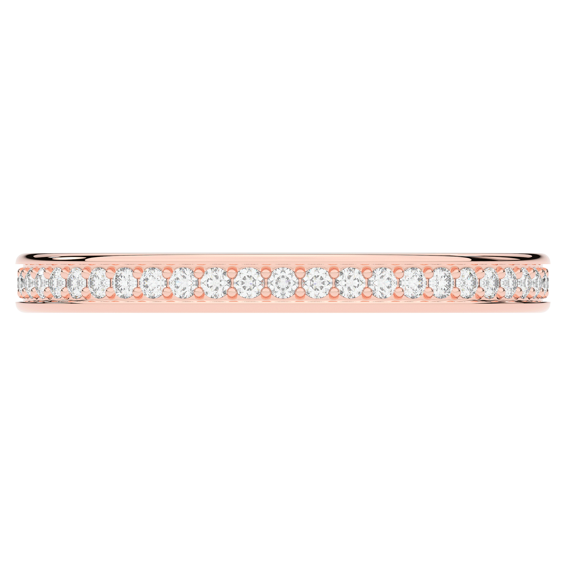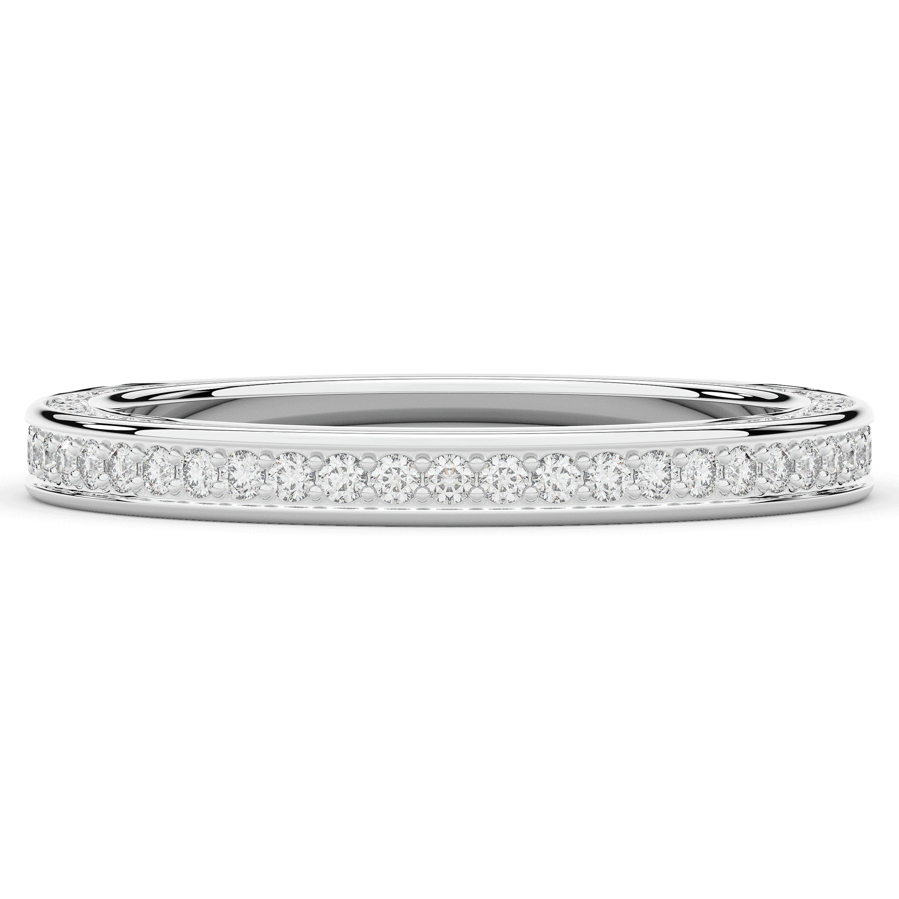 This stunning band features round lab accent diamonds on three sides in an eternity style. This ring is available in 14k white, yellow or rose gold, 18k yellow gold, as well as platinum.