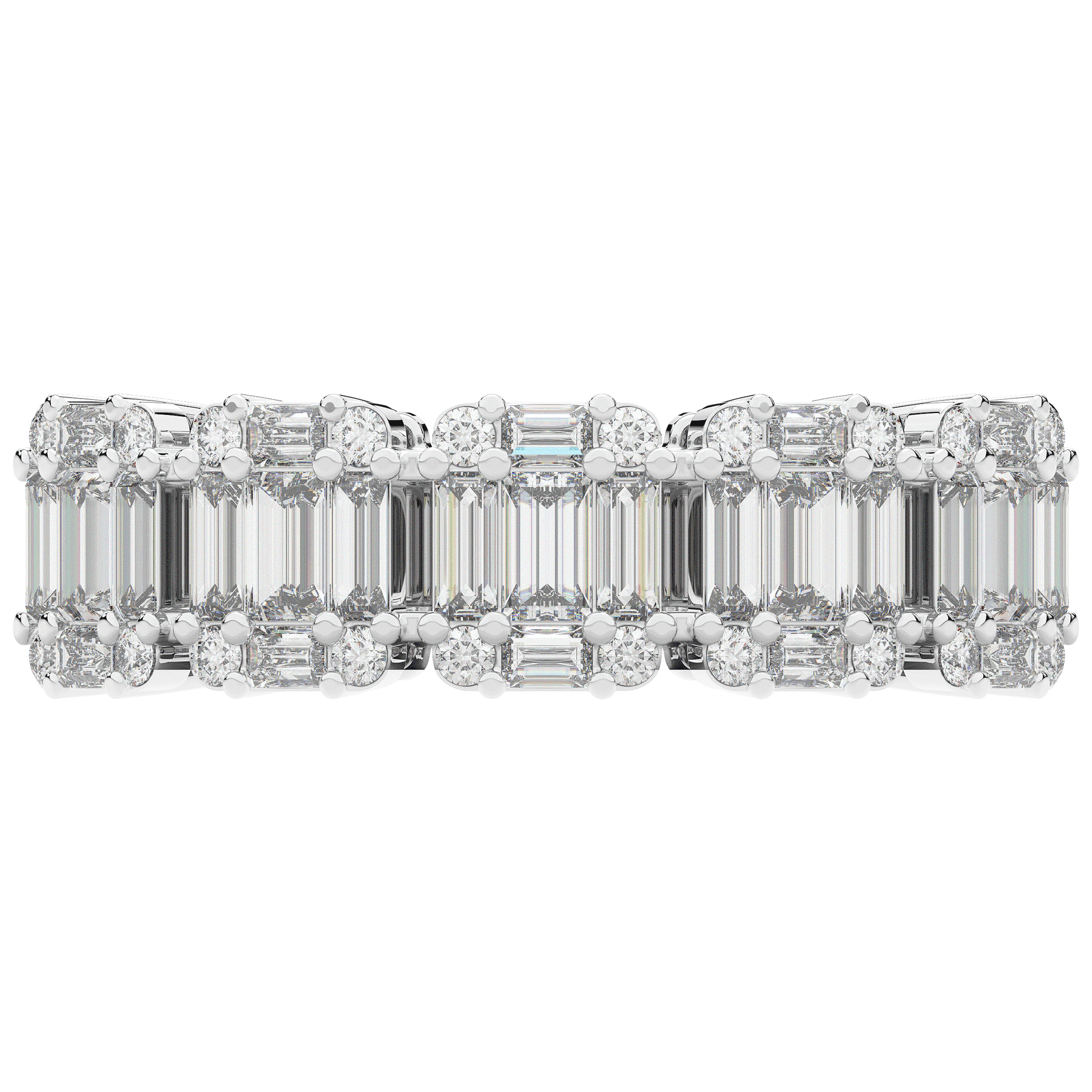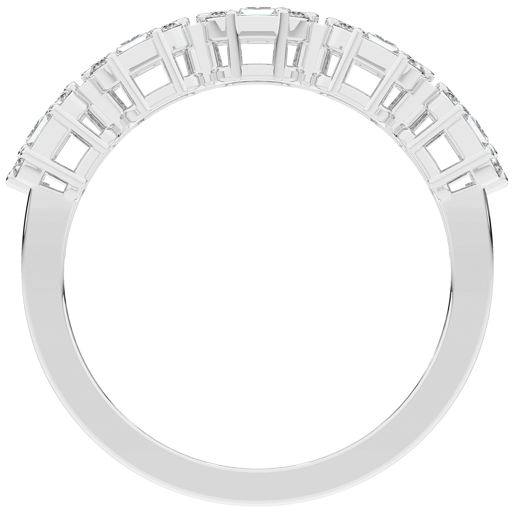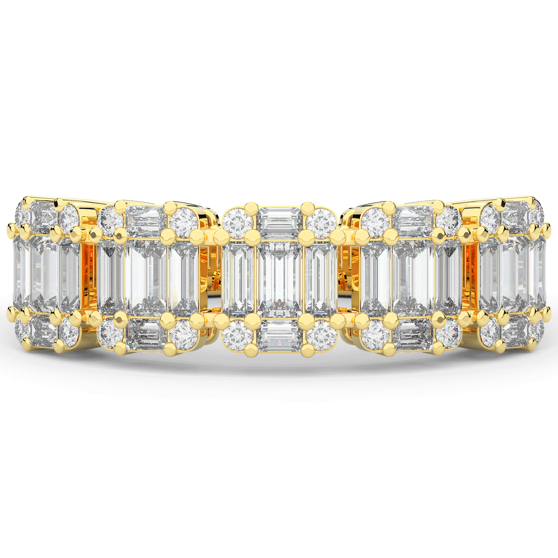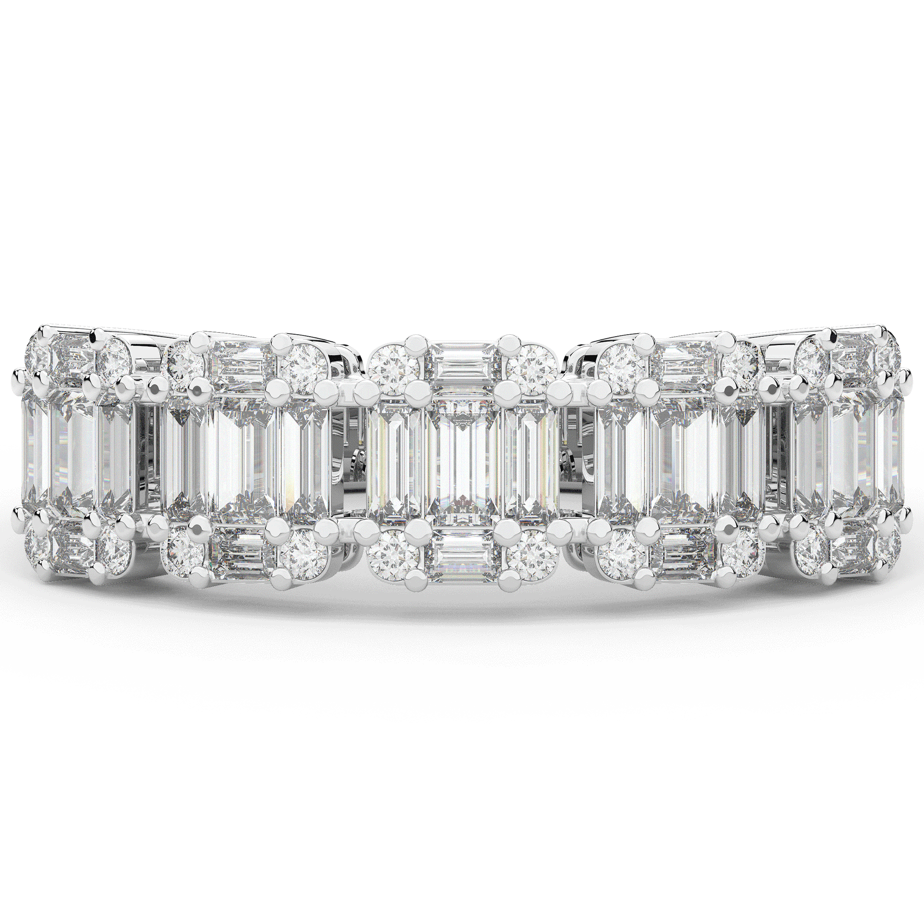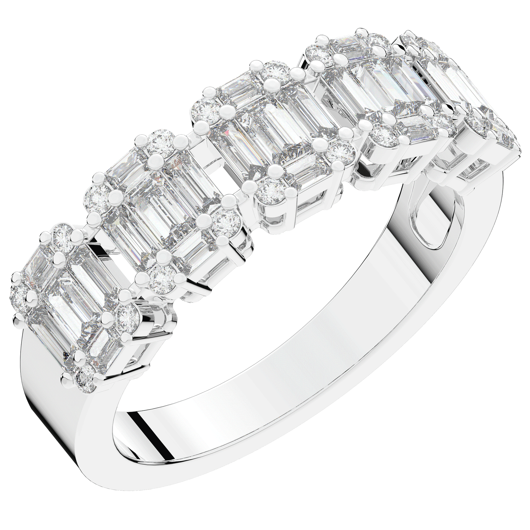 This beautiful band features clusters of baguette and round lab diamonds. This ring is available in 14k white, yellow or rose gold, 18k yellow gold, as well as platinum.