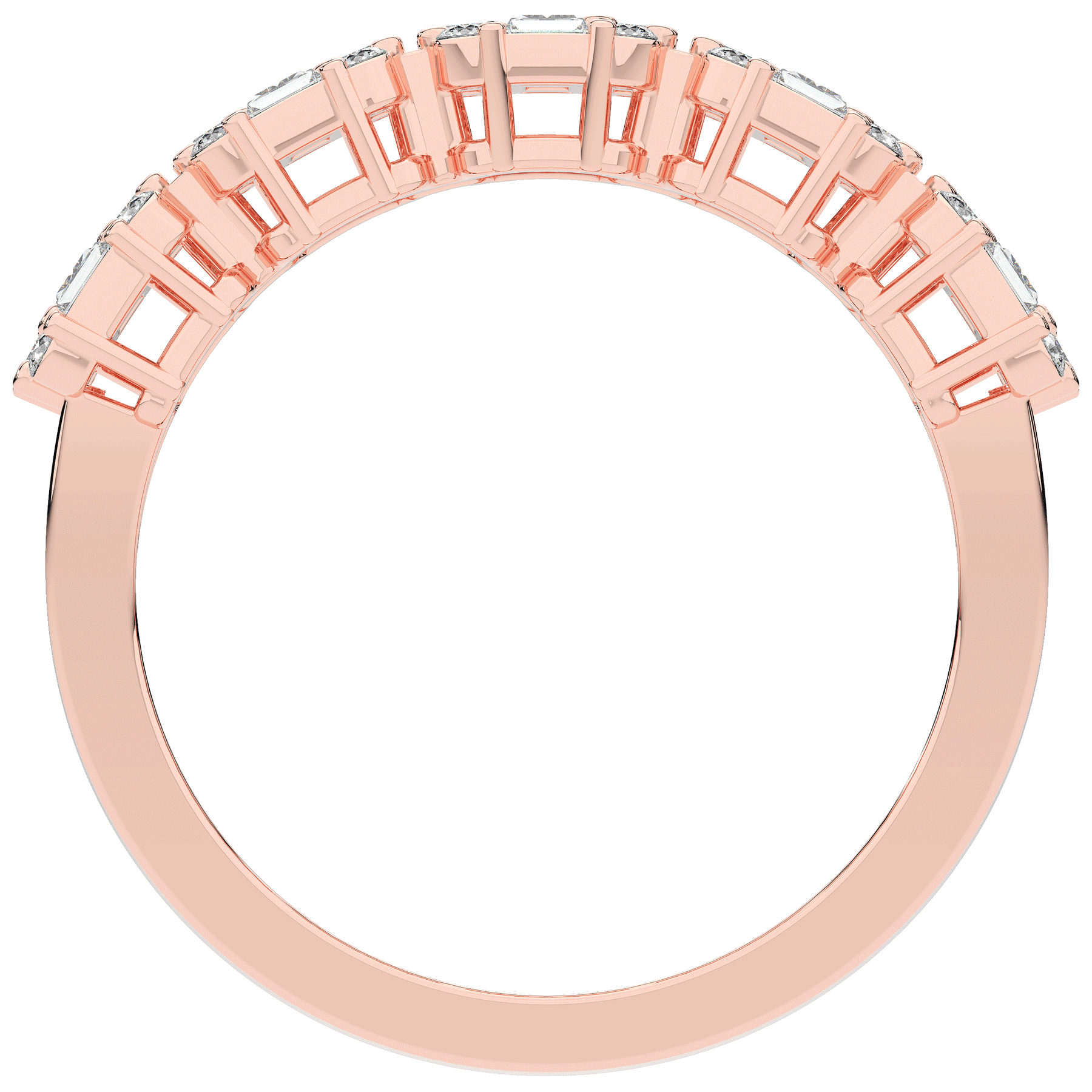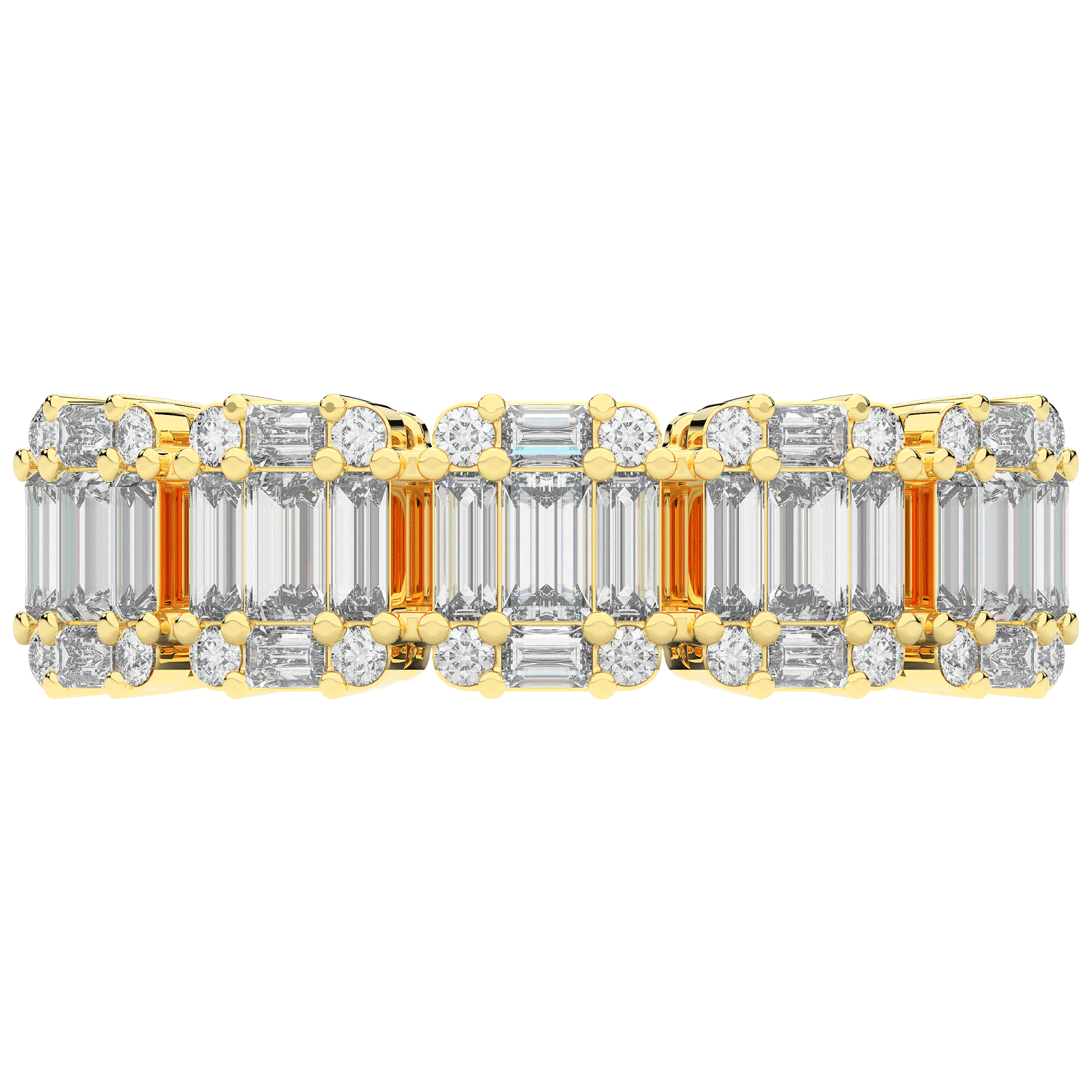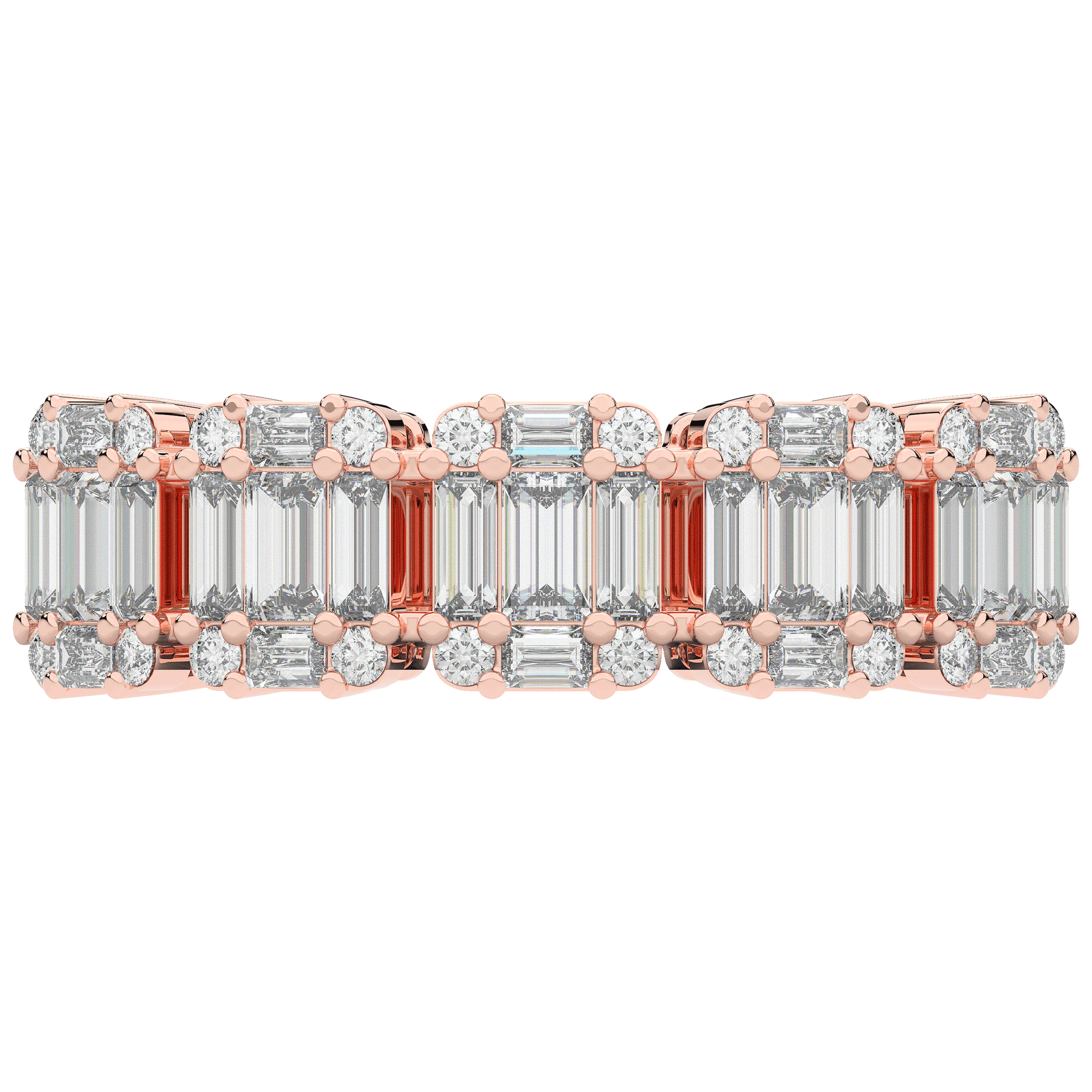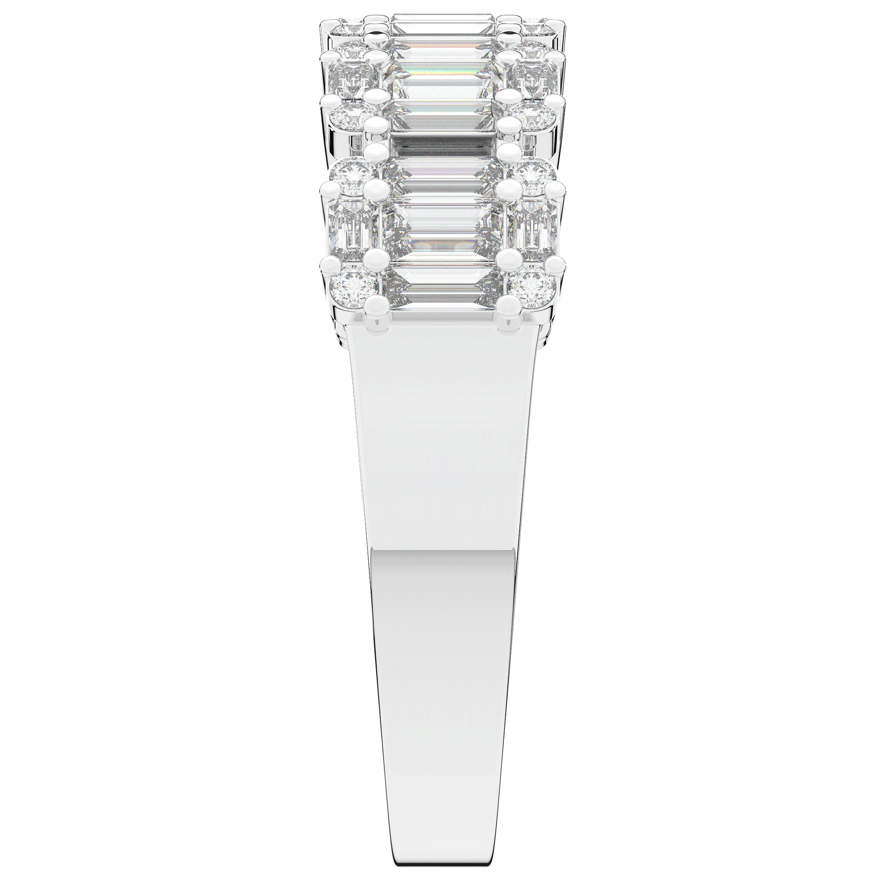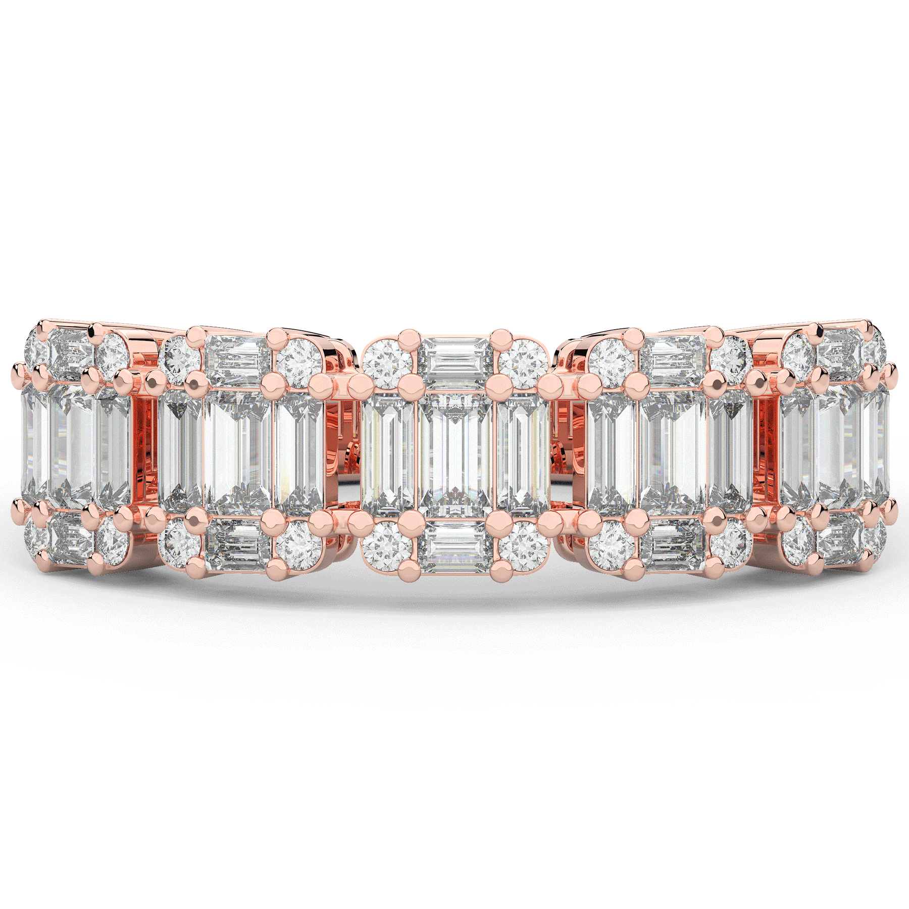 This beautiful band features clusters of baguette and round lab diamonds. This ring is available in 14k white, yellow or rose gold, 18k yellow gold, as well as platinum.