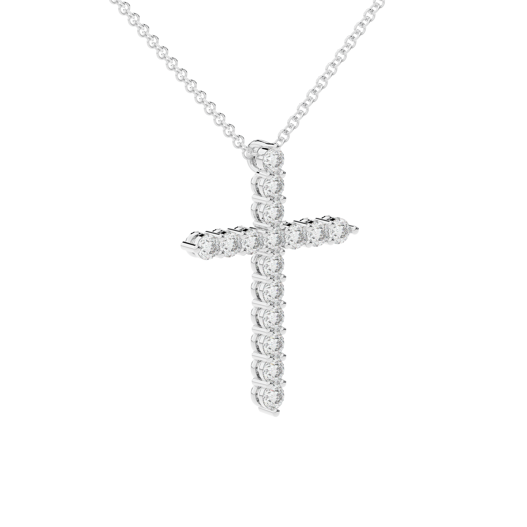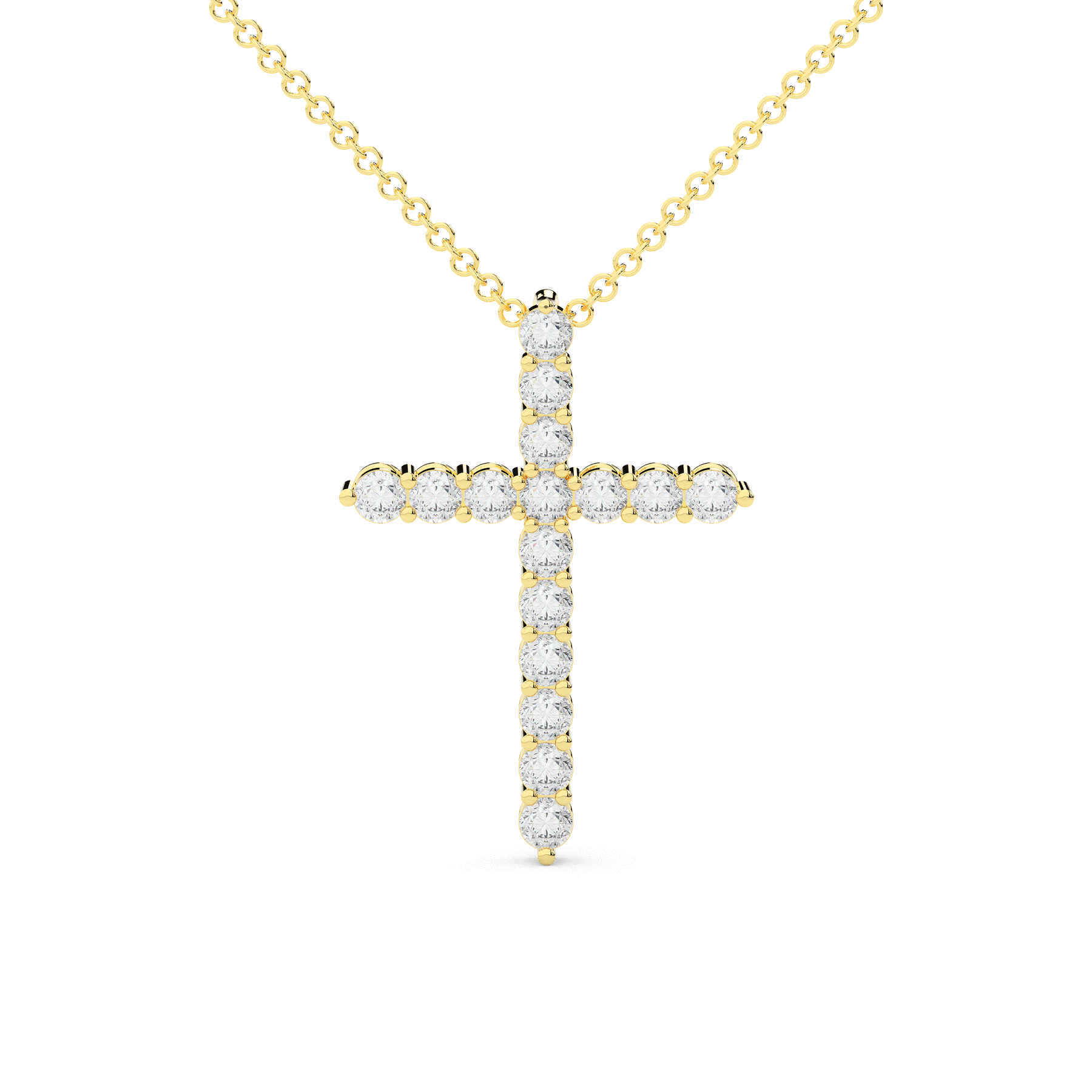 This beautiful pendant features bright round lab diamonds set with shared prongs in a cross pattern. This pendant is available in 14k white, yellow, or rose gold.