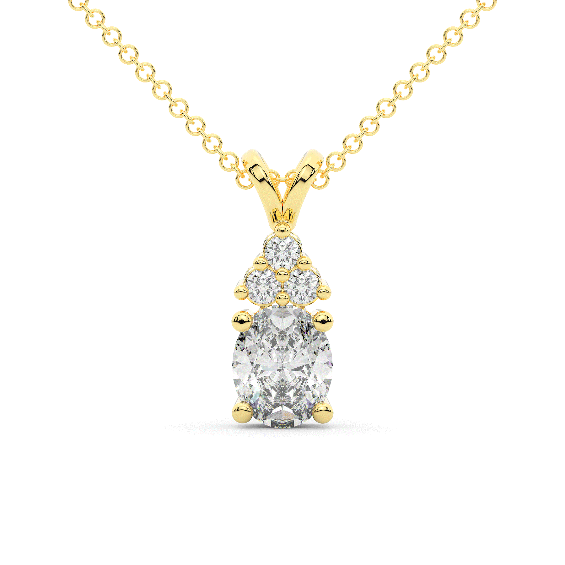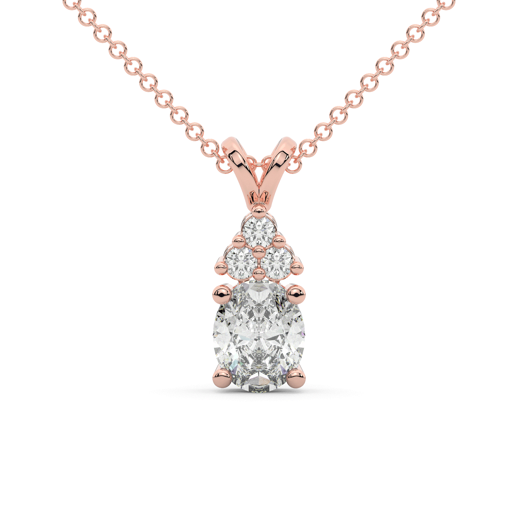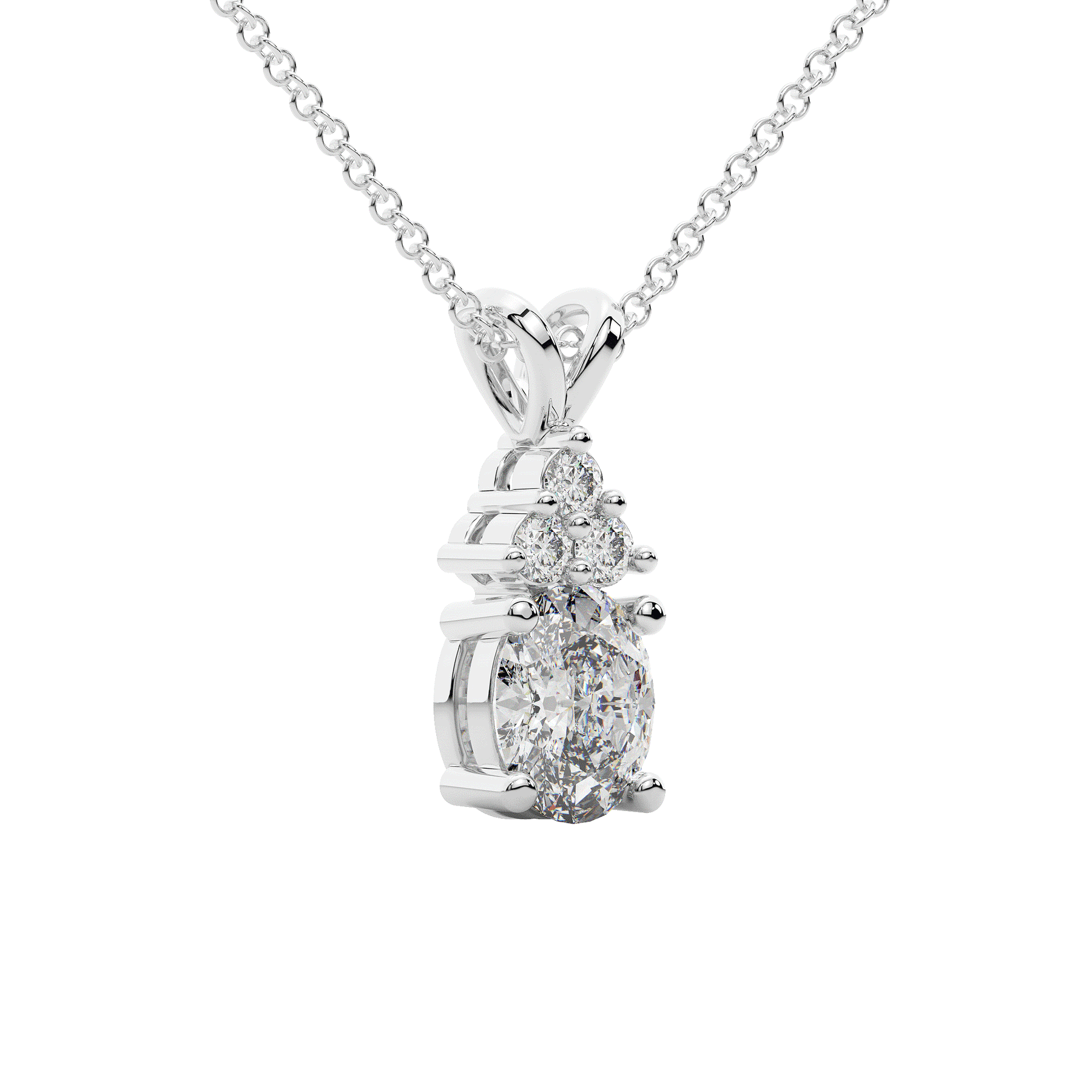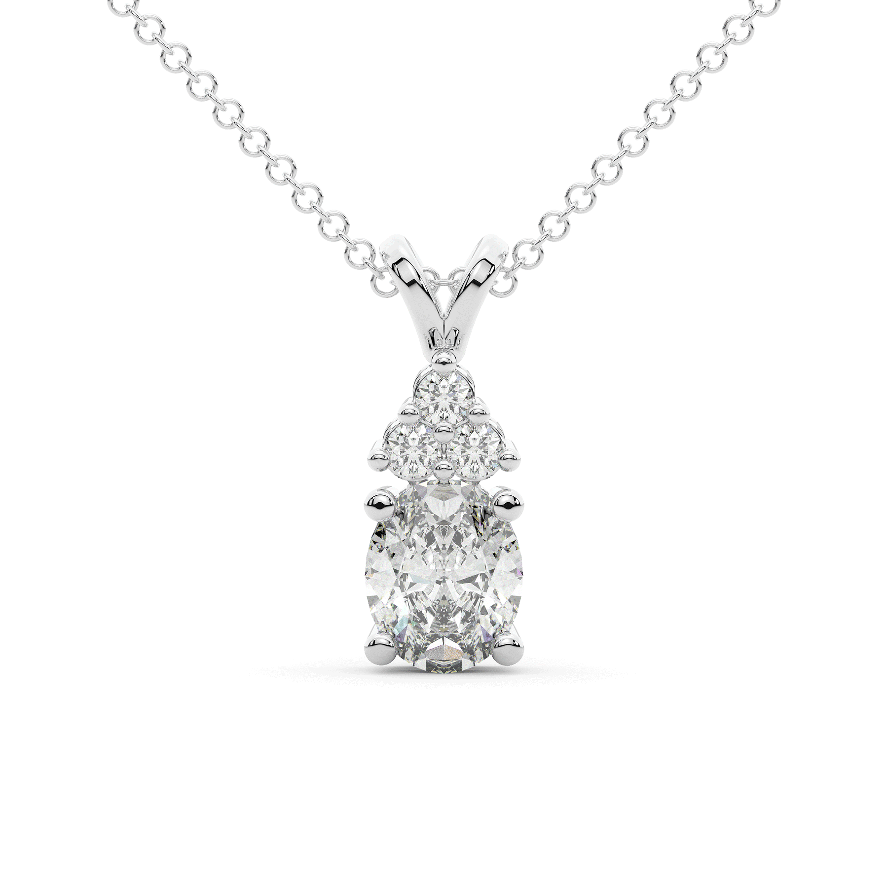 This eye catching pendant features both a large oval lab diamond and round lab diamonds making for more than a simple solitaire pendant. This pendant is available in 14k white, yellow, or rose gold.