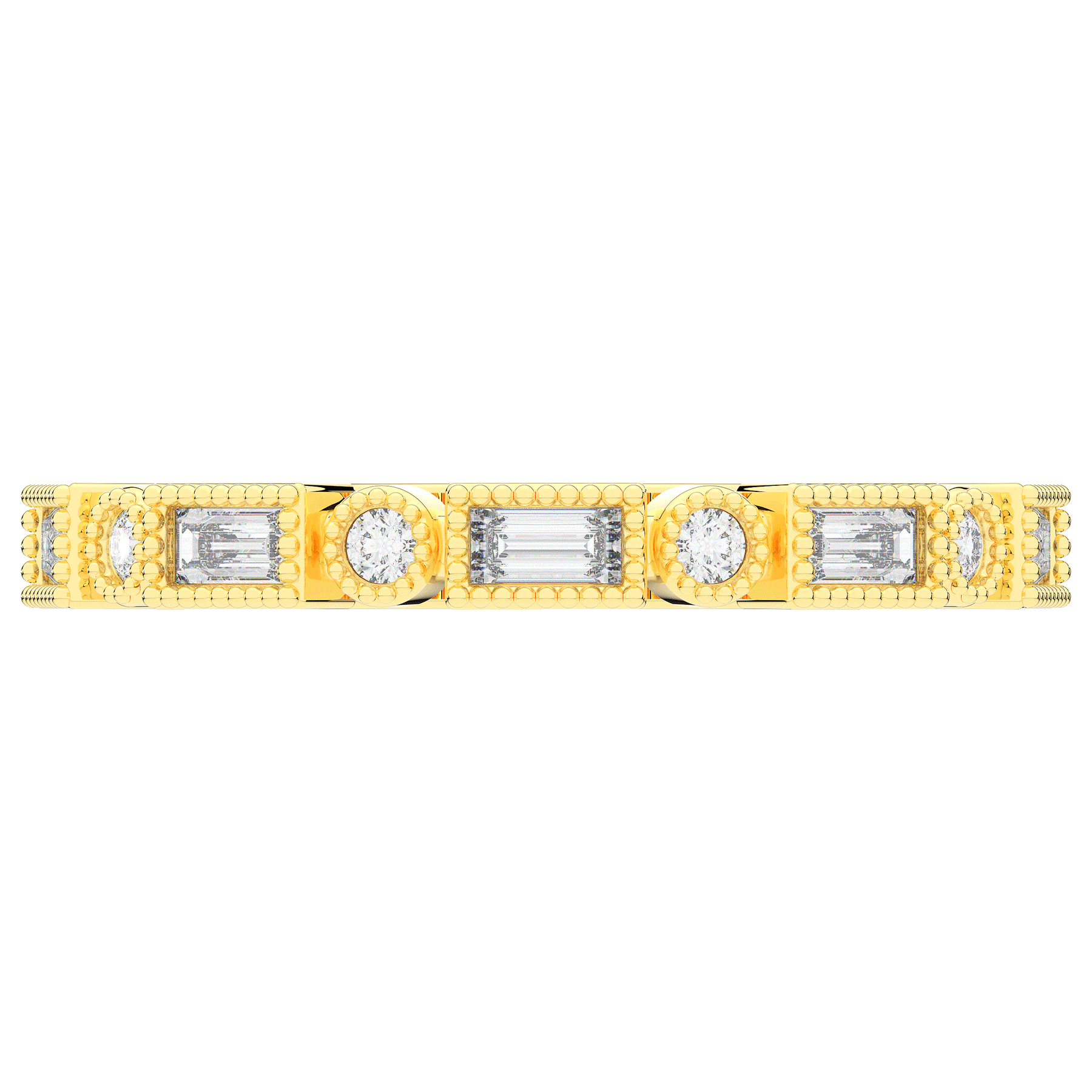 This stunning ring features alternating baguette and round lab grown diamonds in bezel settings surrounded by milgrain. This ring is available in 14k white, yellow or rose gold, 18k yellow gold, as well as platinum.