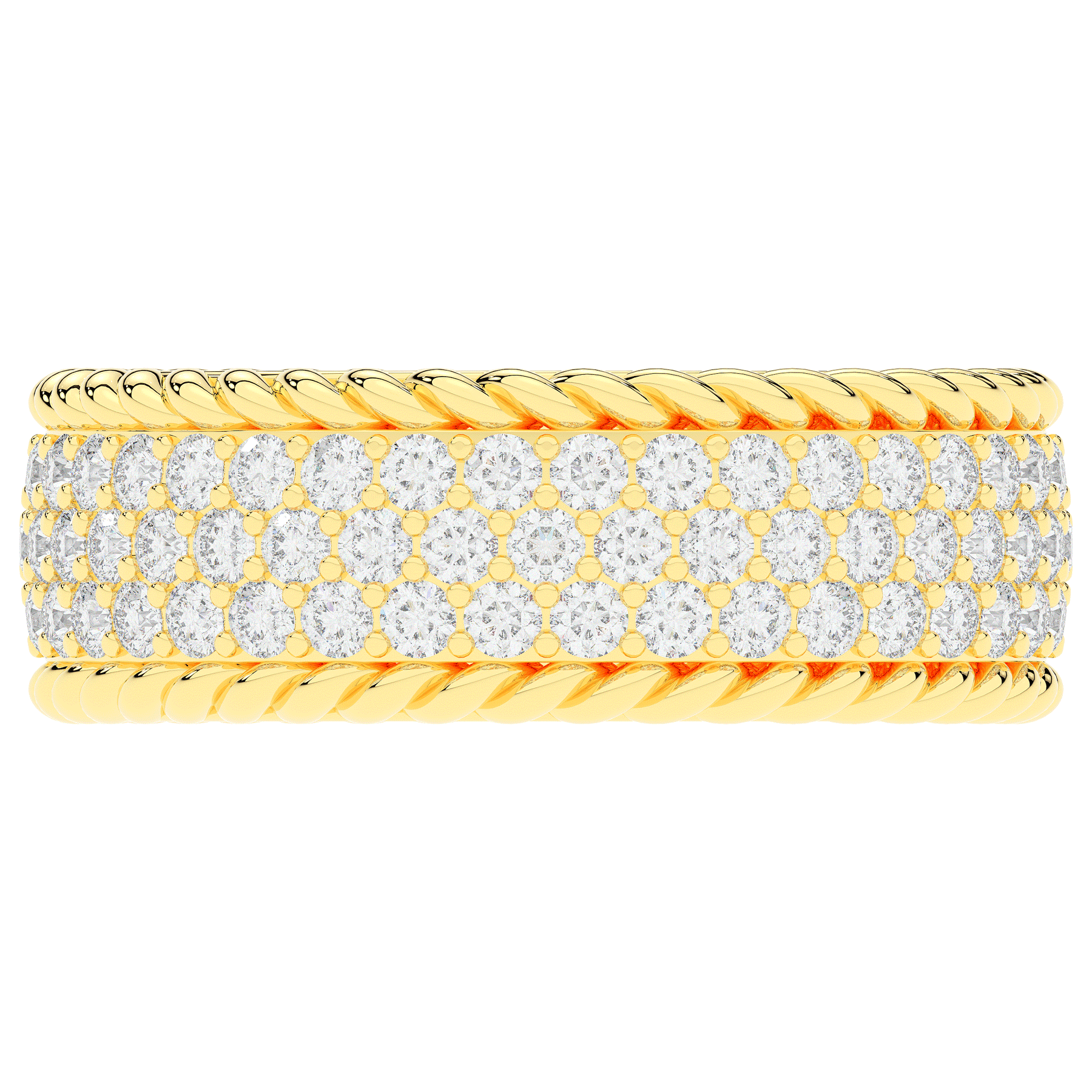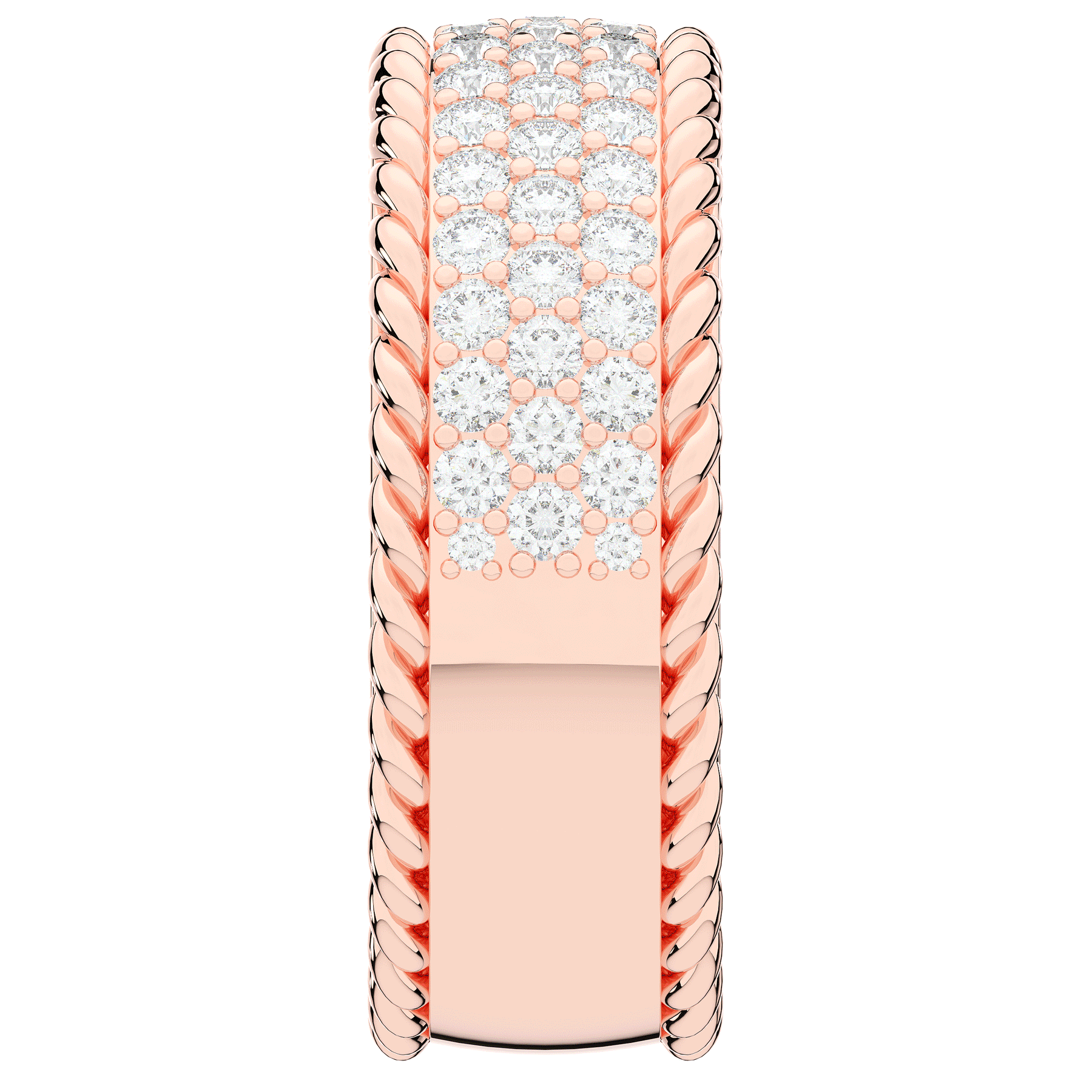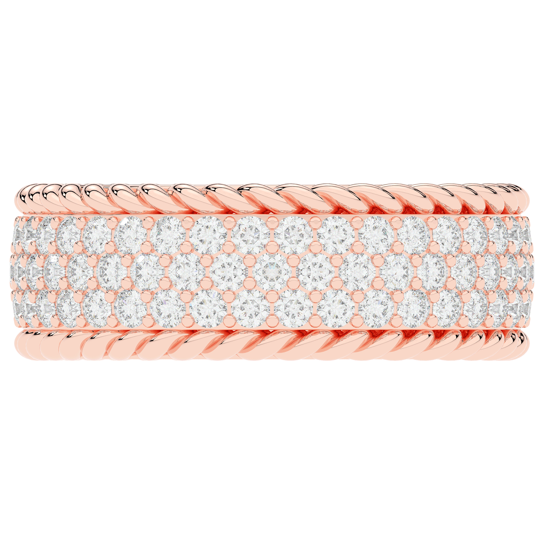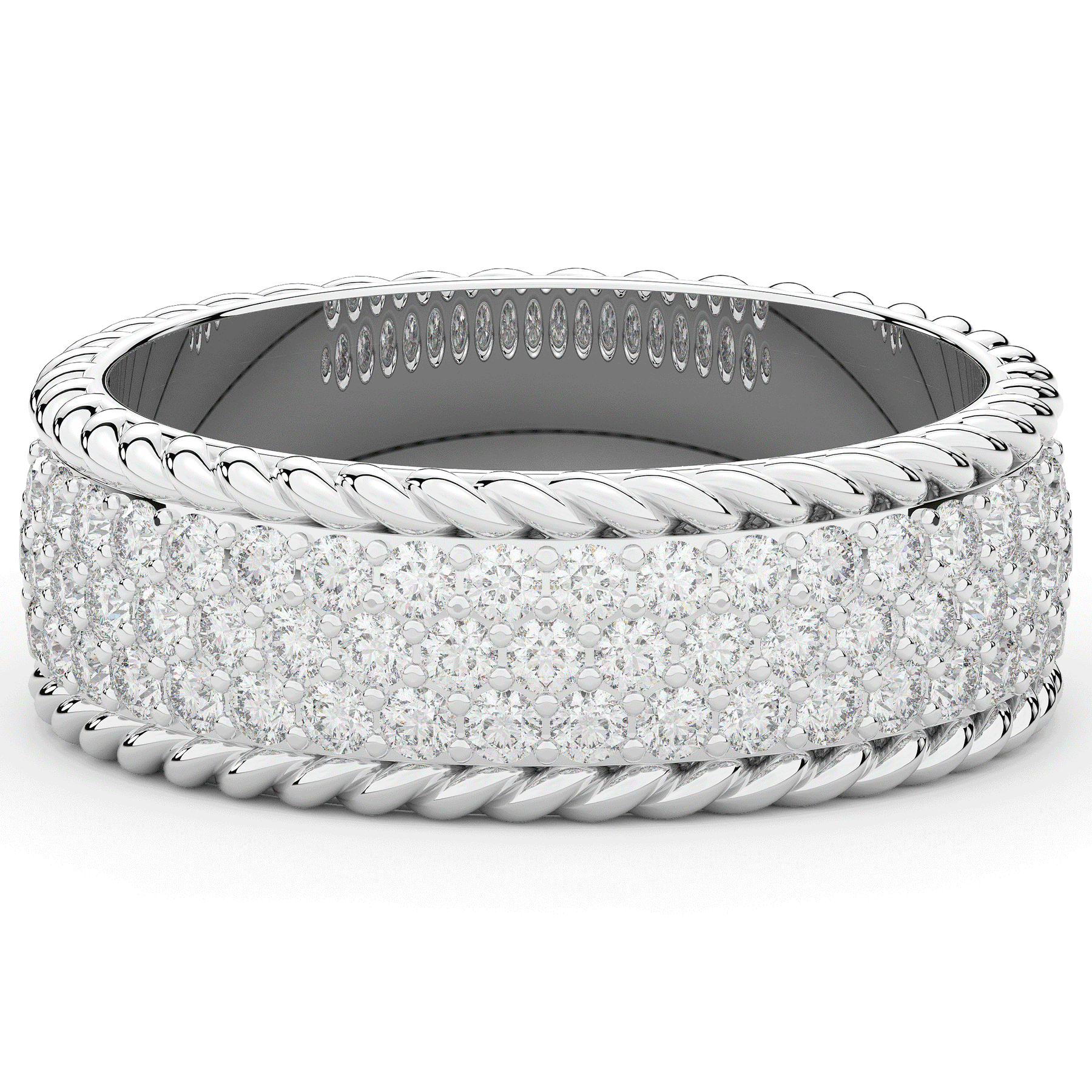 This beautiful band features 3 rows of bright round lab grown diamonds as well as a twist accent on the outside of the band, making for a one of a kind ring. This ring is available in 14k white, yellow or rose gold, 18k yellow gold, as well as platinum.