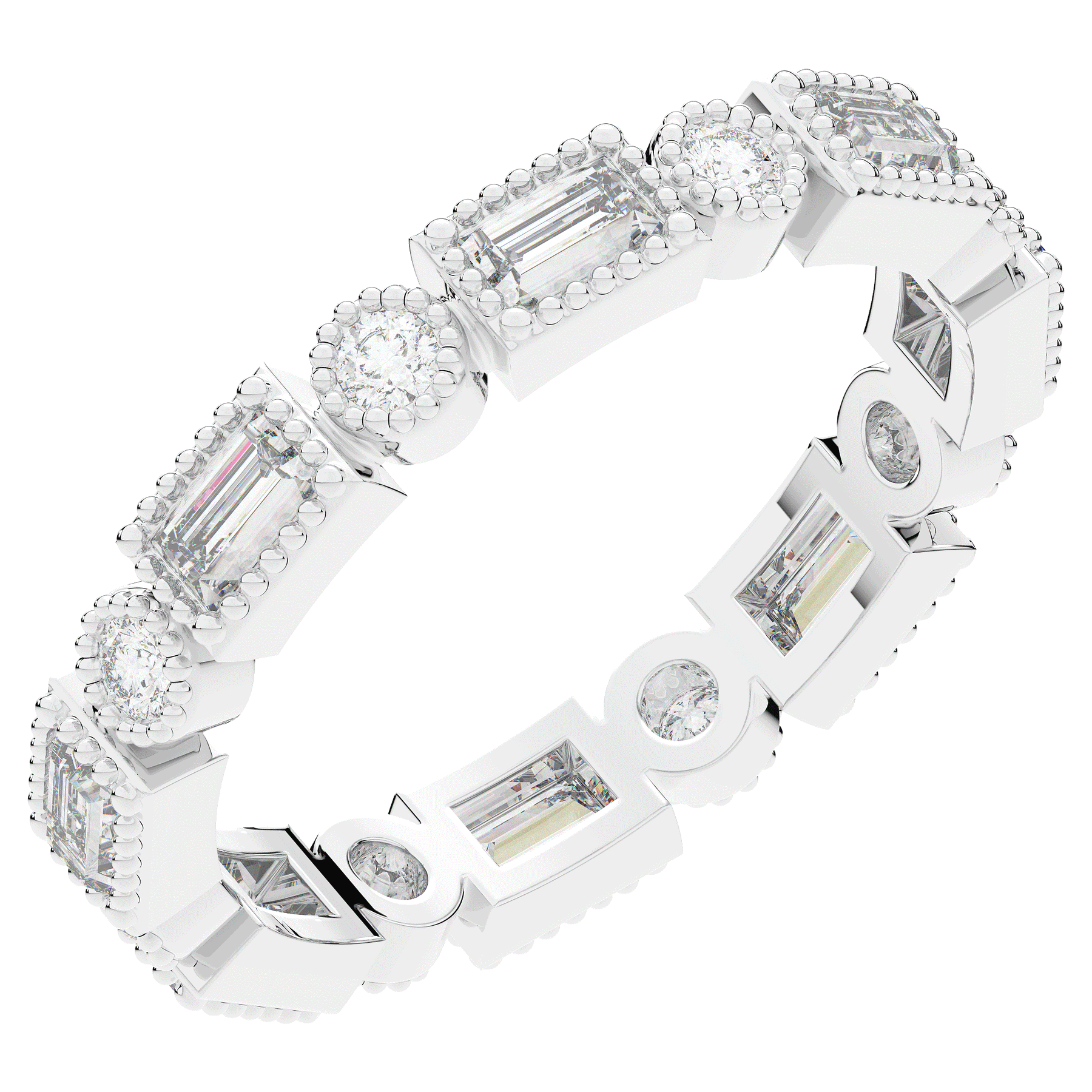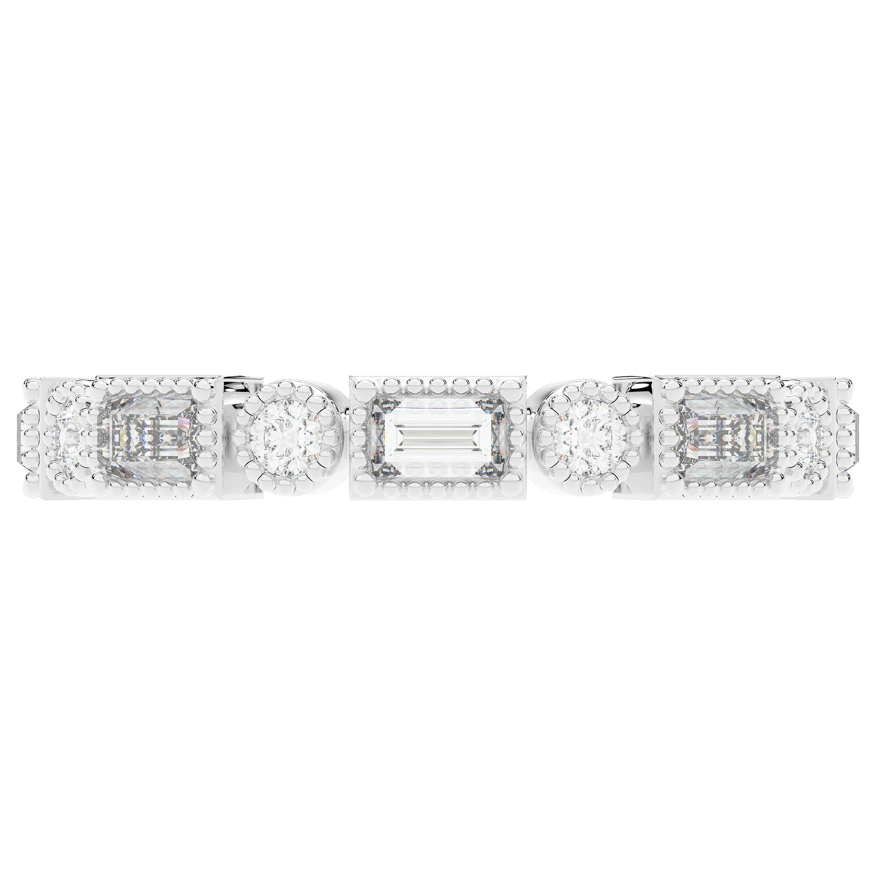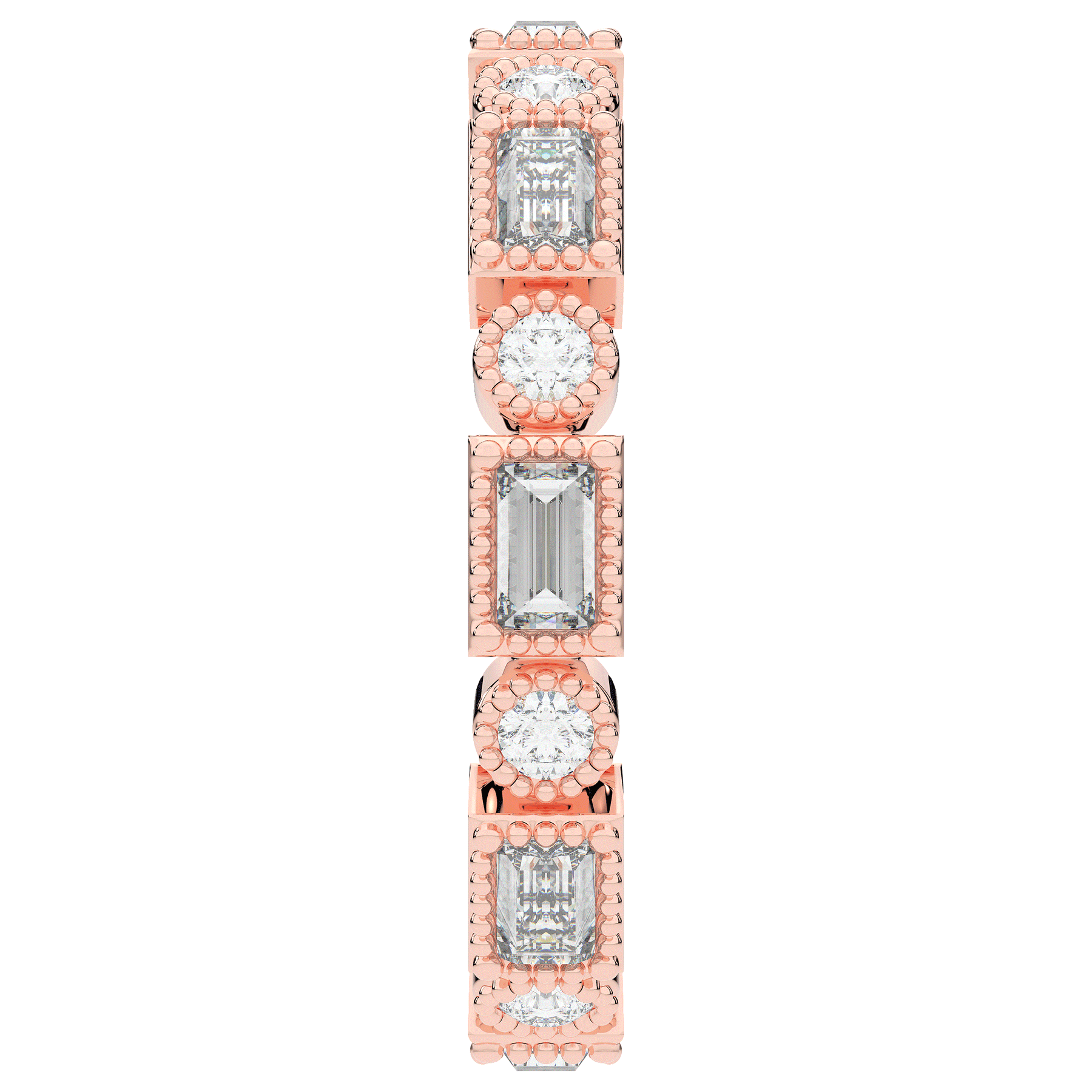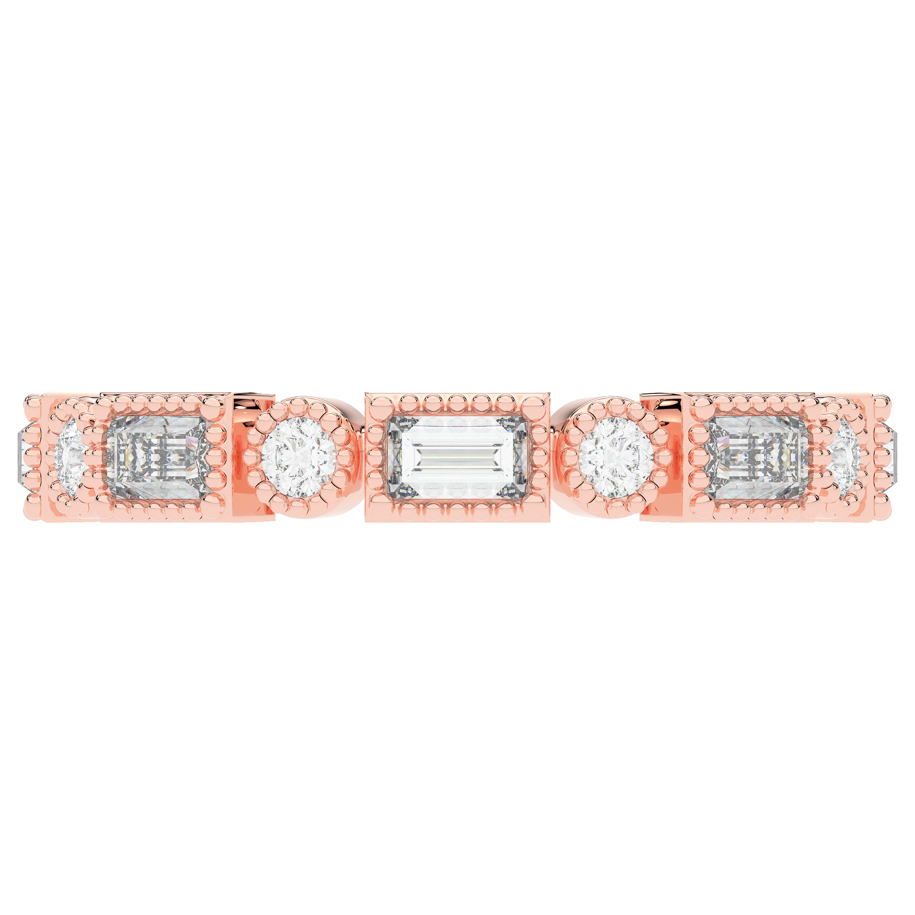 This beautiful band features alternating baguette and round lab diamonds with milgrain surrounding each setting in an eternity style. This ring is available in 14k white, yellow or rose gold, 18k yellow gold, as well as platinum.