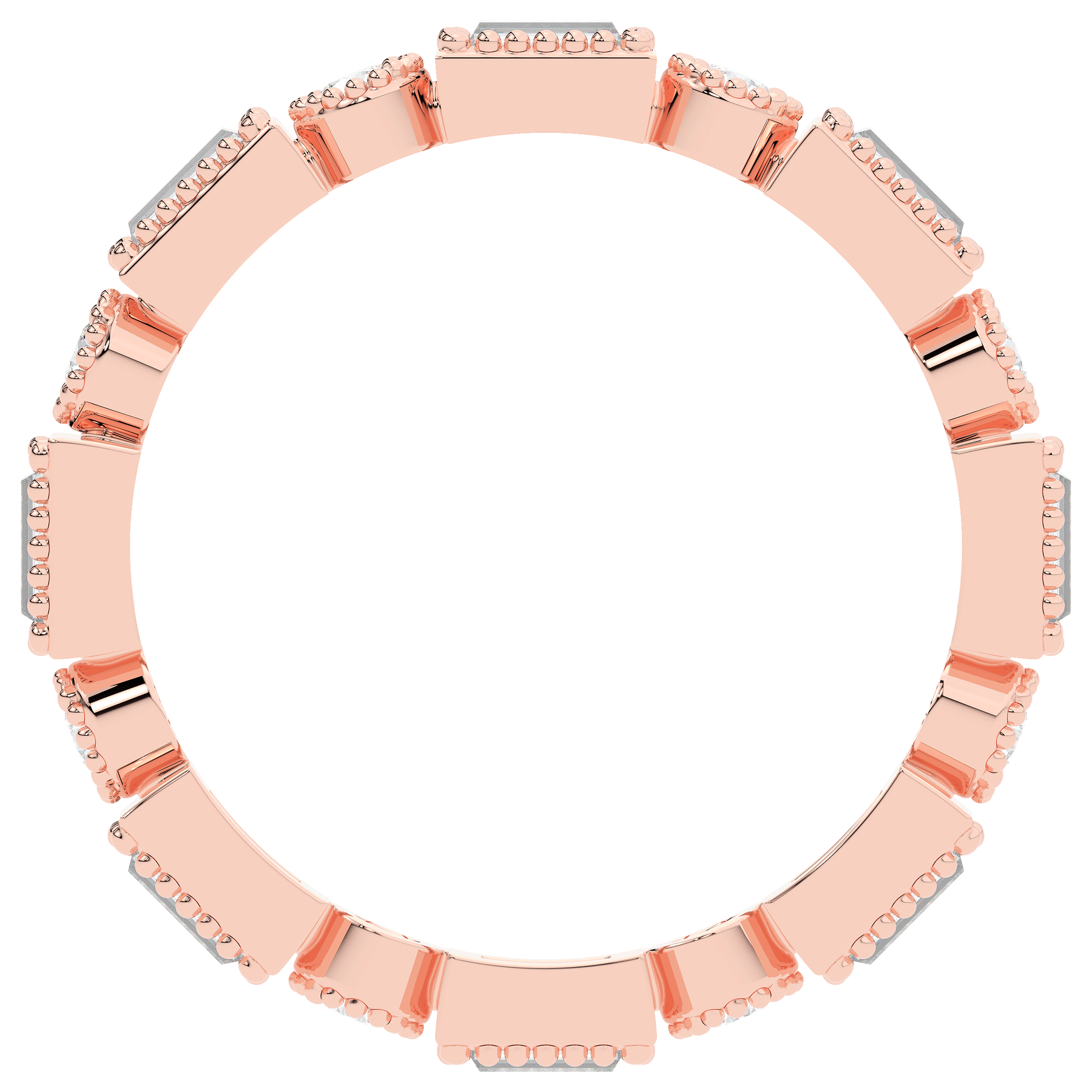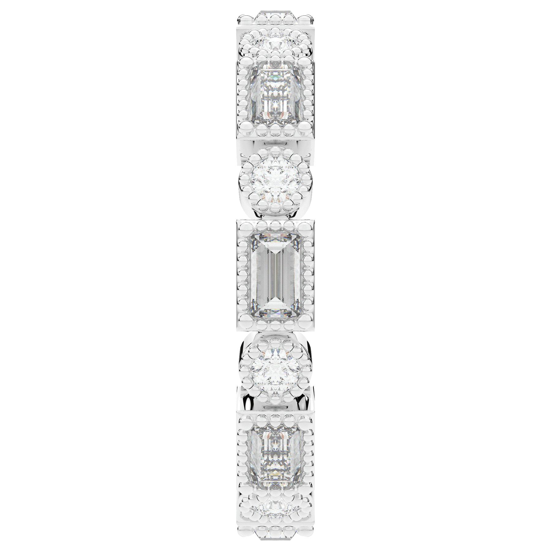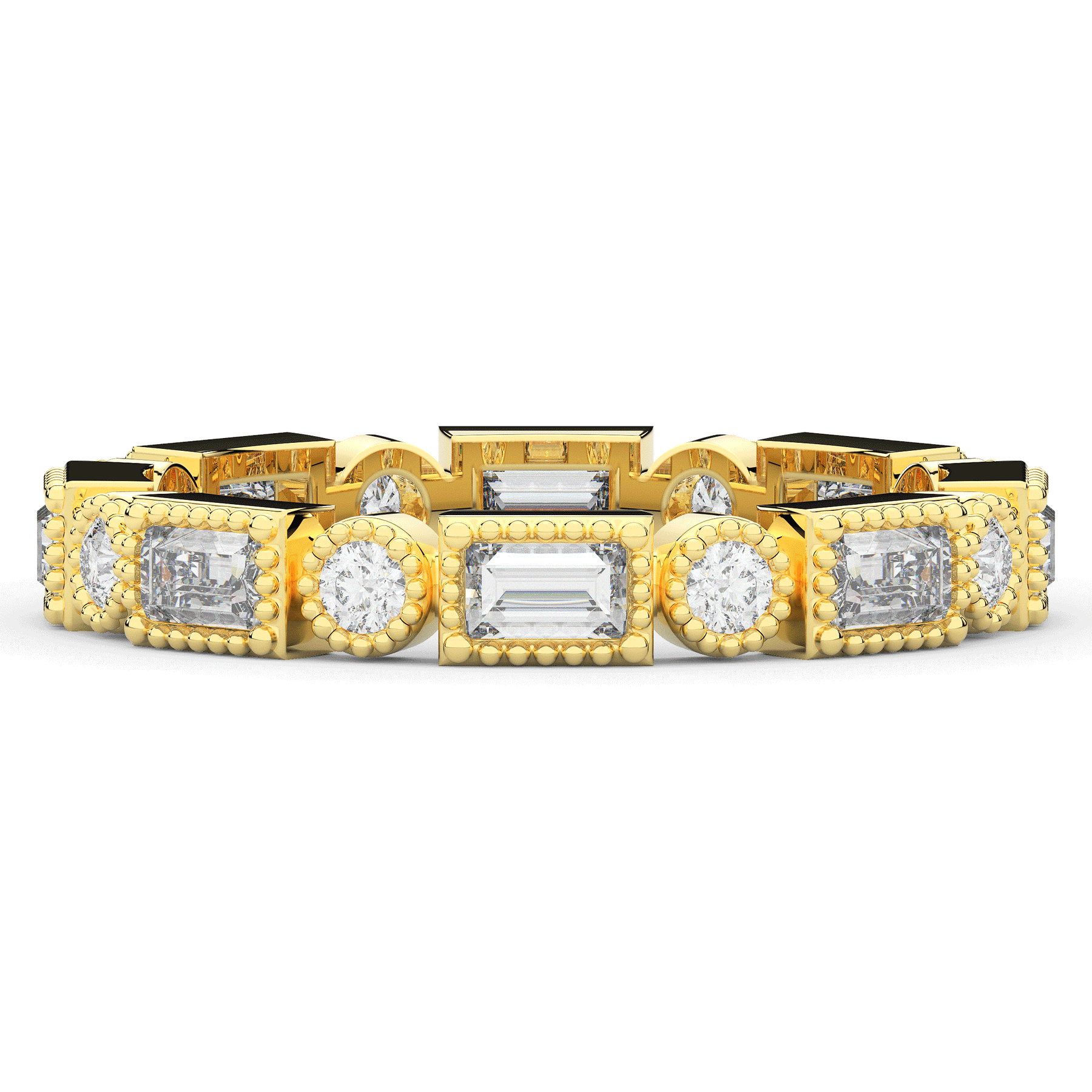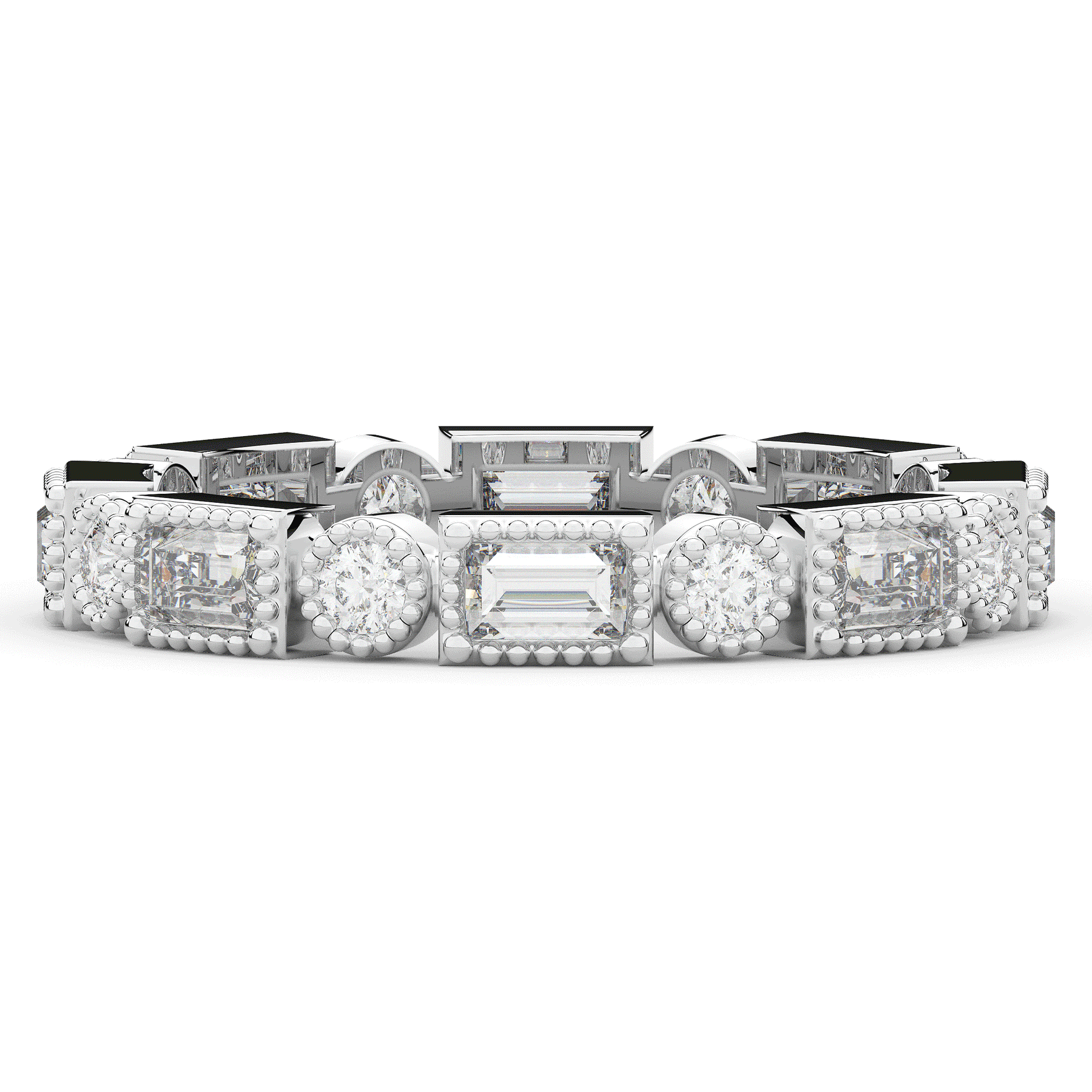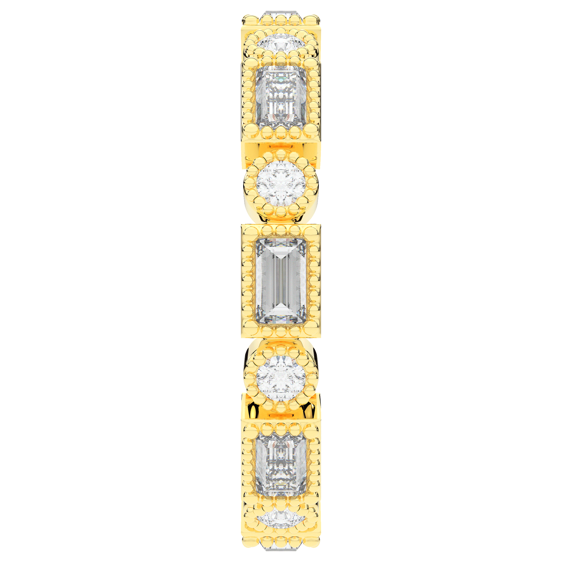 This beautiful band features alternating baguette and round lab diamonds with milgrain surrounding each setting in an eternity style. This ring is available in 14k white, yellow or rose gold, 18k yellow gold, as well as platinum.