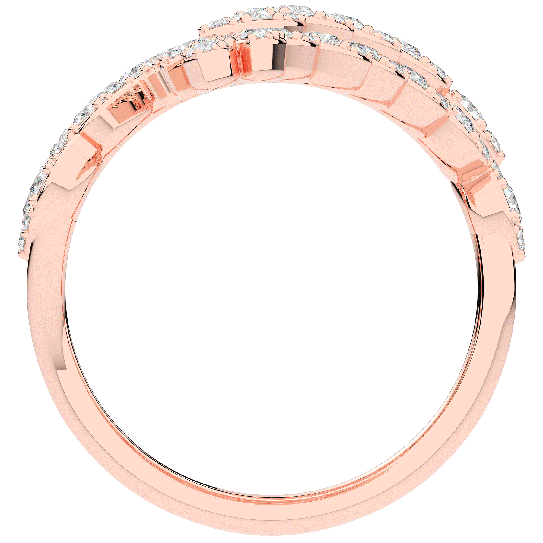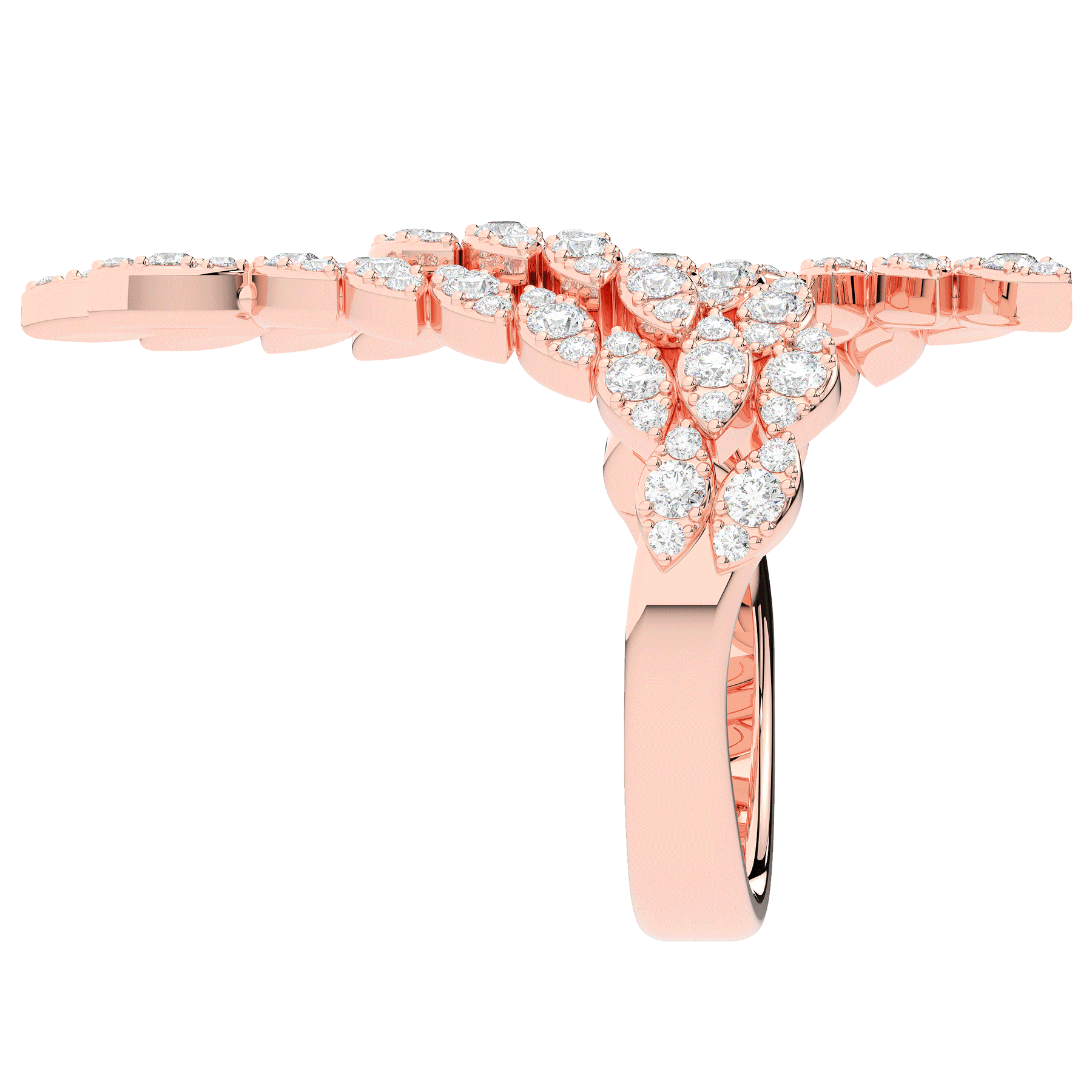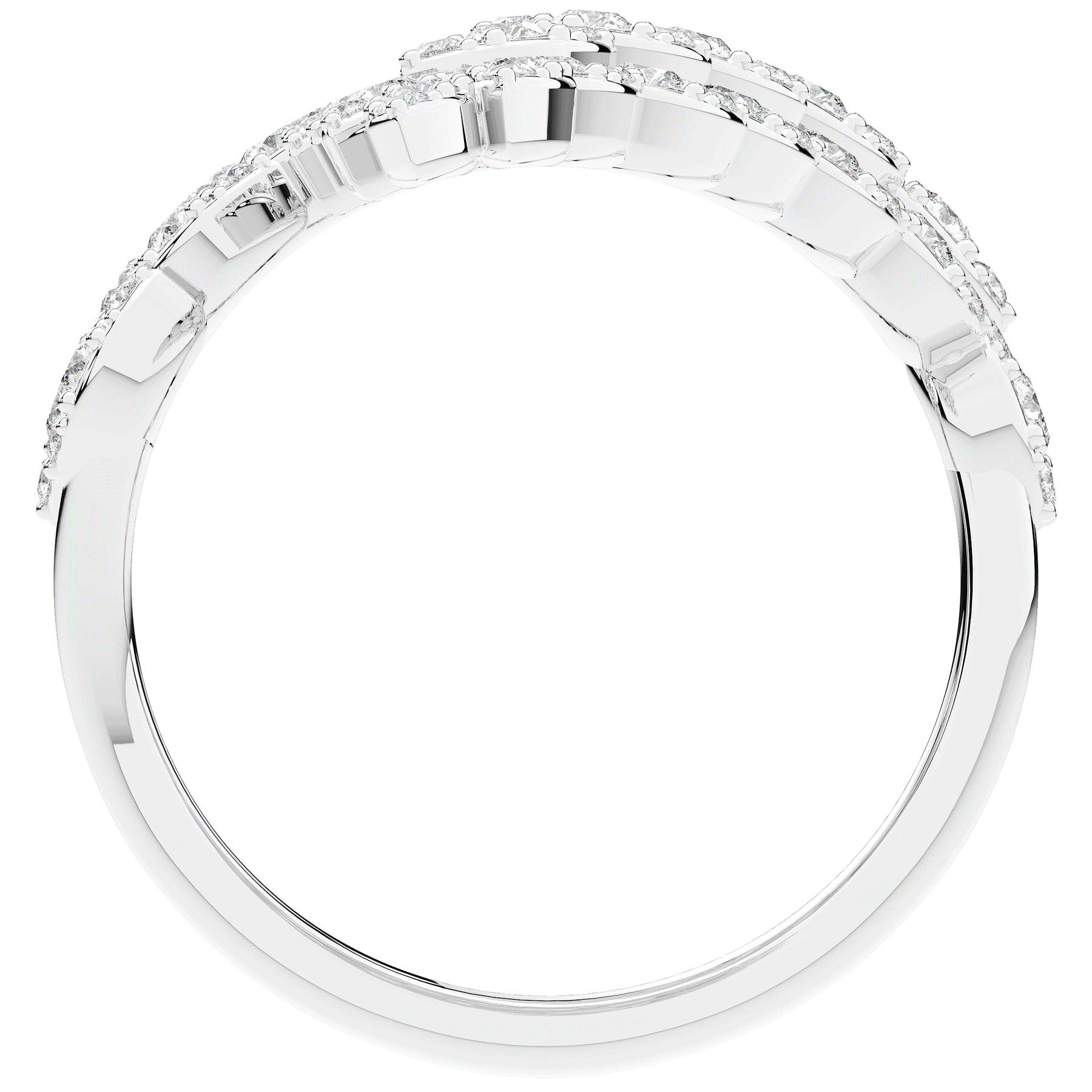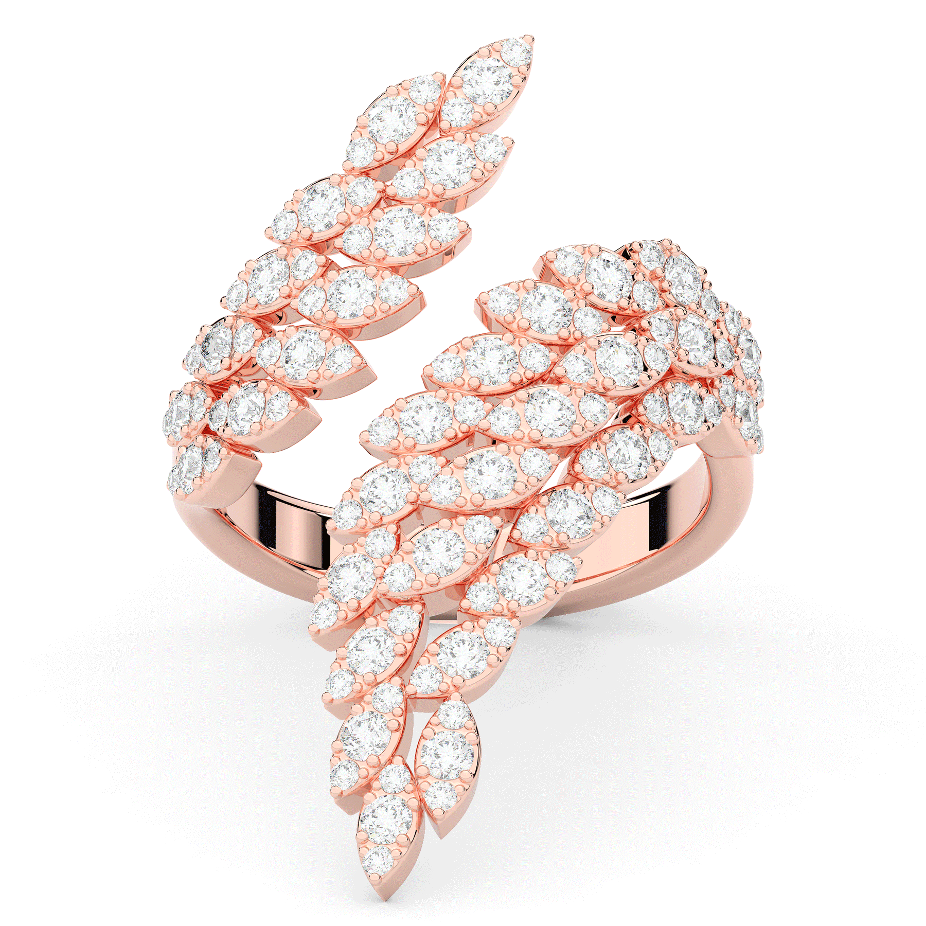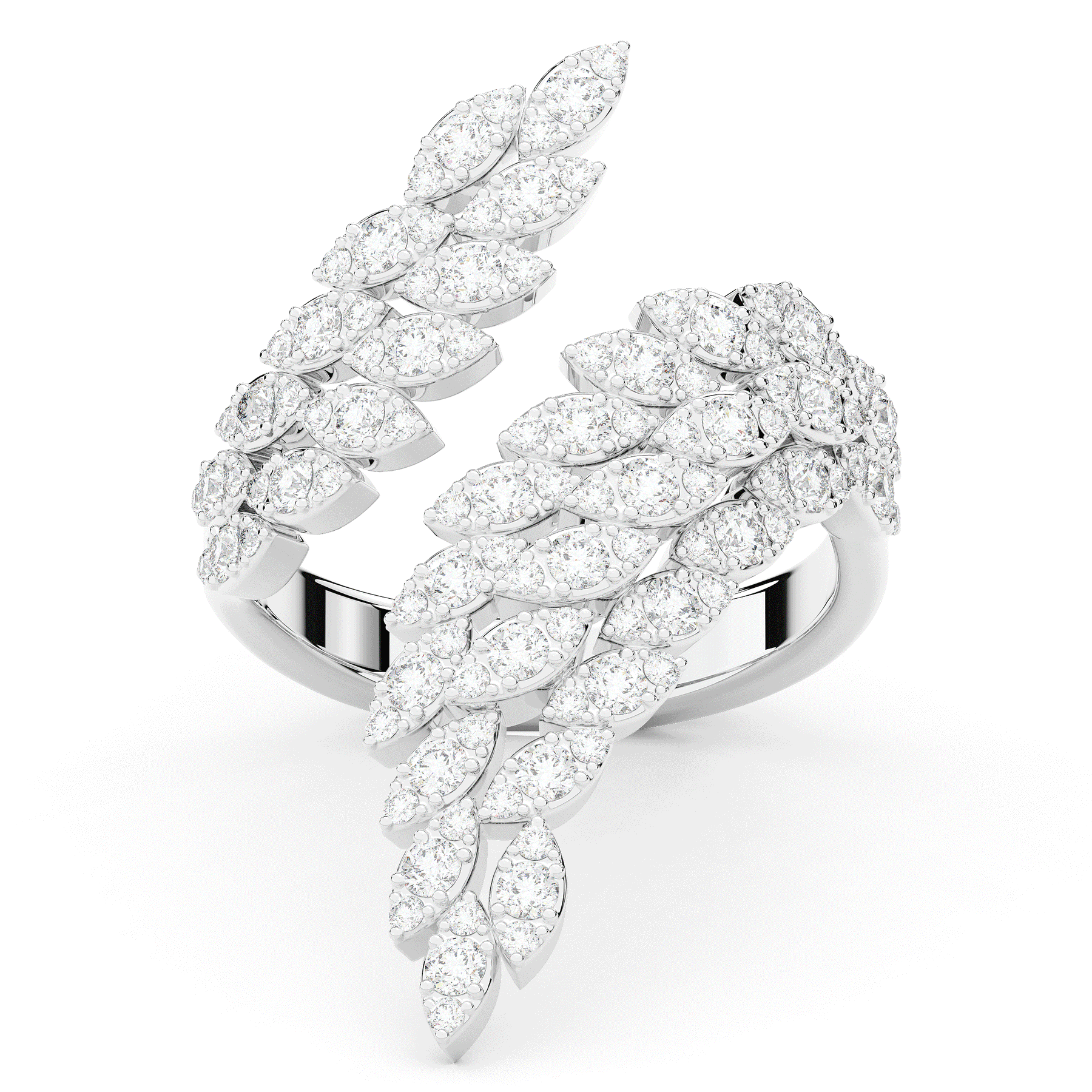 This one of a kind band features a stylized feather bypass ring, with each feather having a cluster of 3 bright round lab grown diamonds. This ring is available in 14k white, yellow or rose gold, 18k yellow gold, as well as platinum.