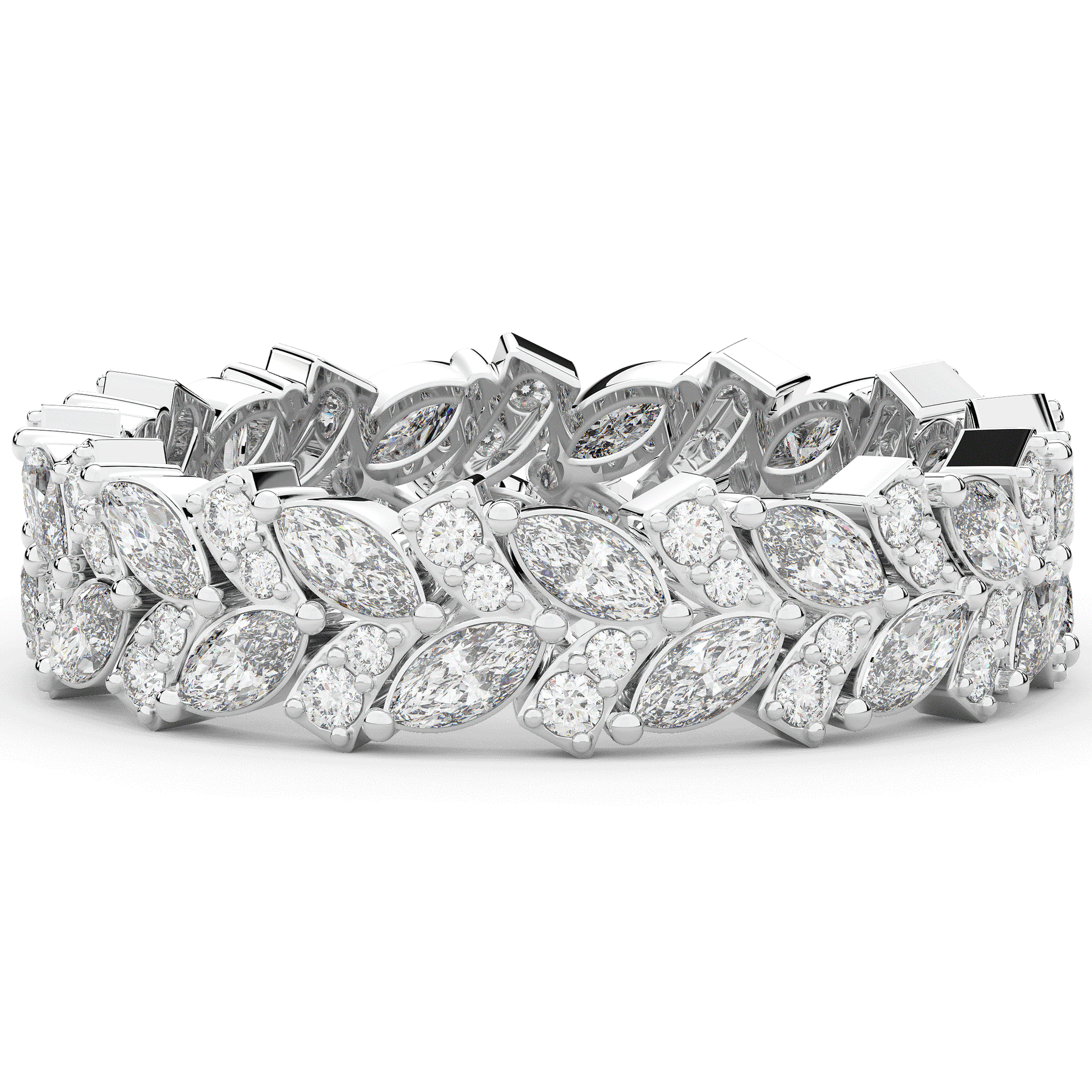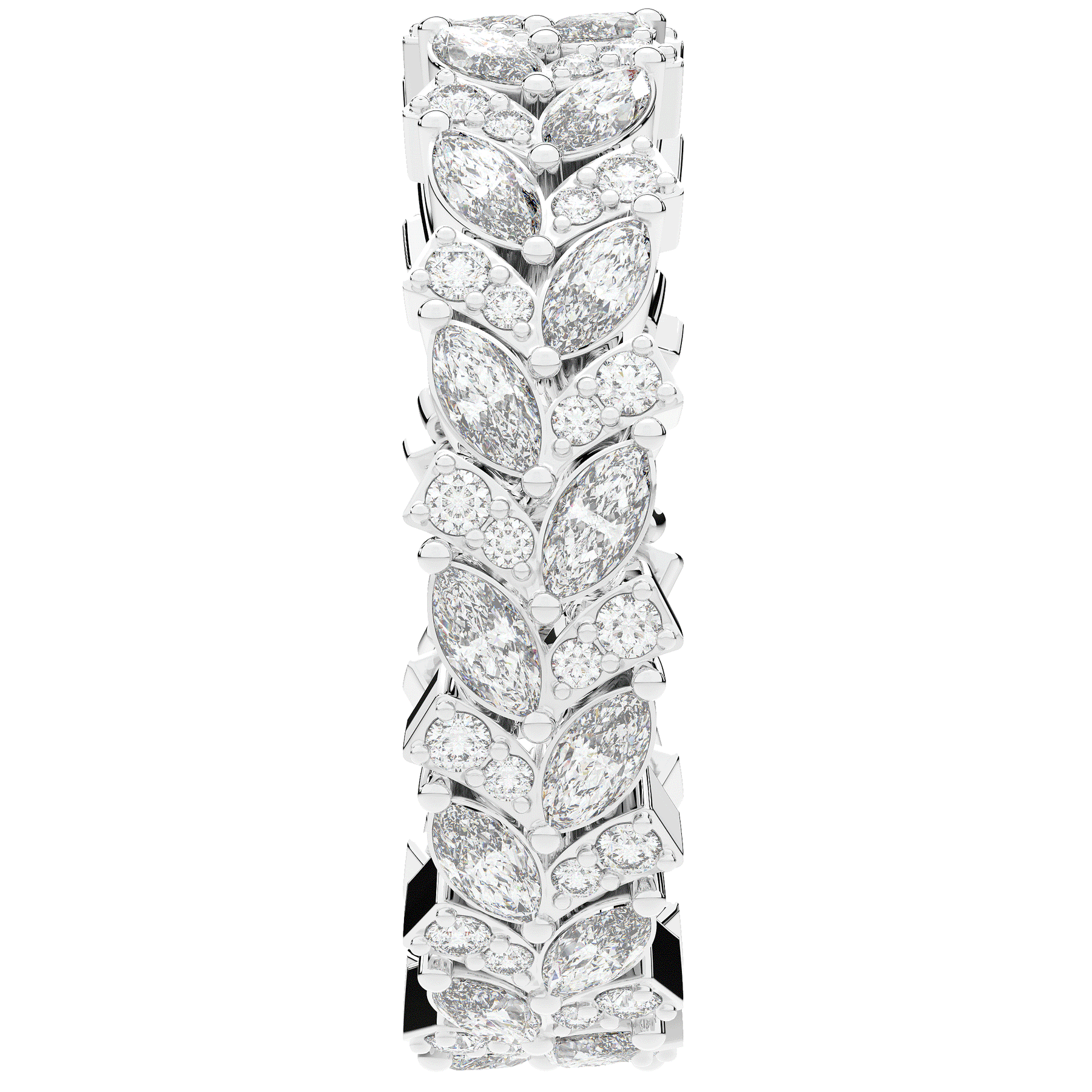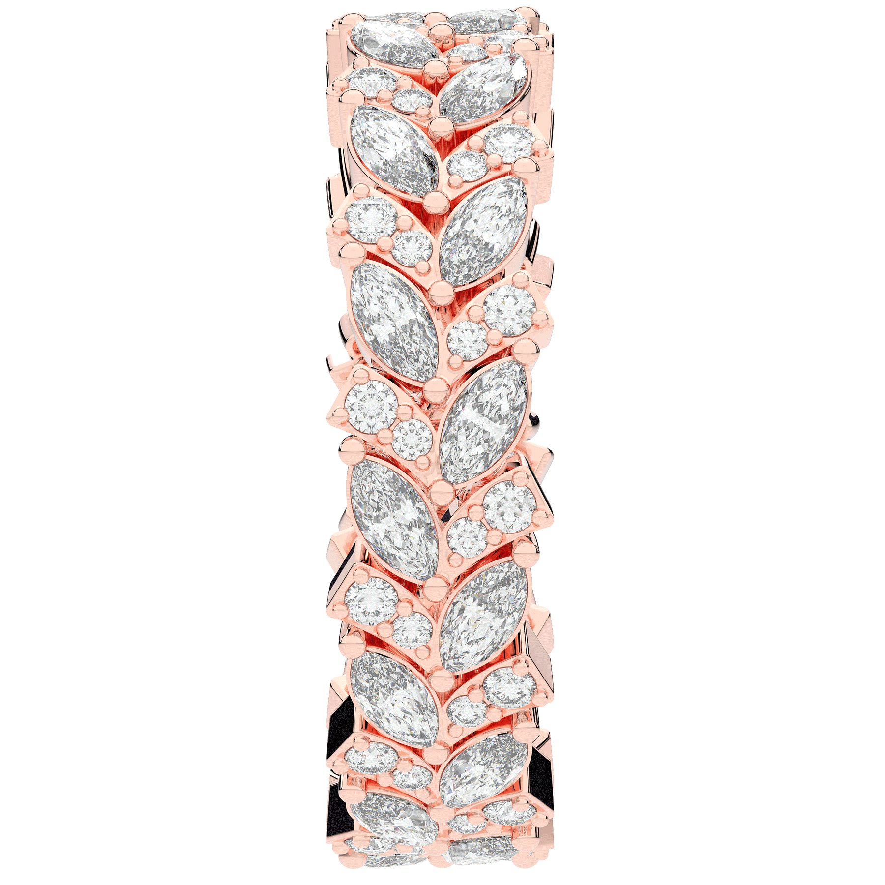 This stunning ring features lab grown marquise and round diamonds in an alternating left right leaf pattern. This ring is available in 14k white, yellow or rose gold, 18k yellow gold, as well as platinum.