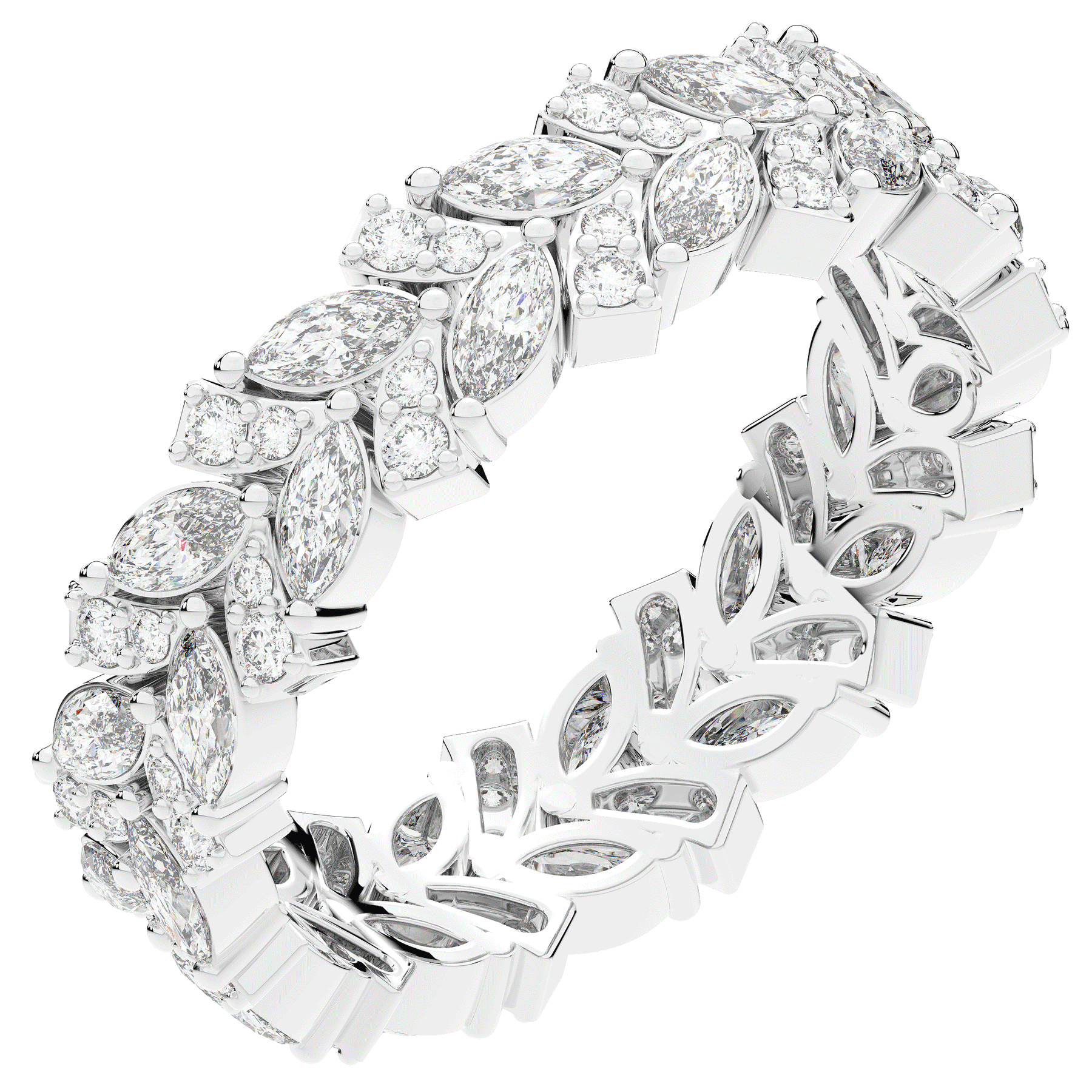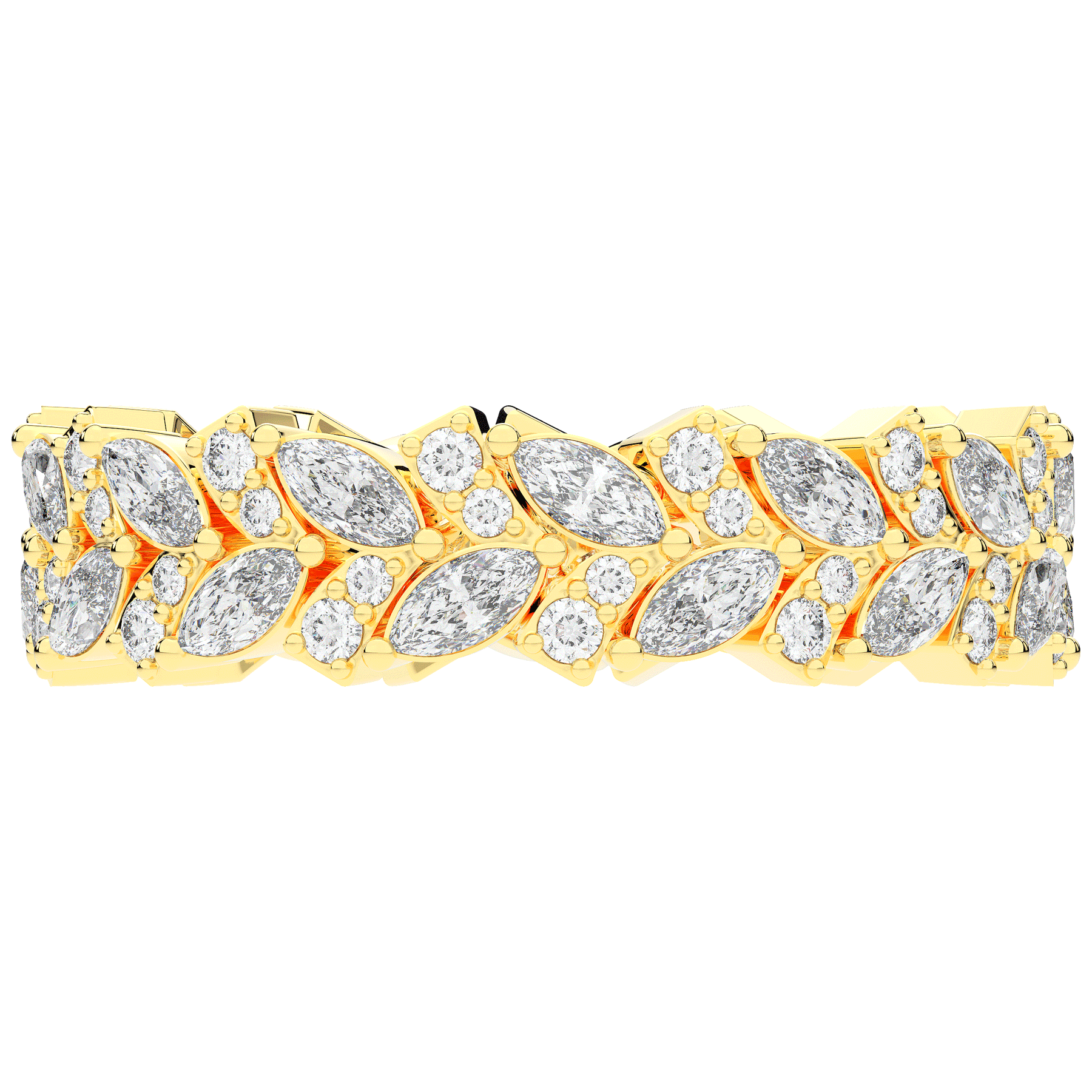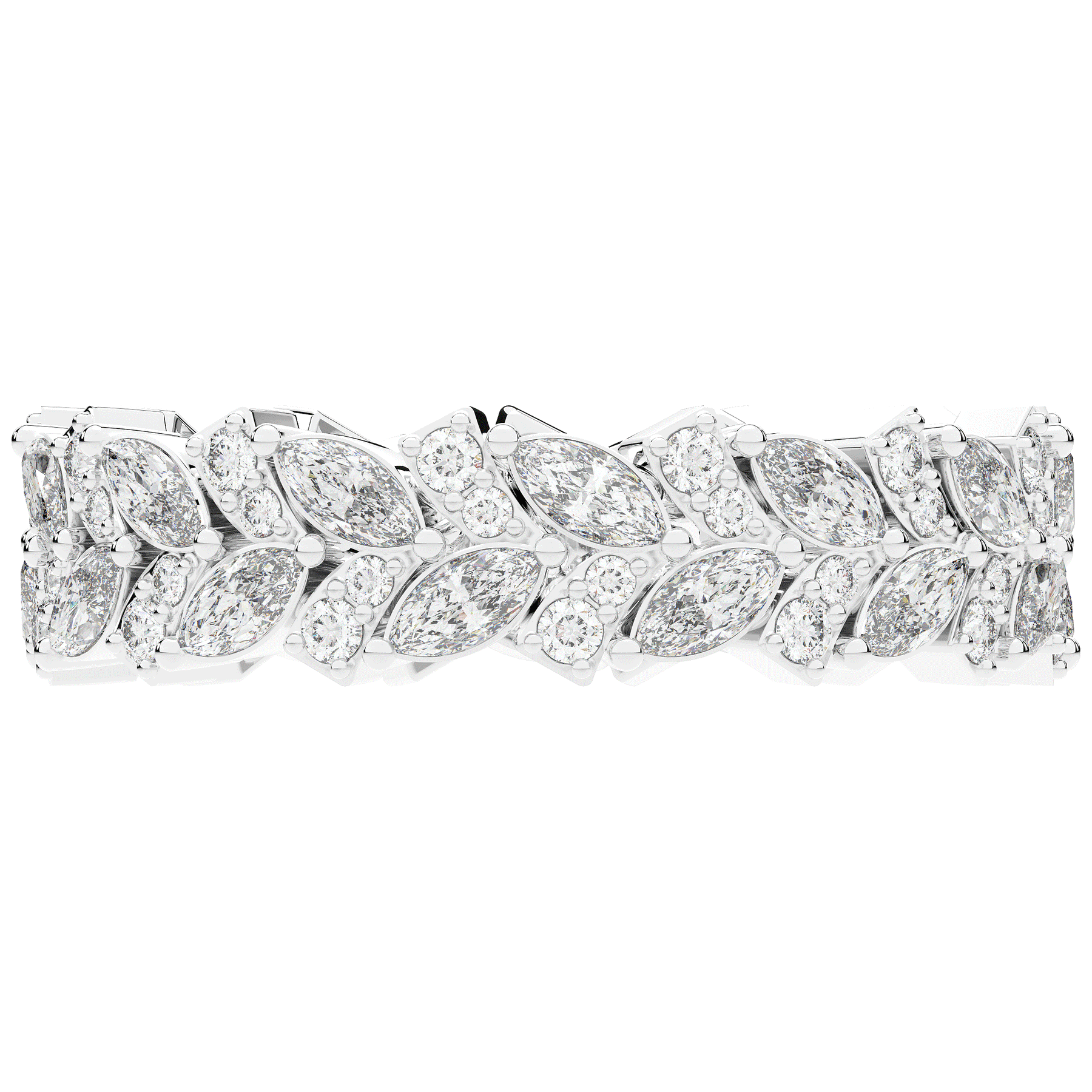 This stunning ring features lab grown marquise and round diamonds in an alternating left right leaf pattern. This ring is available in 14k white, yellow or rose gold, 18k yellow gold, as well as platinum.