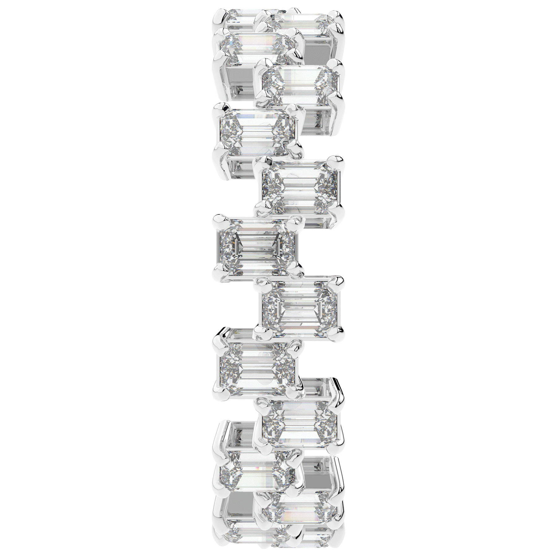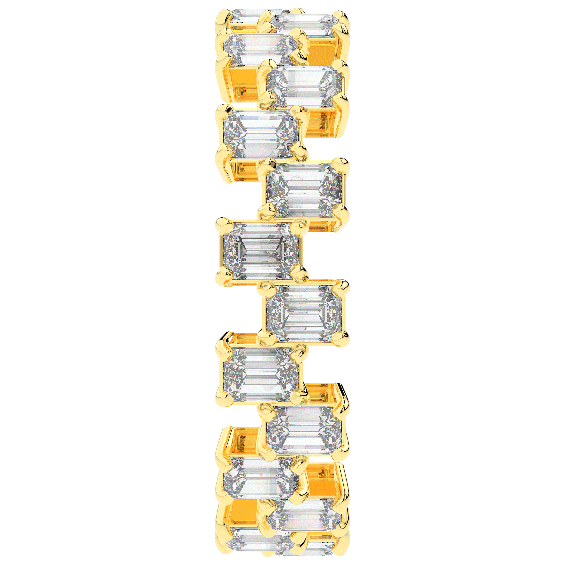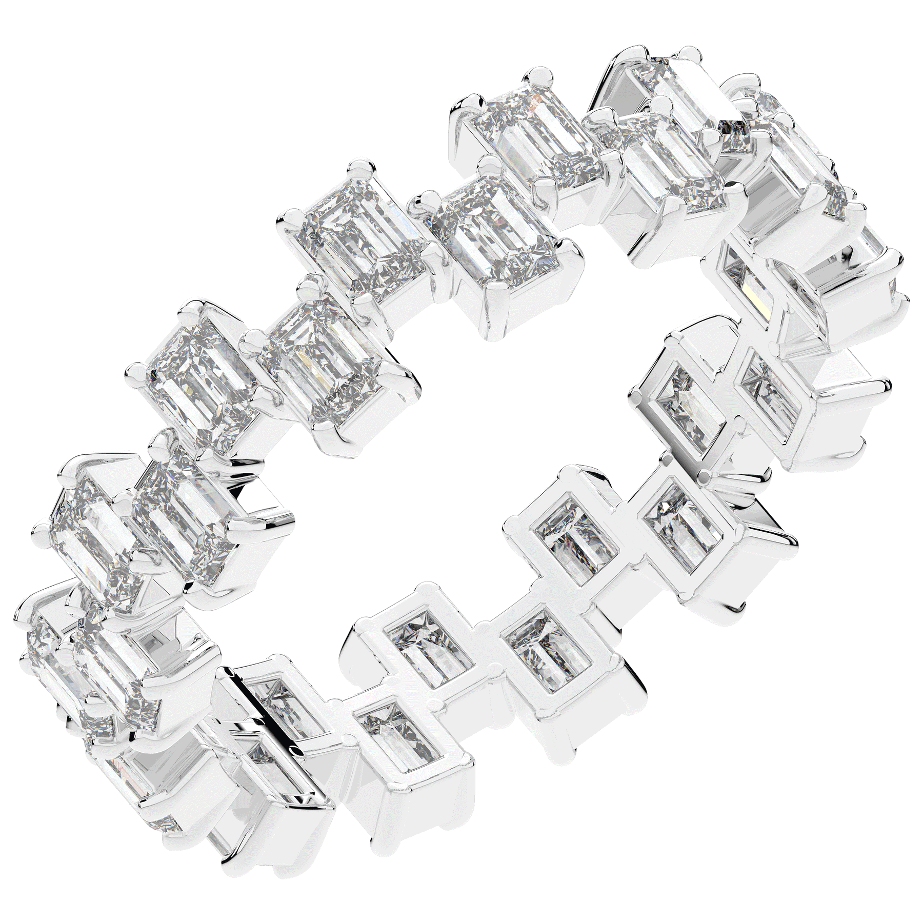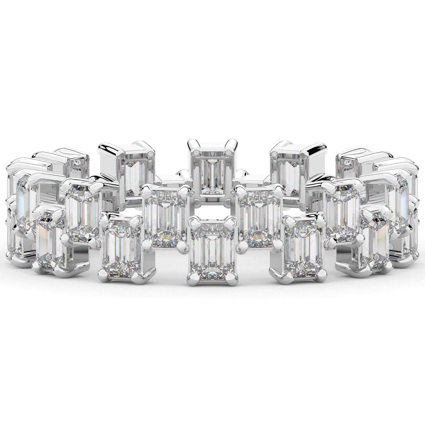 This stunning ring features large, bright emerald cut lab diamonds in an offset alternating pattern in an eternity style. This ring is available in 14k white, yellow or rose gold, 18k yellow gold, as well as platinum.