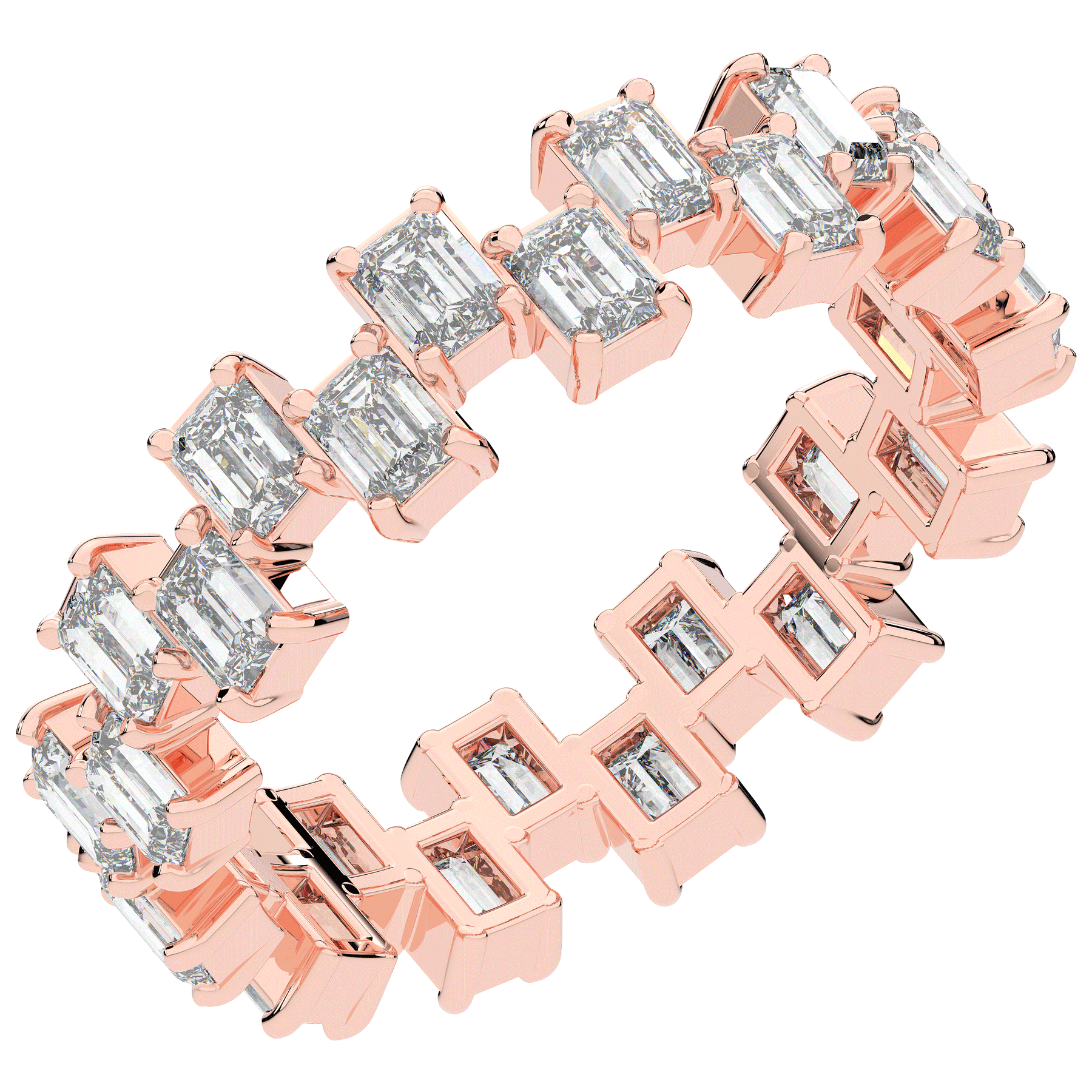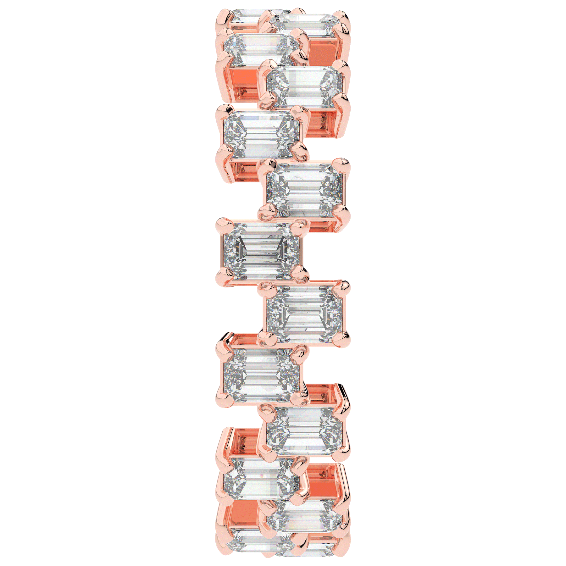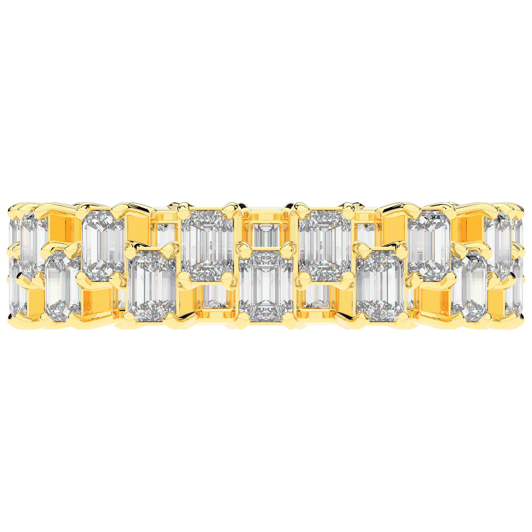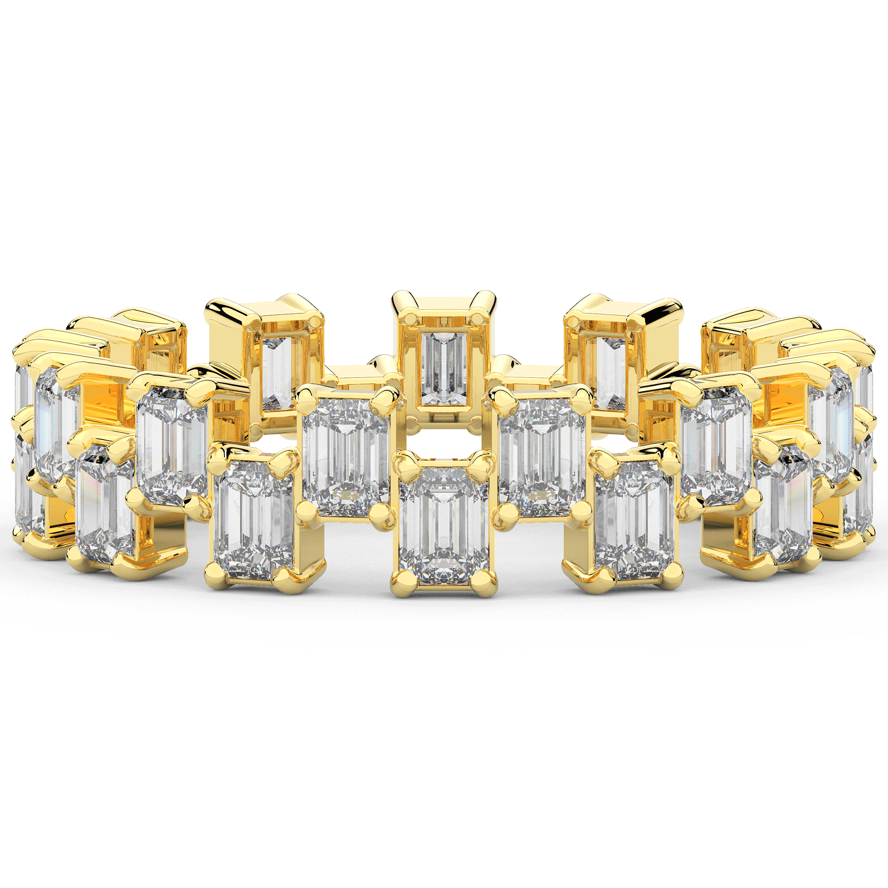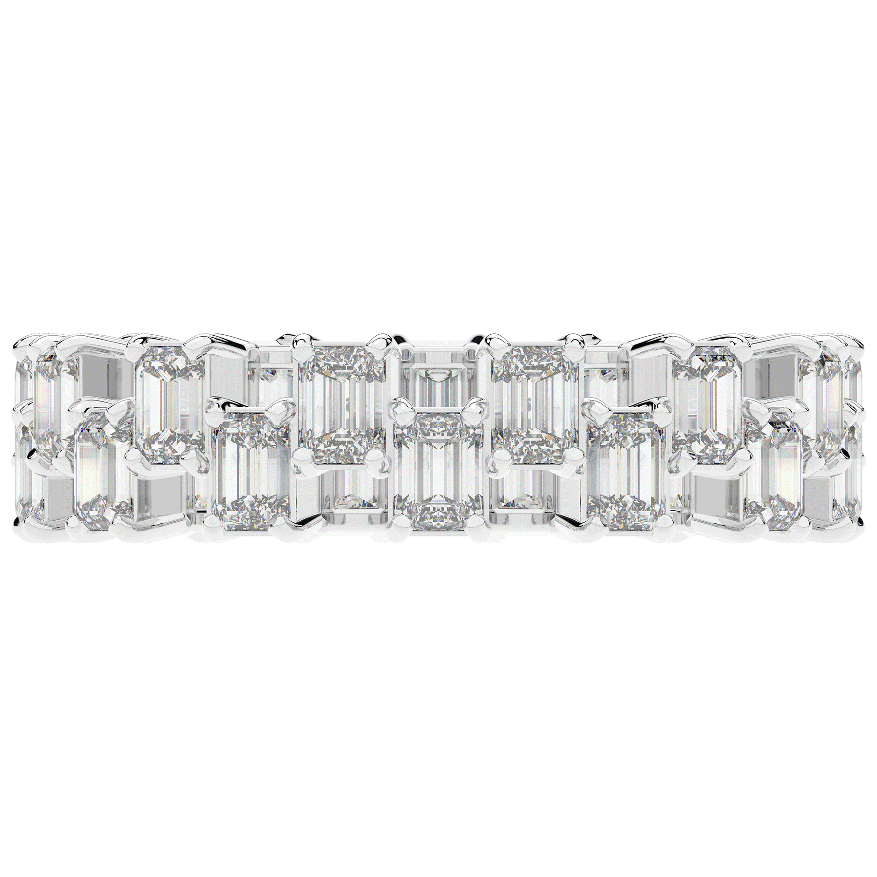 This stunning ring features large, bright emerald cut lab diamonds in an offset alternating pattern in an eternity style. This ring is available in 14k white, yellow or rose gold, 18k yellow gold, as well as platinum.