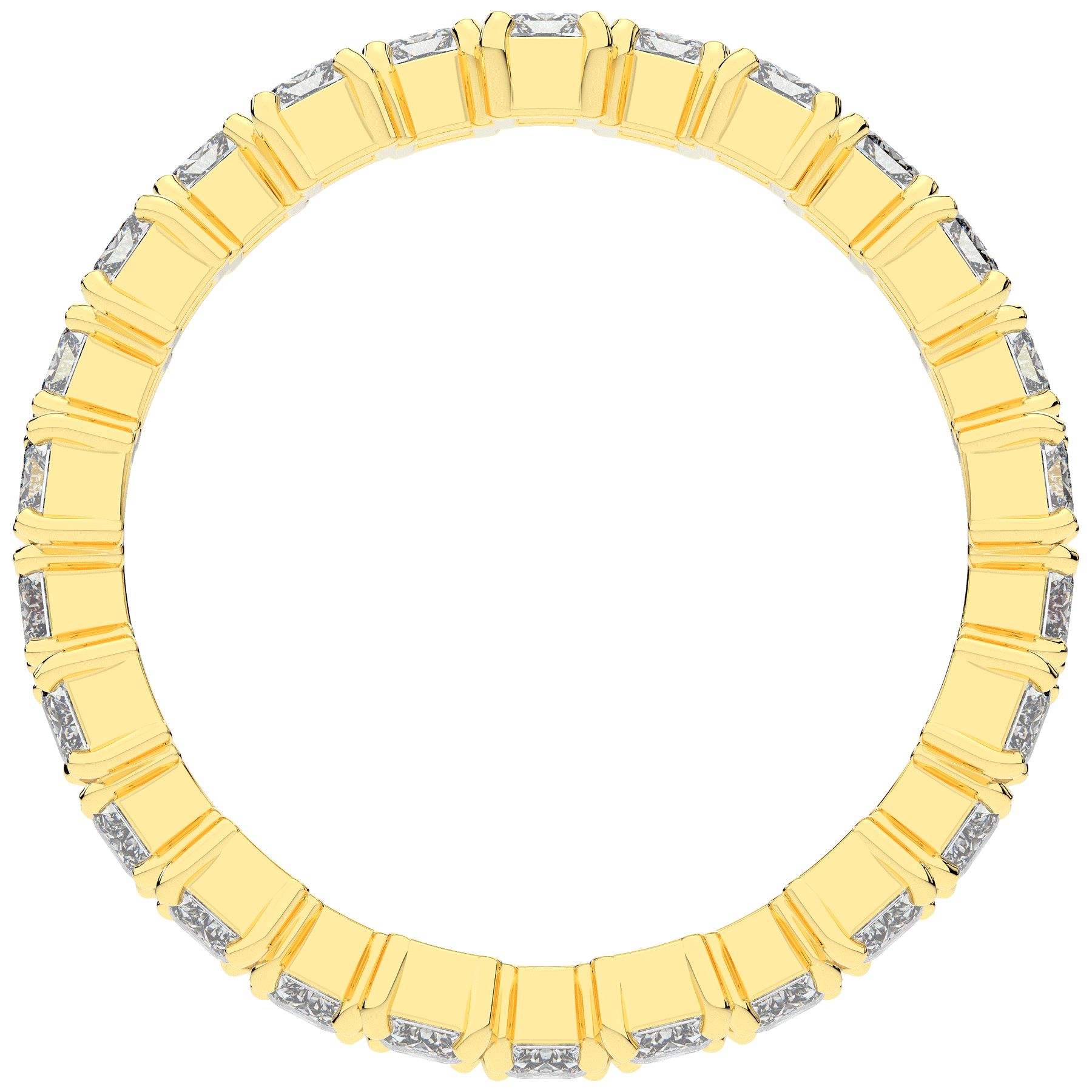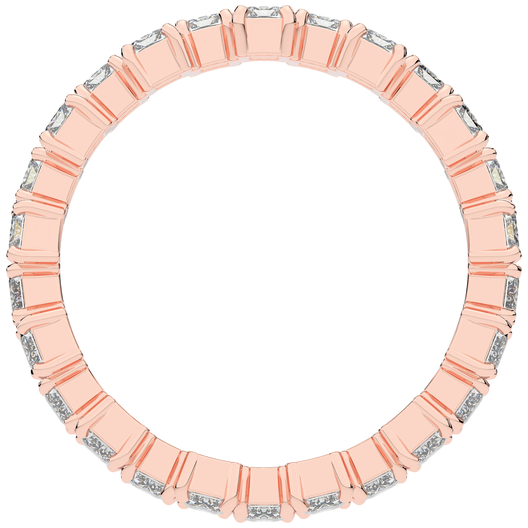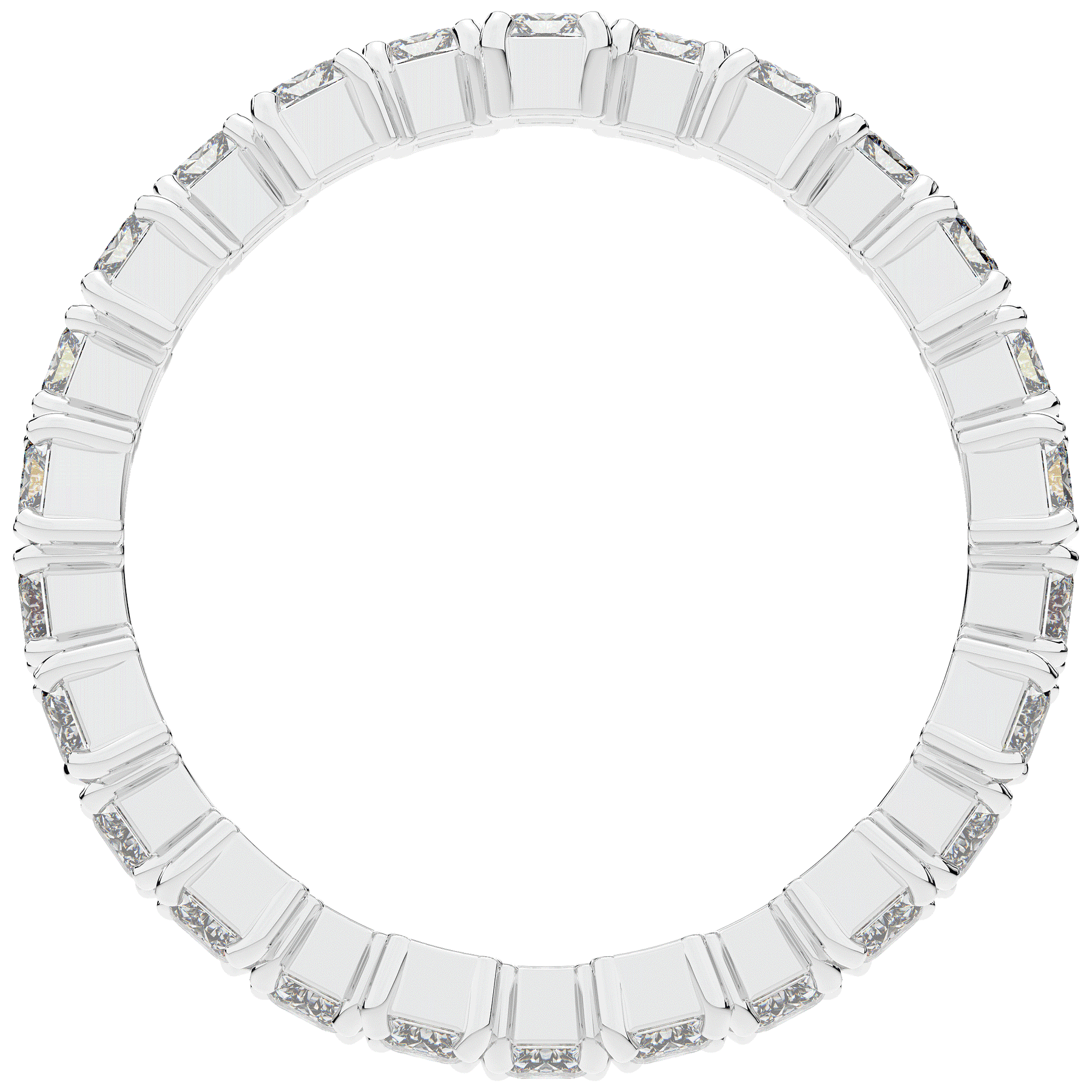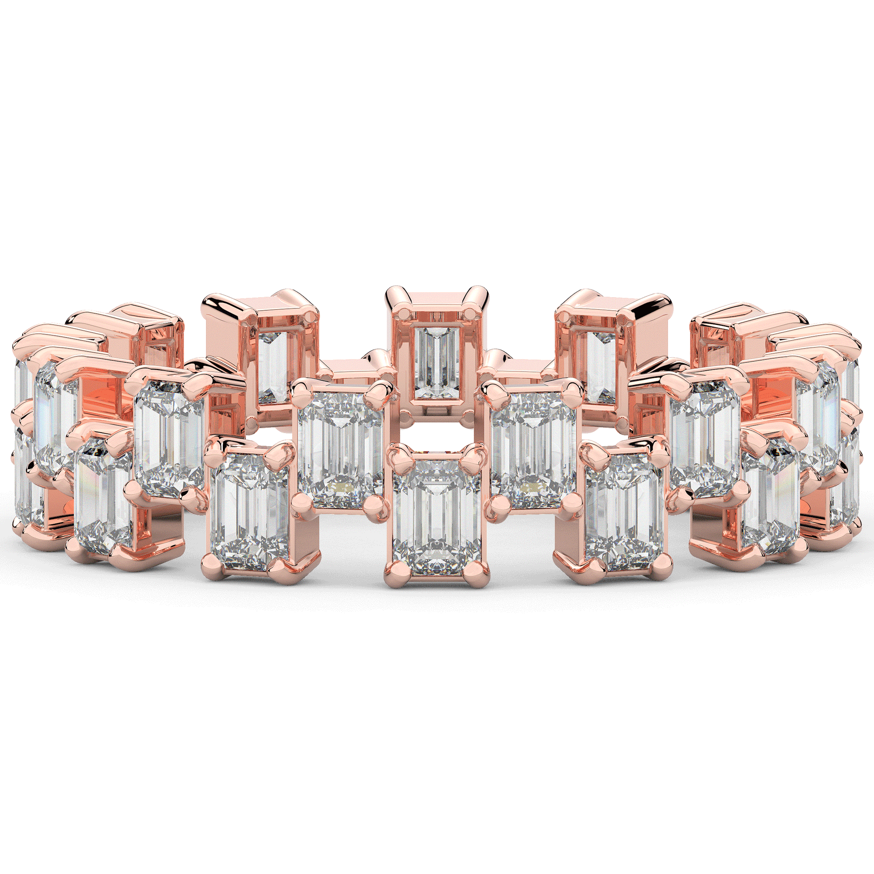 This stunning ring features large, bright emerald cut lab diamonds in an offset alternating pattern in an eternity style. This ring is available in 14k white, yellow or rose gold, 18k yellow gold, as well as platinum.