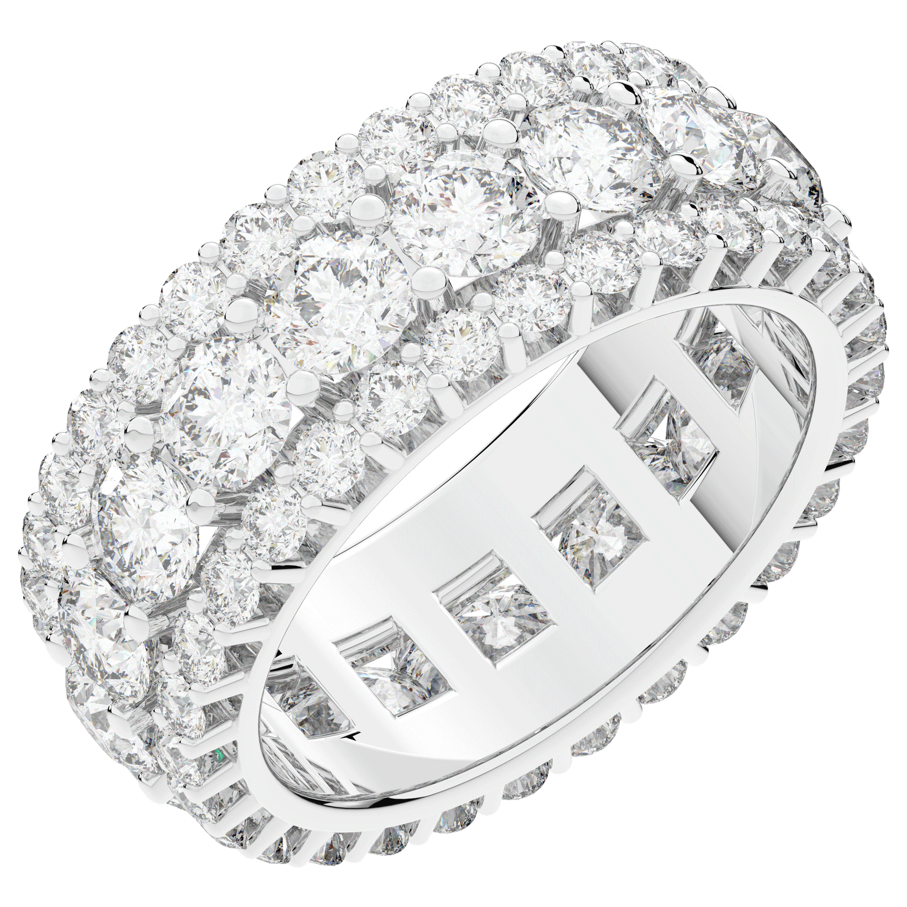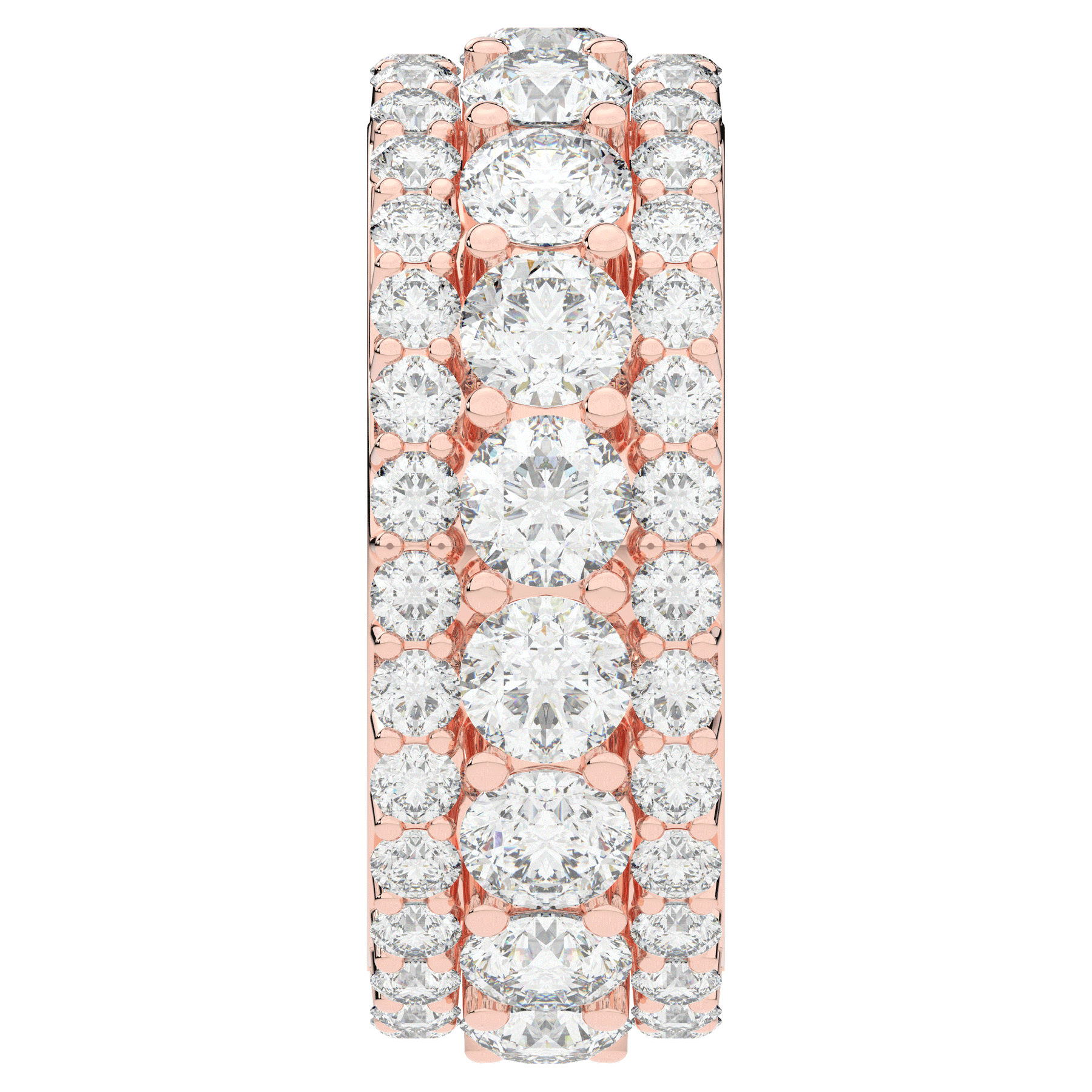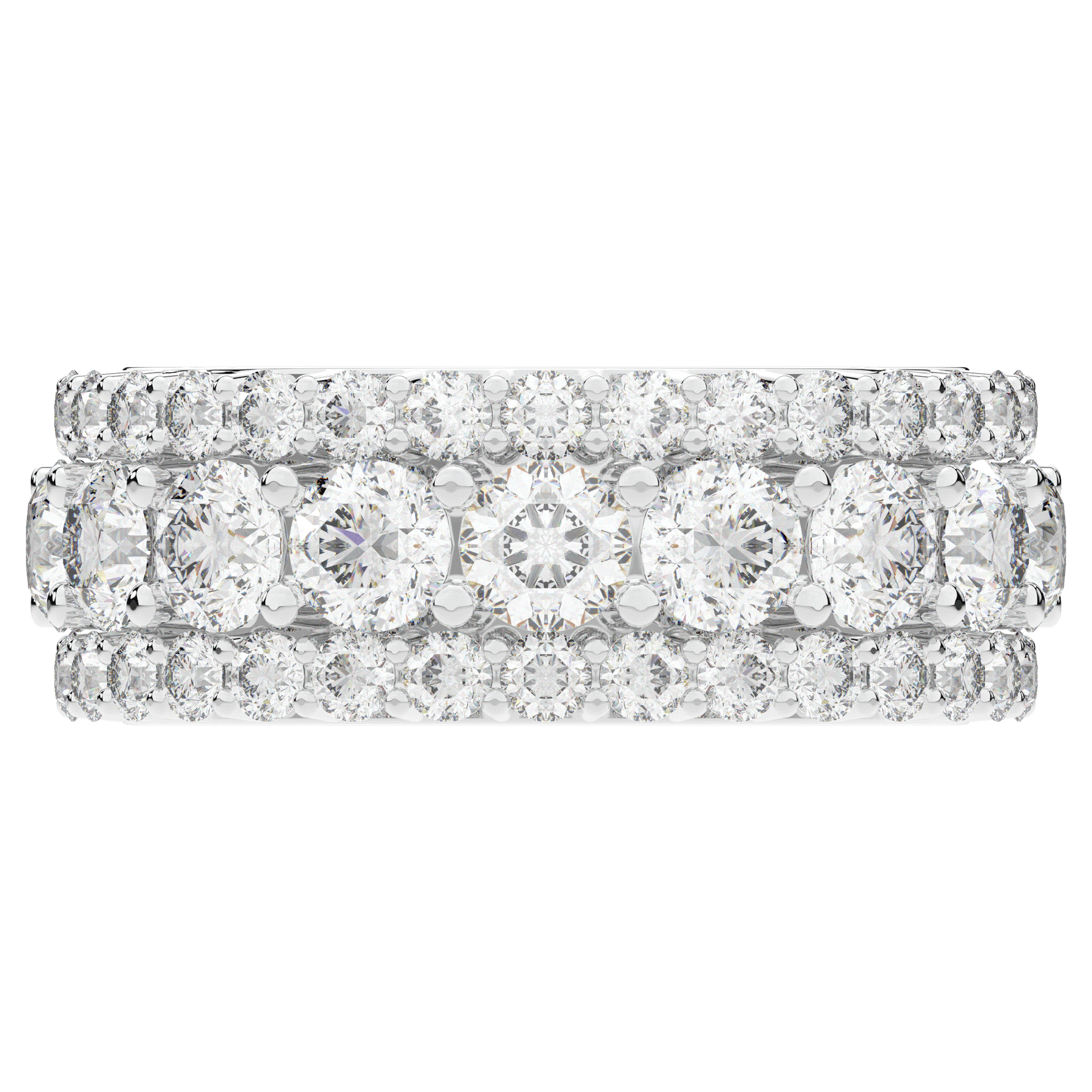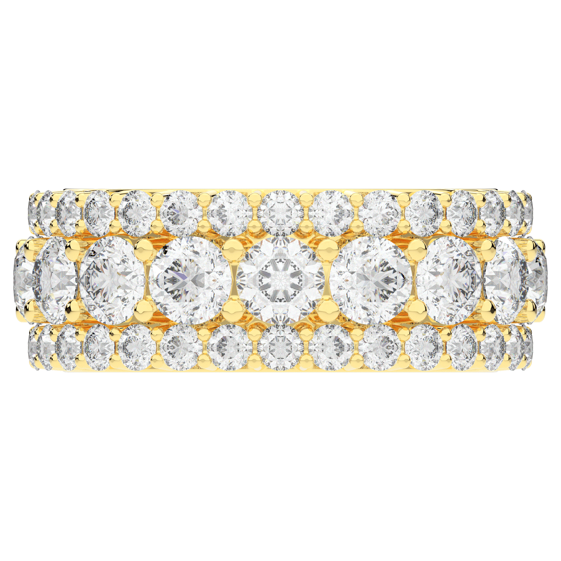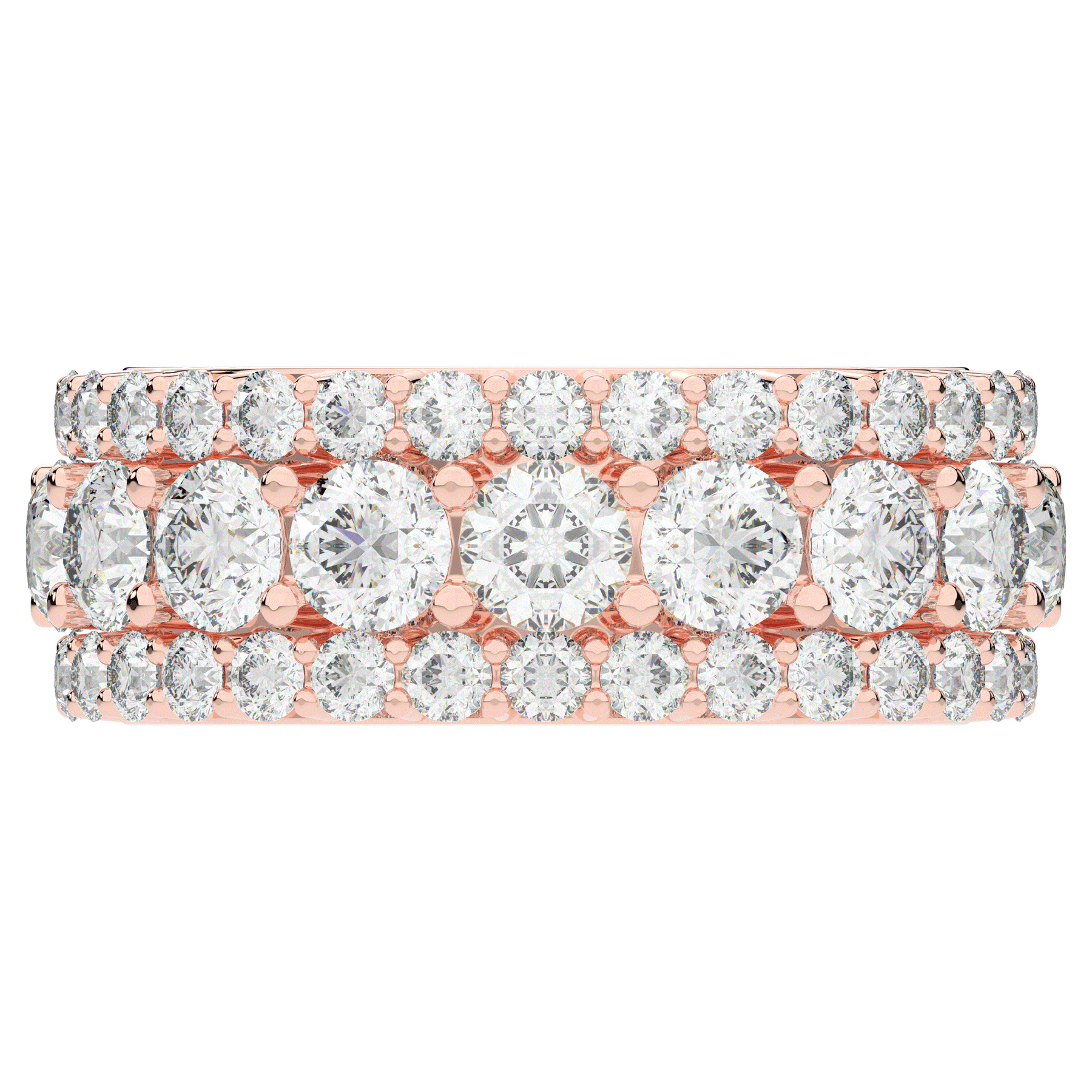 This band features a row of large round lab grown diamonds flanked on either side by a band of smaller round lab grown diamonds, with all of them set so that the diamonds receive as much light as possible. This ring is available in 14k white, yellow or rose gold, 18k yellow gold, as well as platinum.