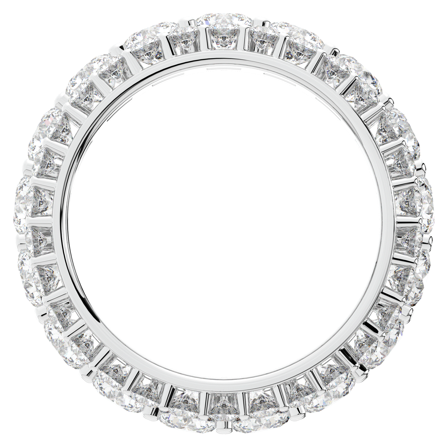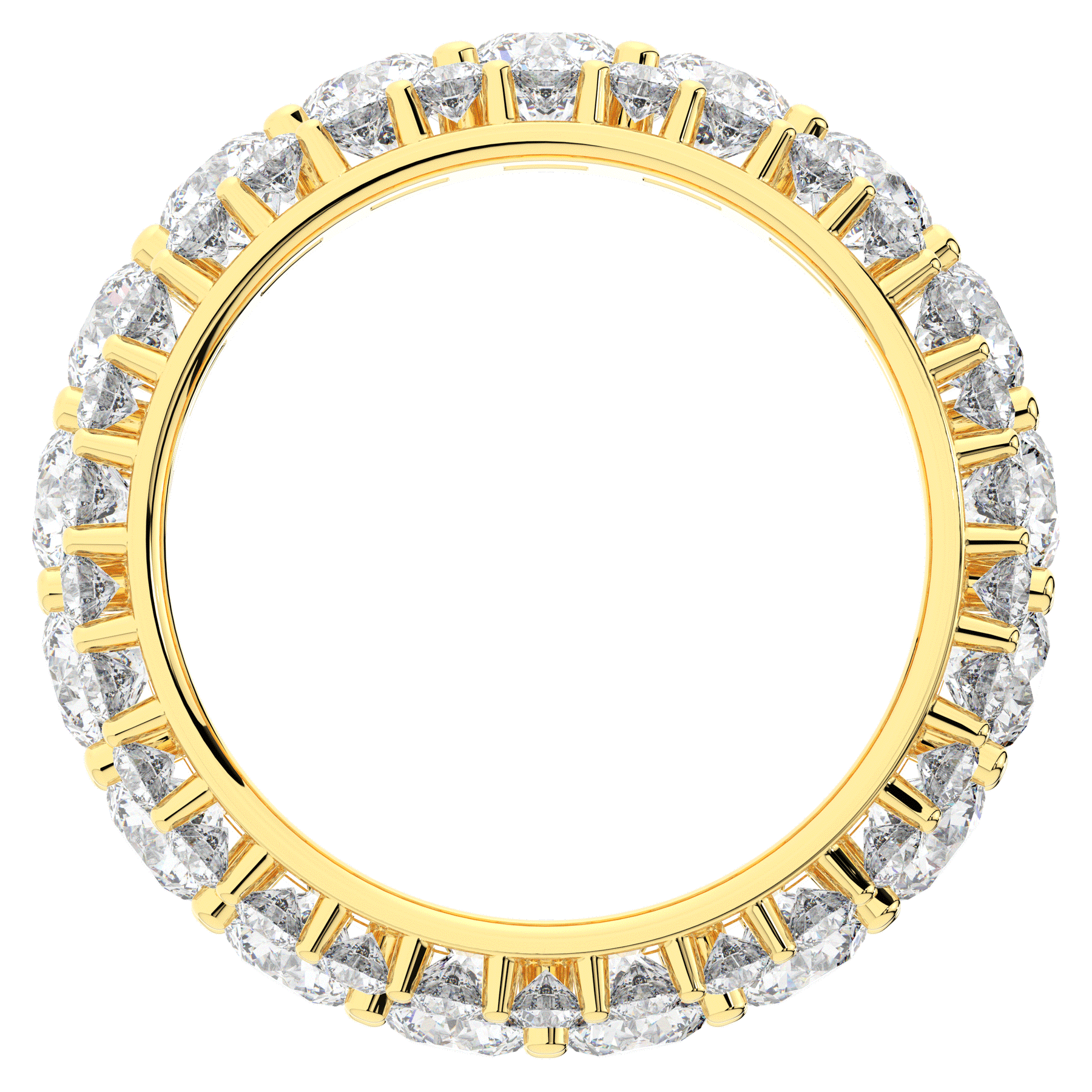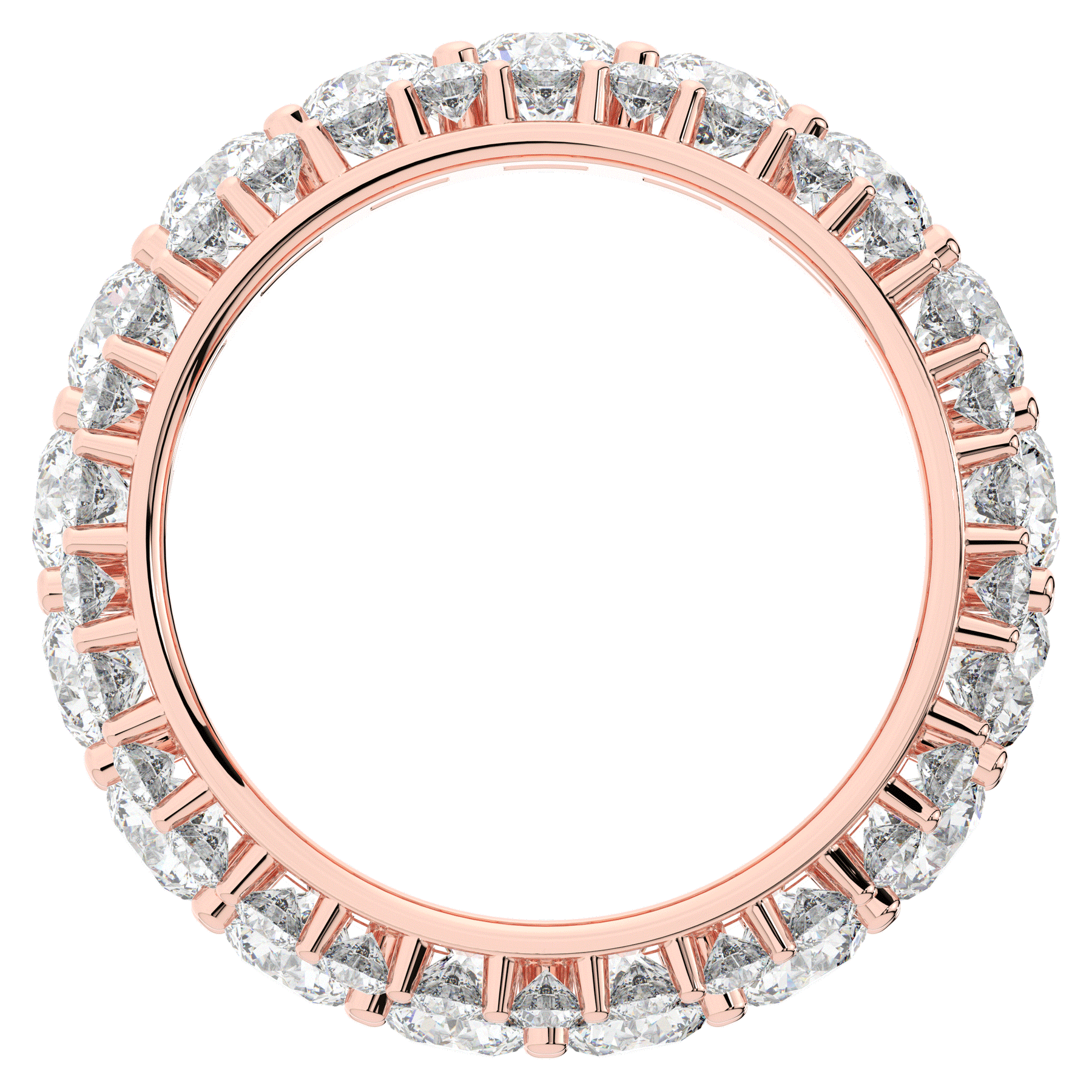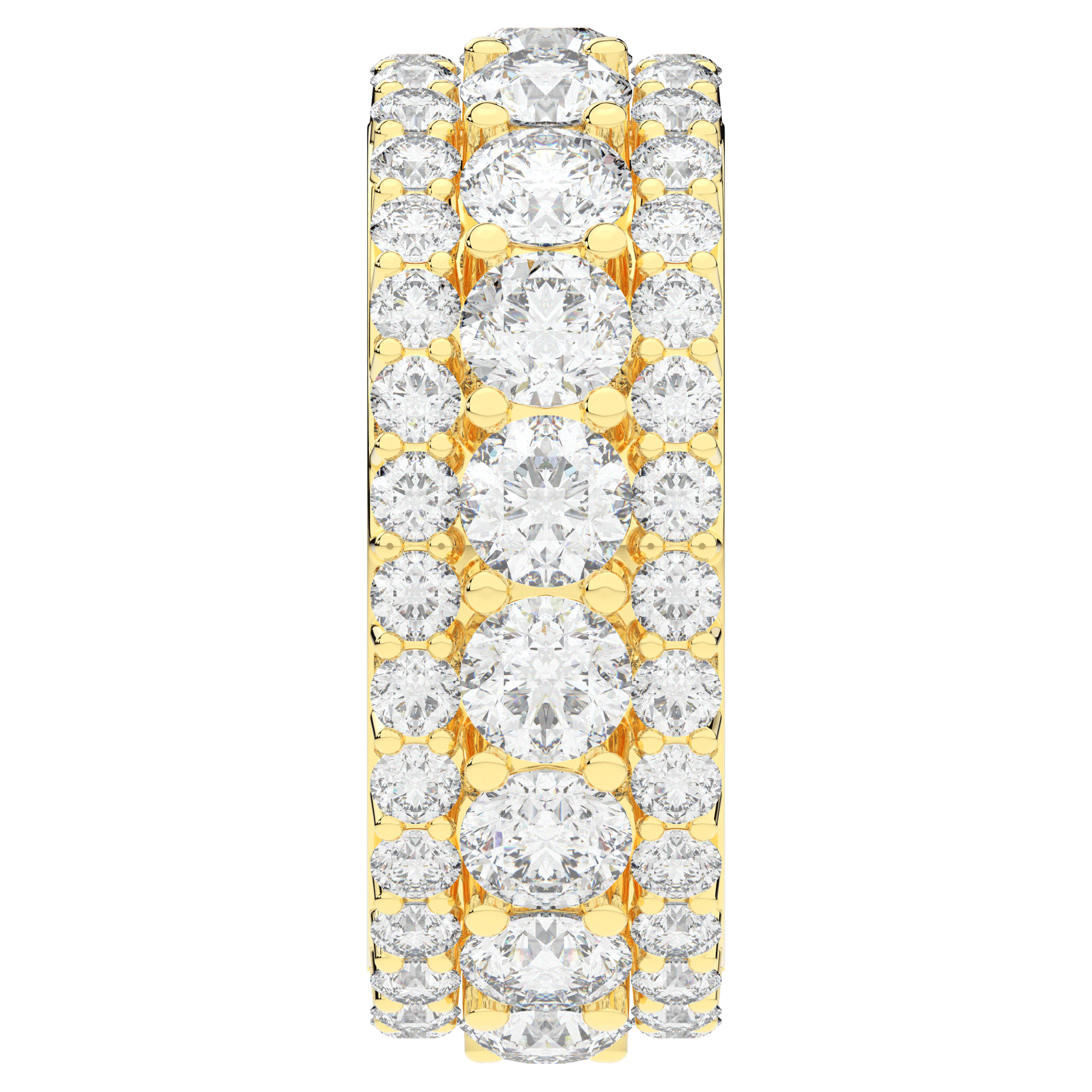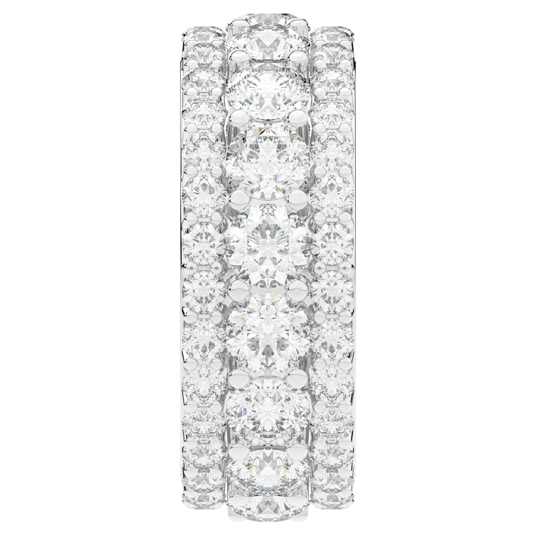 This band features a row of large round lab grown diamonds flanked on either side by a band of smaller round lab grown diamonds, with all of them set so that the diamonds receive as much light as possible. This ring is available in 14k white, yellow or rose gold, 18k yellow gold, as well as platinum.