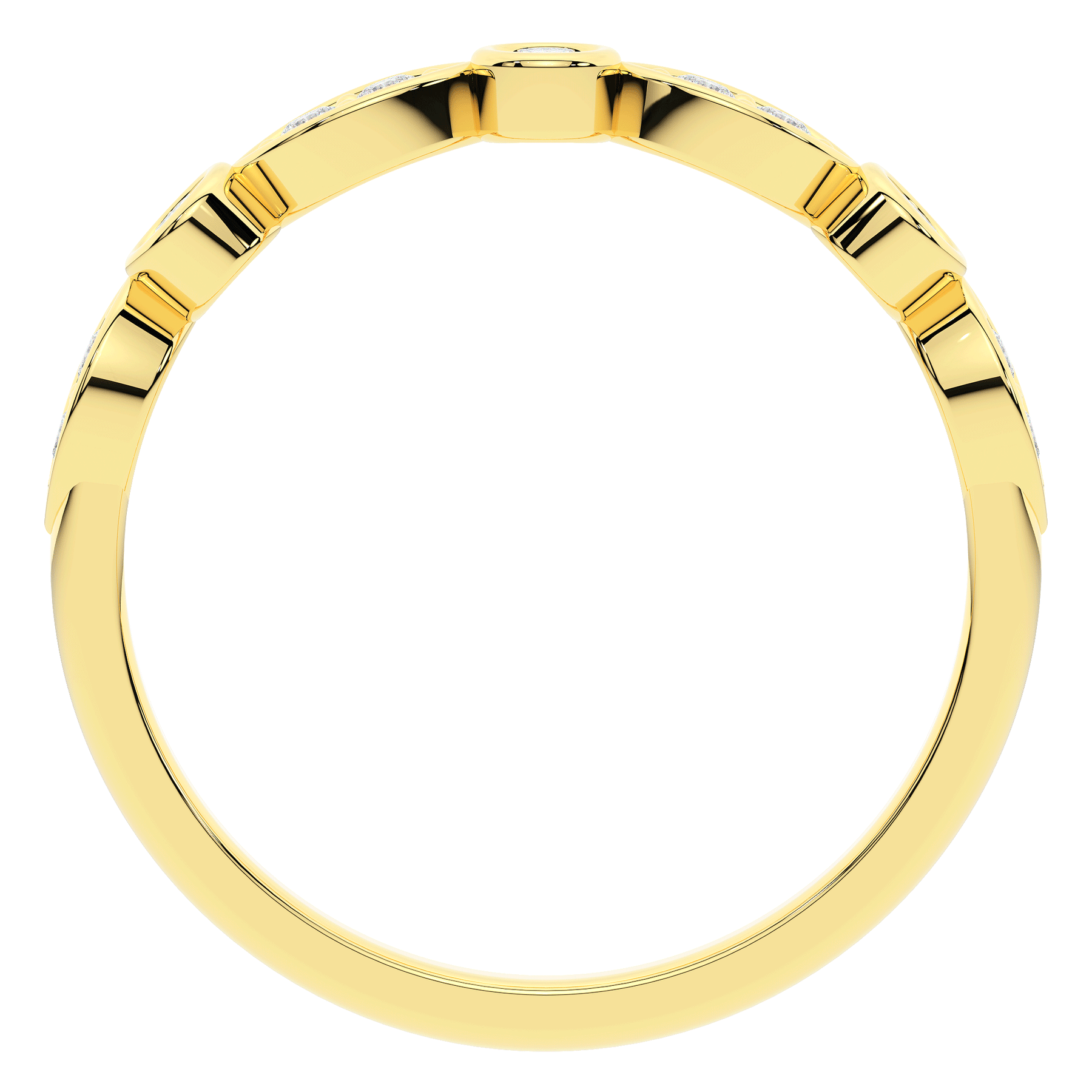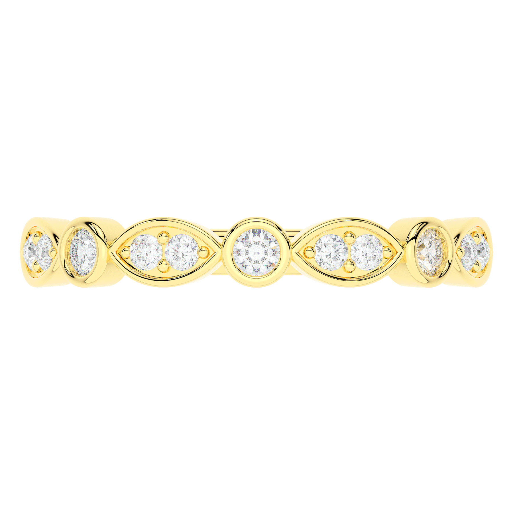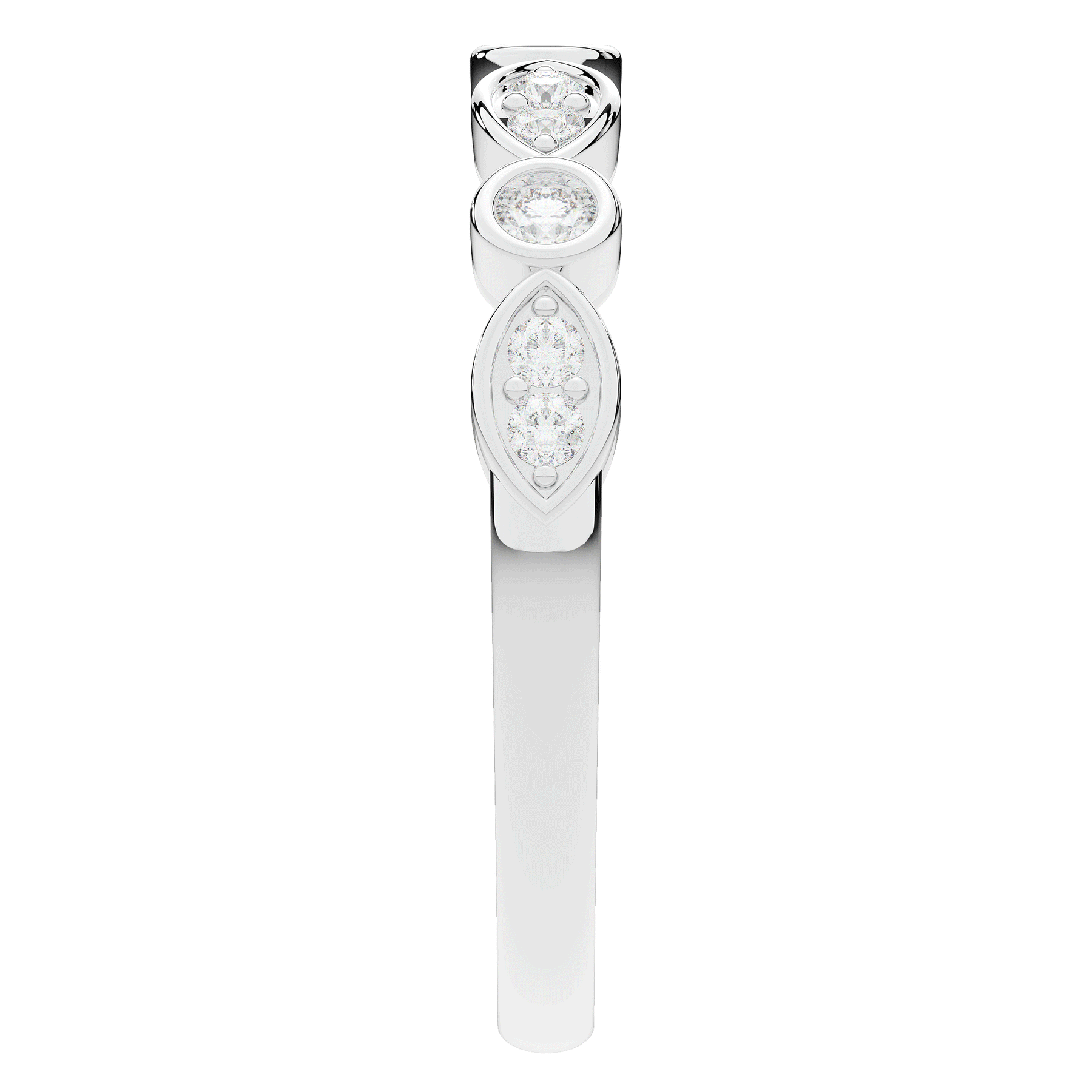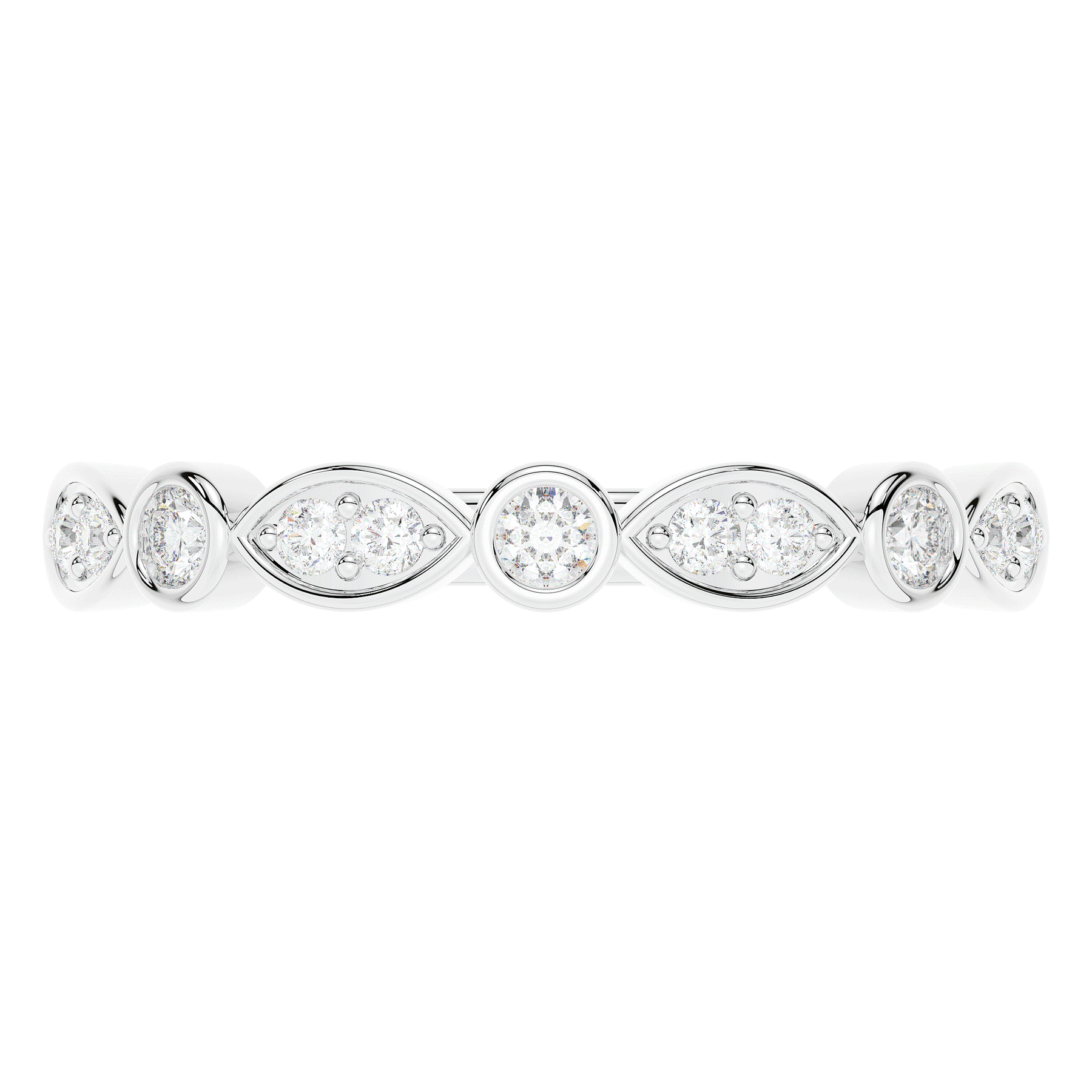 This ring features a unique style with large and small round lab grown diamonds in bezel and prong settings making for a ring with character. This ring is available in 14k white, yellow or rose gold, 18k yellow gold, as well as platinum.