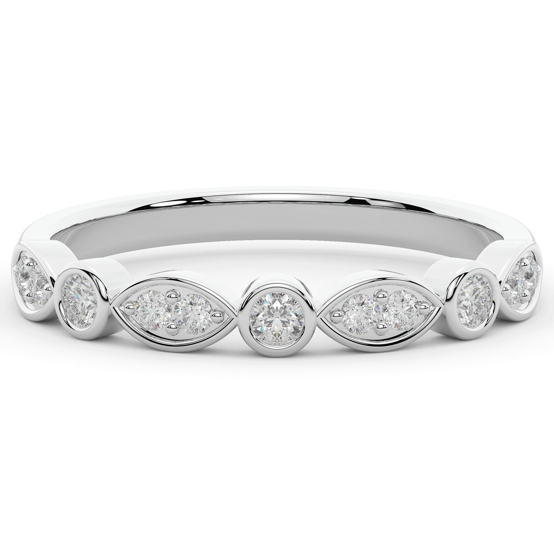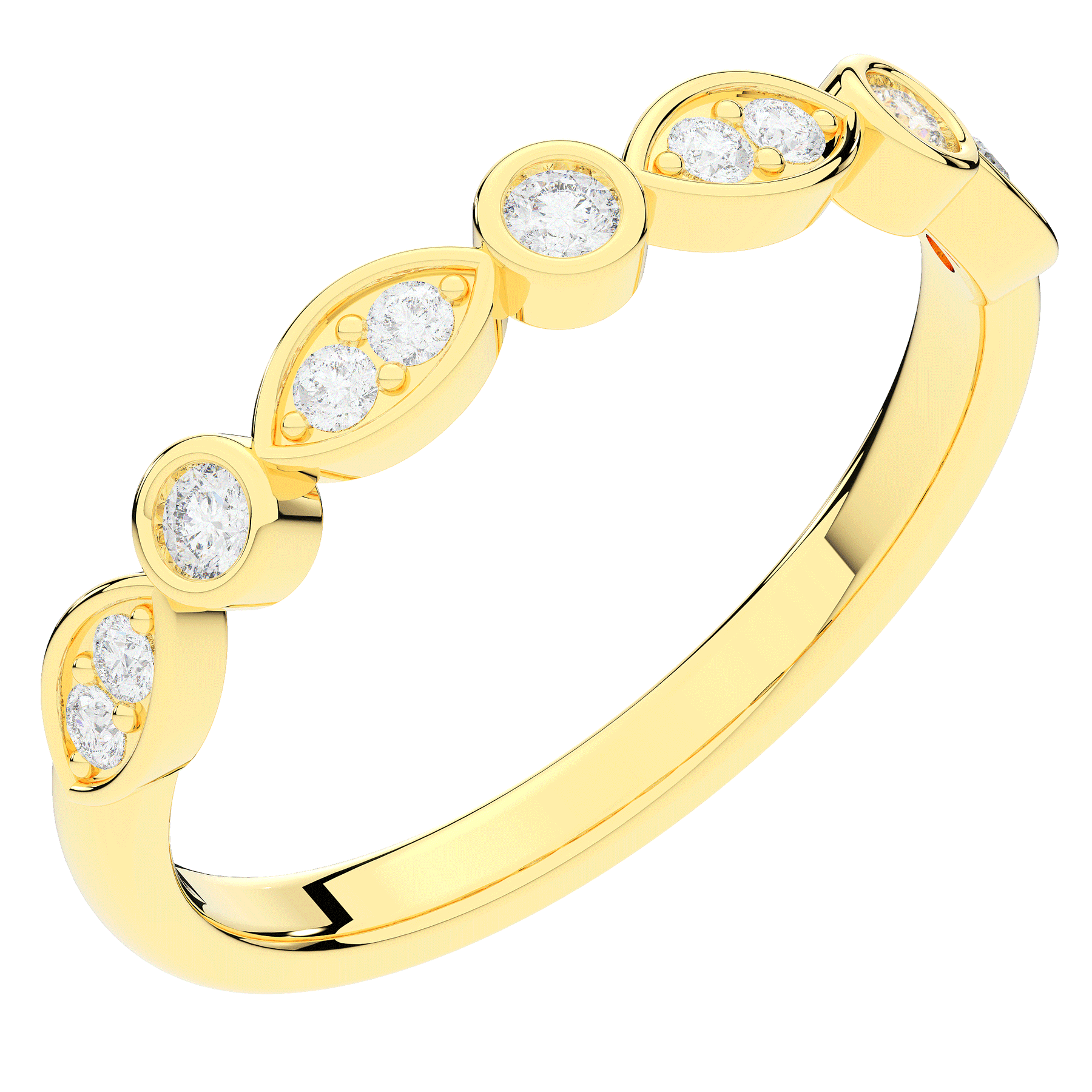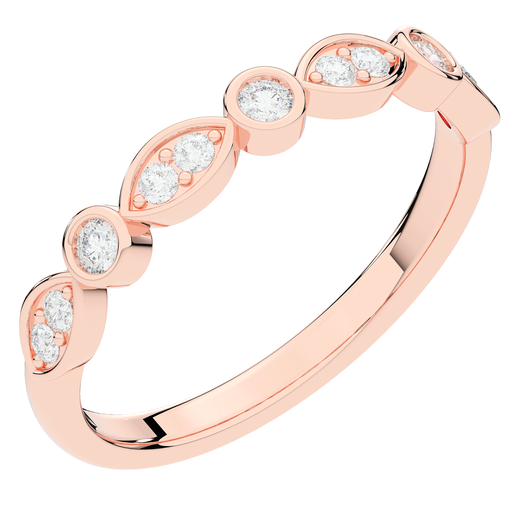 This ring features a unique style with large and small round lab grown diamonds in bezel and prong settings making for a ring with character. This ring is available in 14k white, yellow or rose gold, 18k yellow gold, as well as platinum.