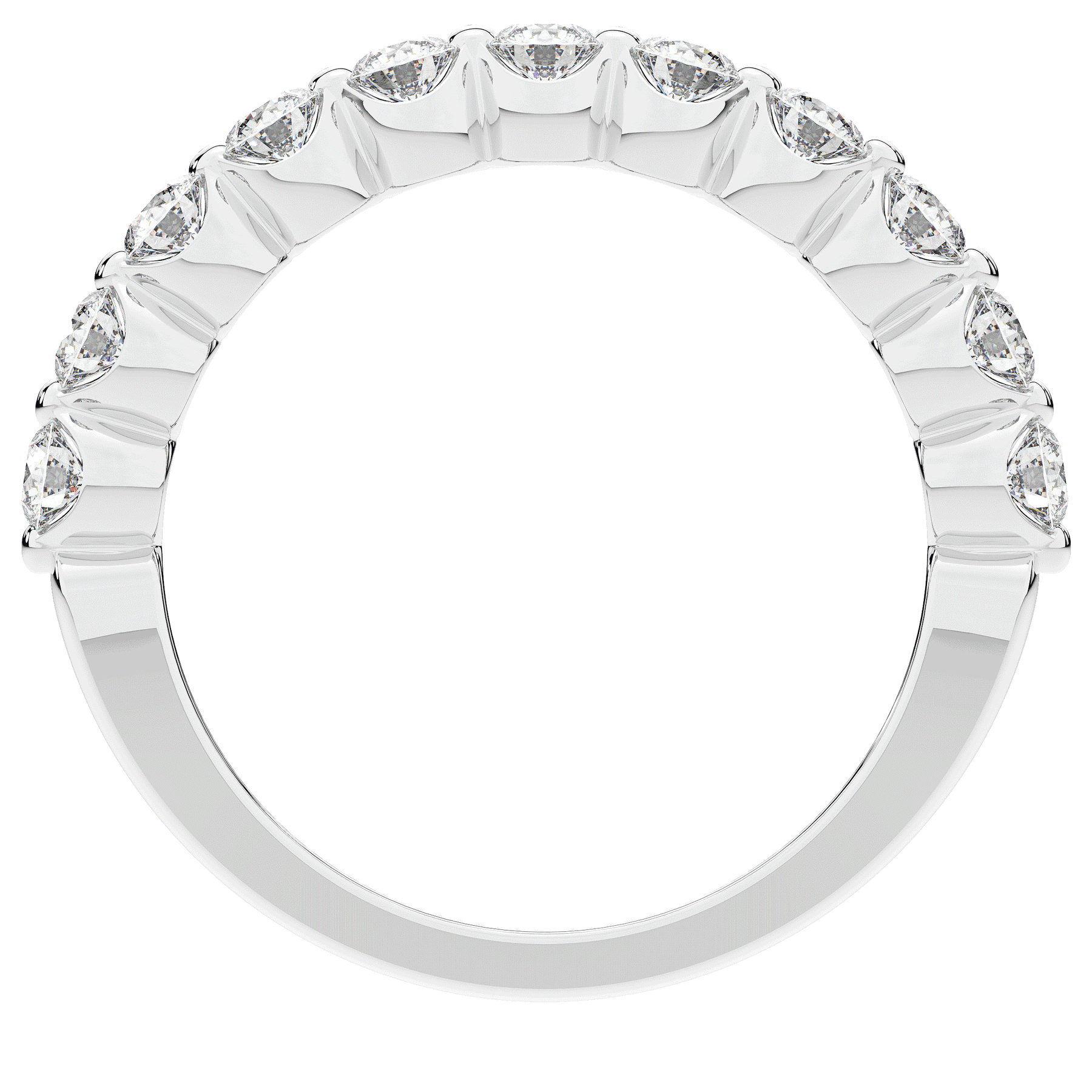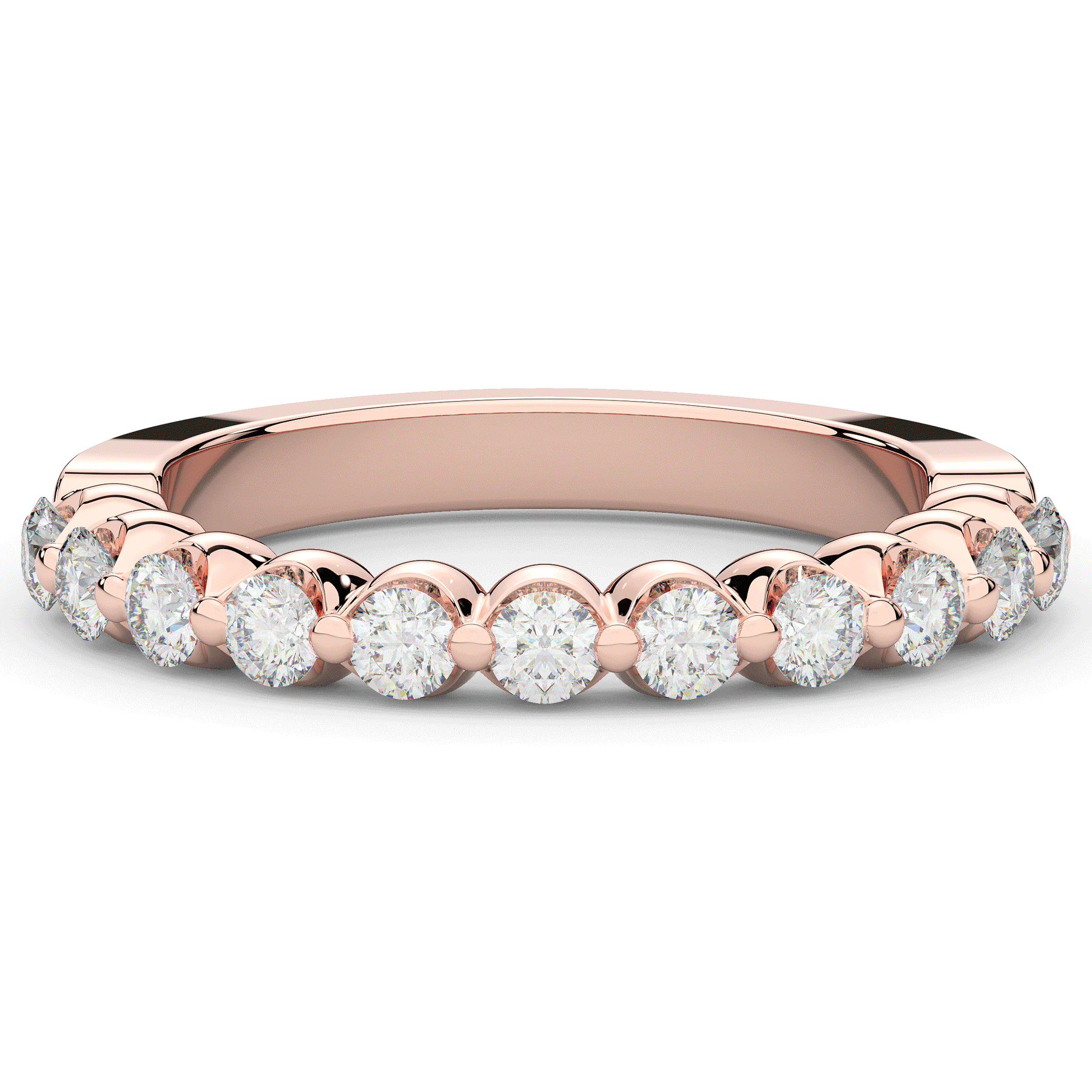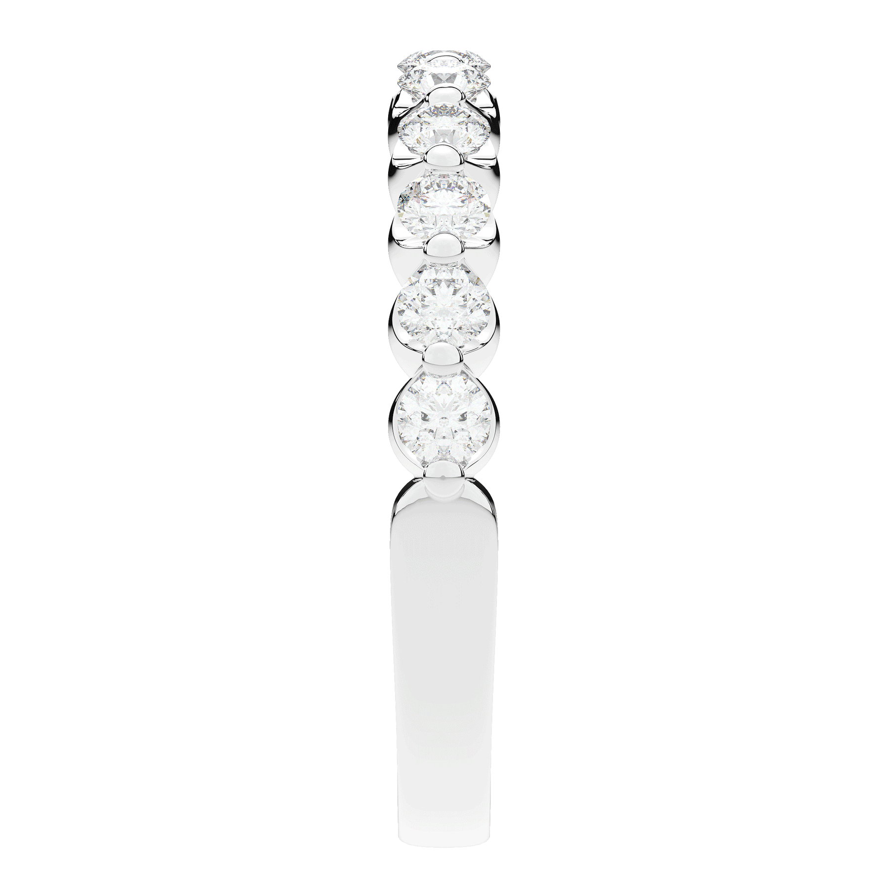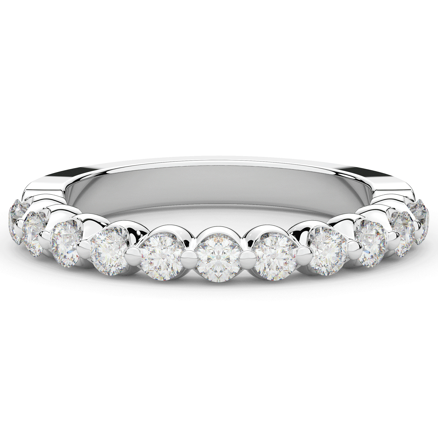 This ring features a stunning scalloped side band with shared prongs for the round lab grown diamonds, to show as much of the diamonds as possible. This ring is available in 14k white, yellow or rose gold, 18k yellow gold, as well as platinum.