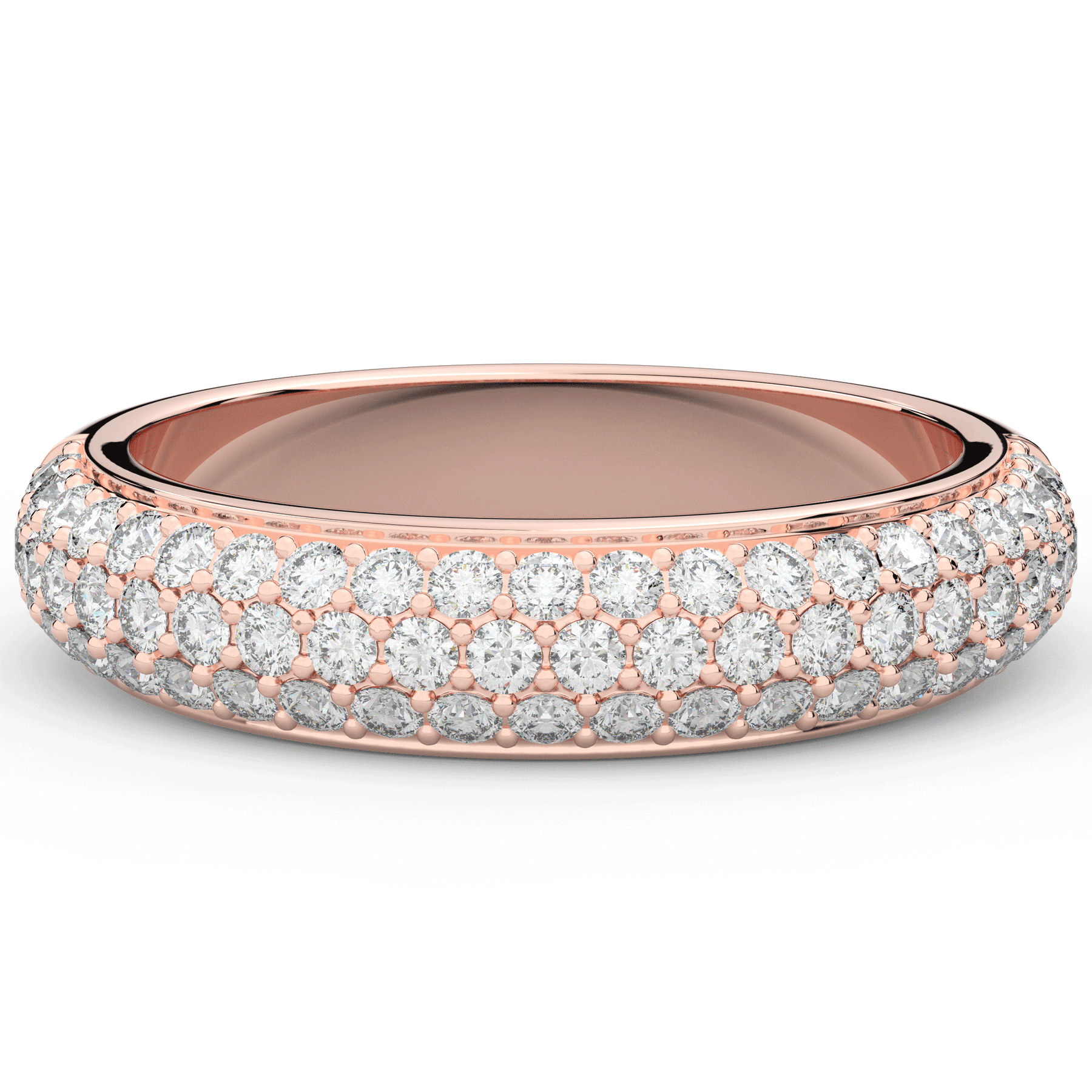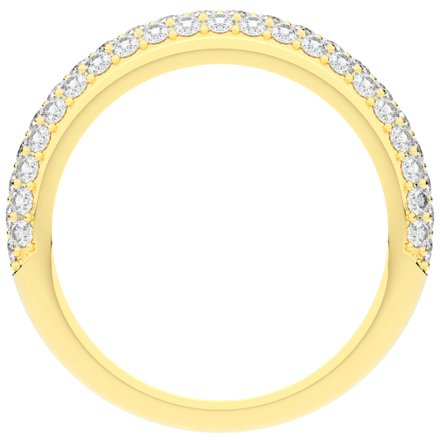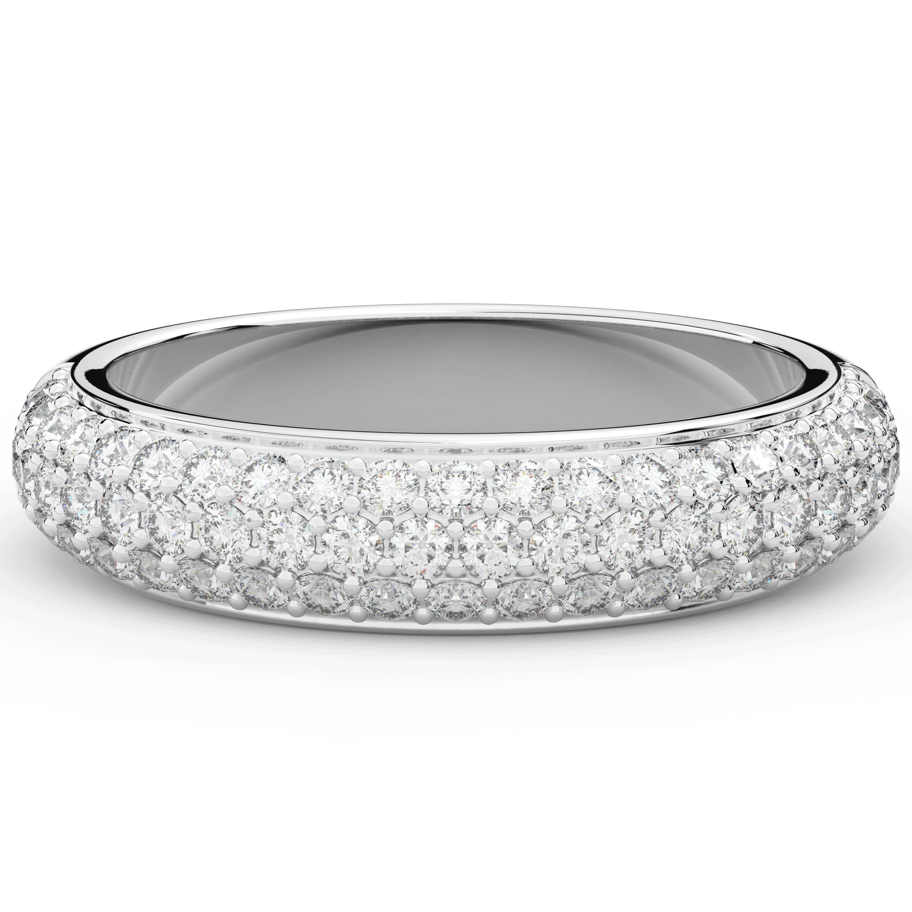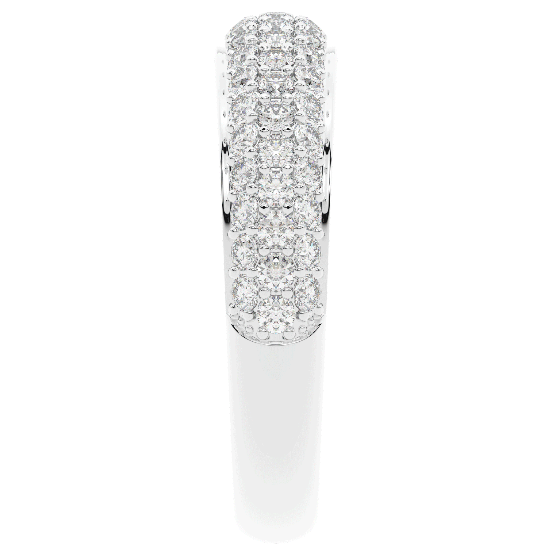 This beautiful ring features 3 rows of bright round lab grown diamonds accenting the band. This ring is available in 14k white, yellow or rose gold, 18k yellow gold, as well as platinum.