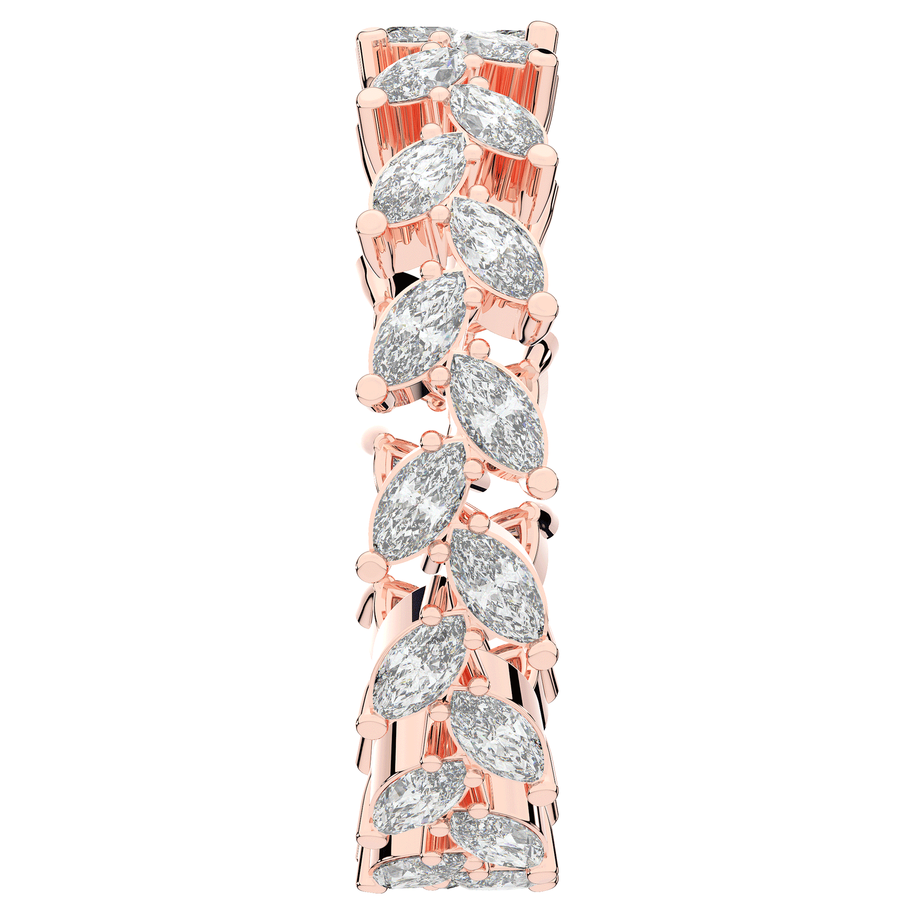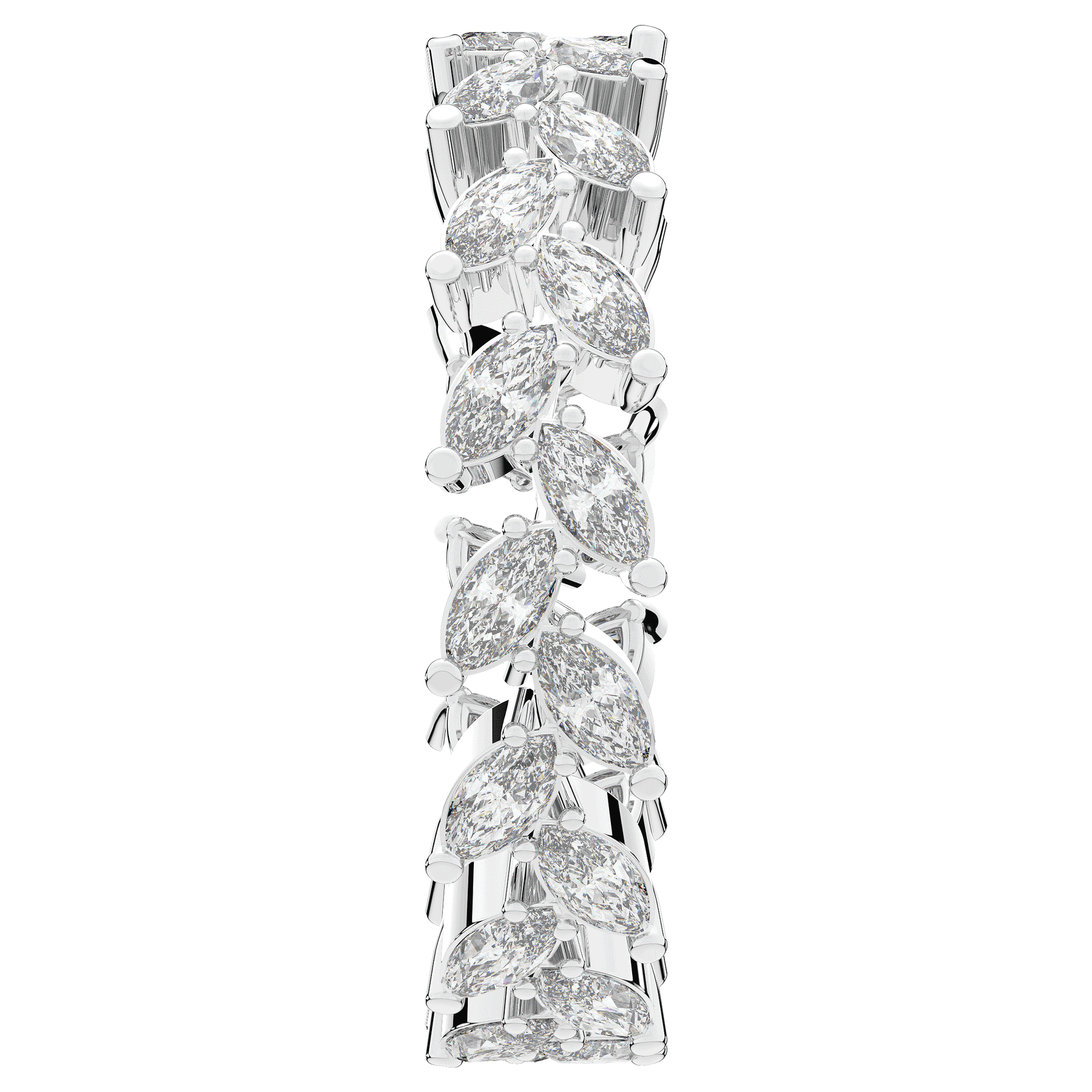 This stunning ring features lab grown marquise diamonds in an alternating left right leaf pattern. This ring is available in 14k white, yellow or rose gold, 18k yellow gold, as well as platinum.