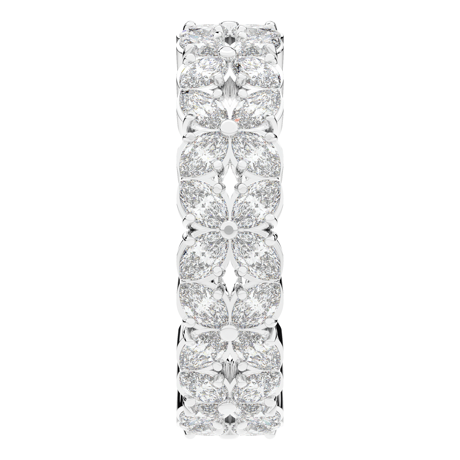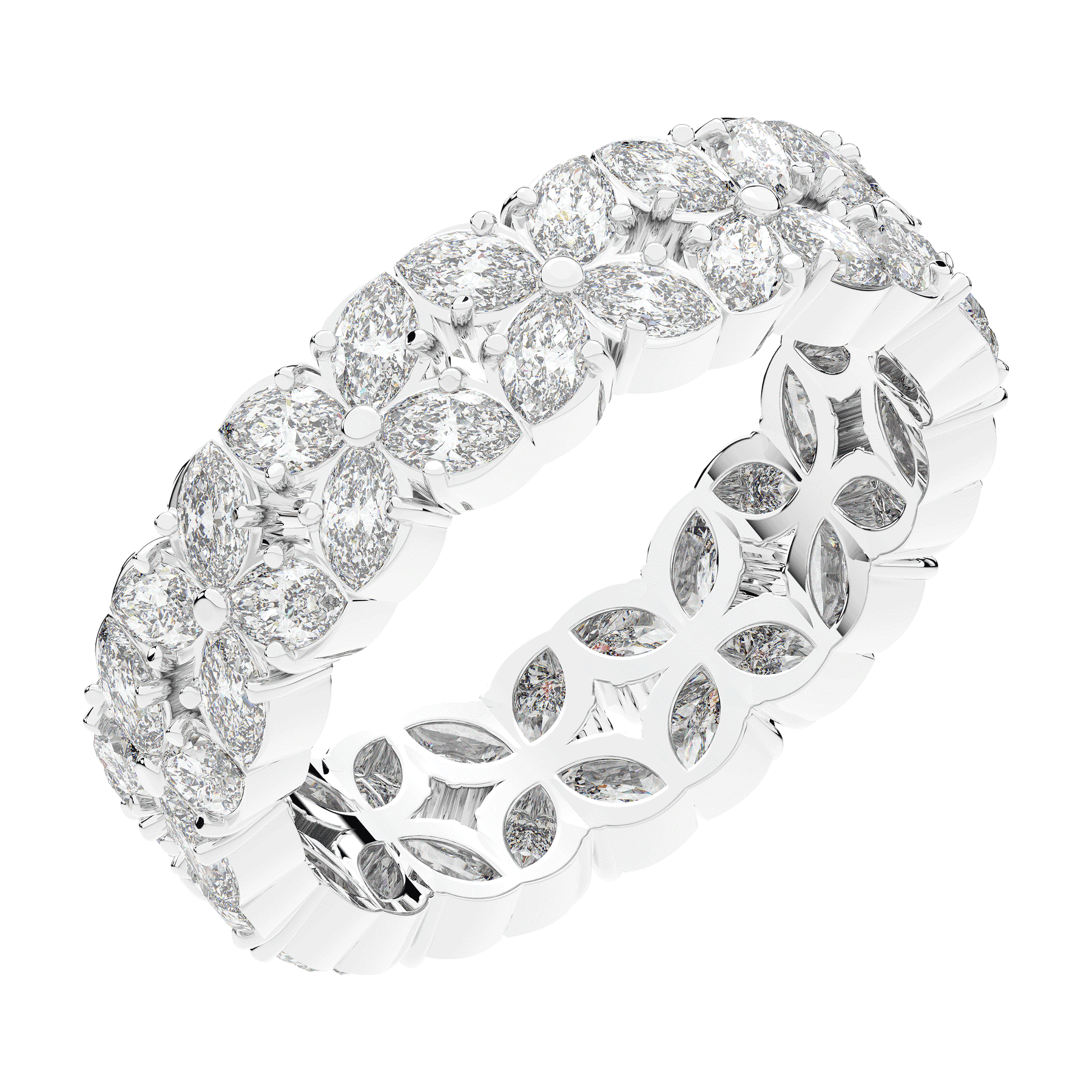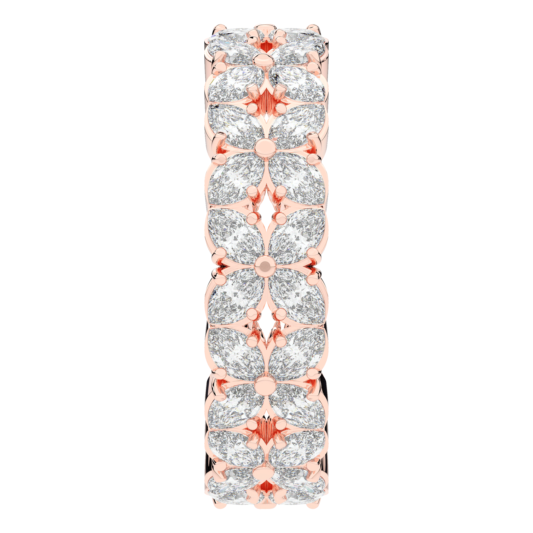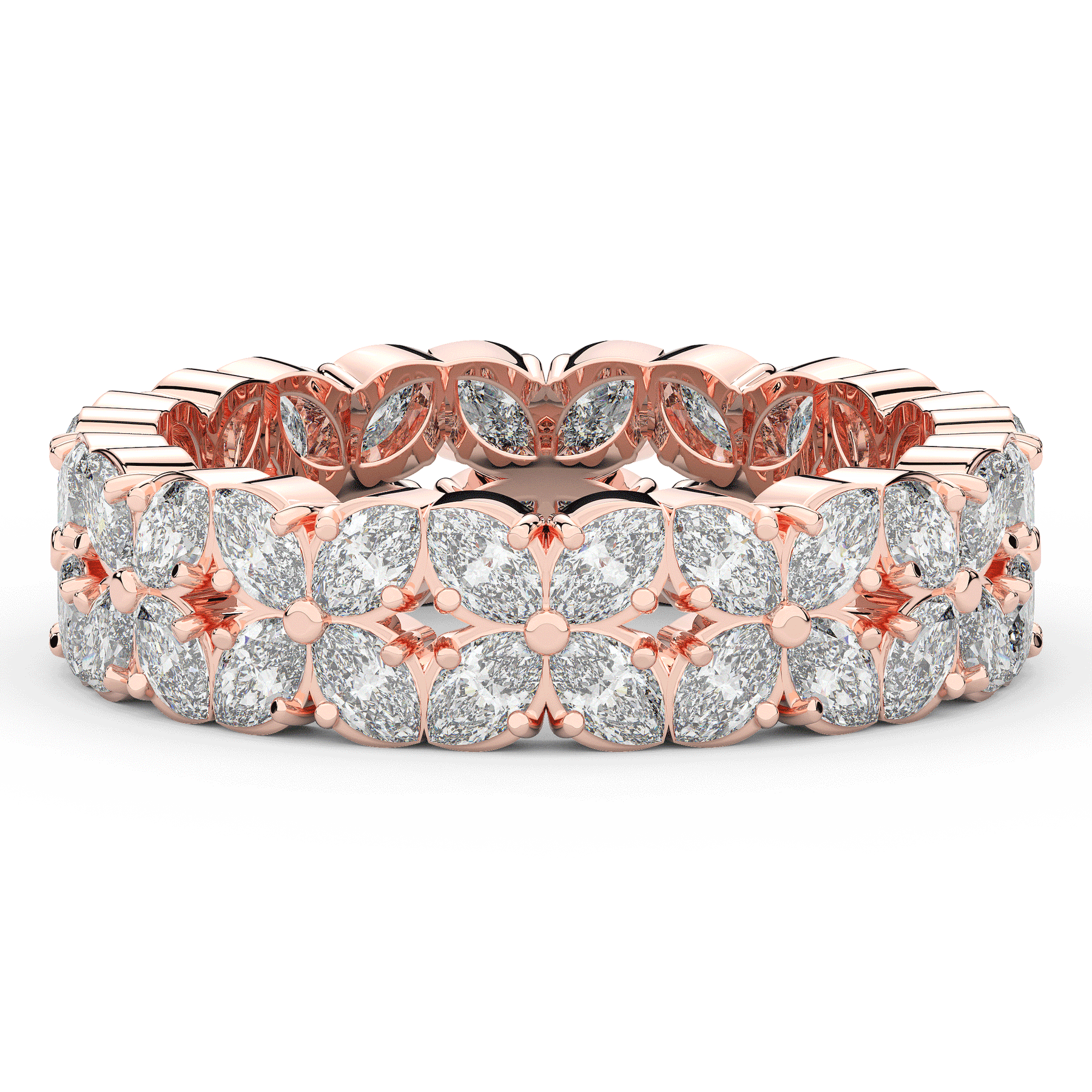 This stunning ring features large, bright marquise lab diamonds set around the whole band in a flower petal eternity style. This ring is available in 14k white, yellow or rose gold, 18k yellow gold, as well as platinum.