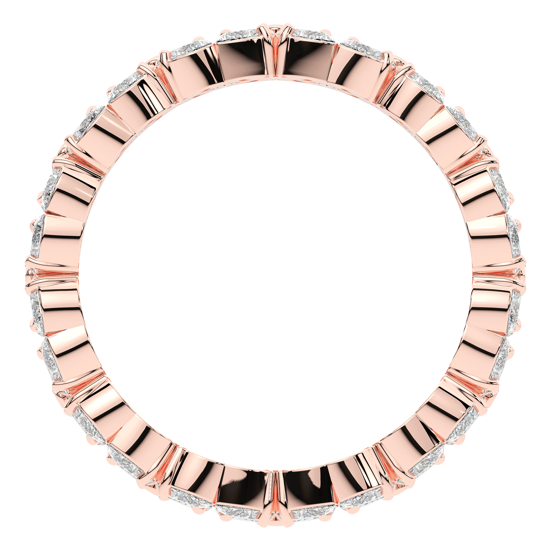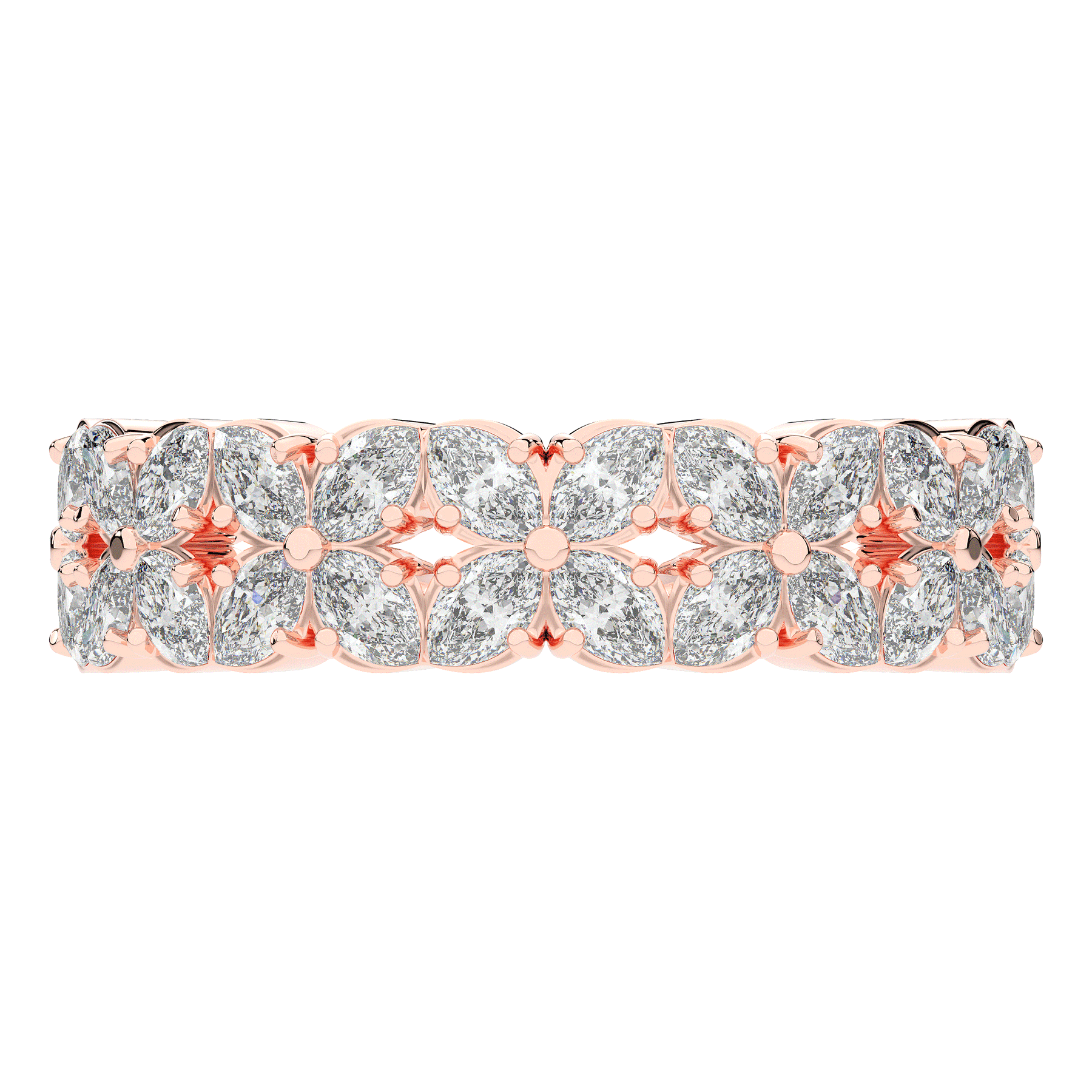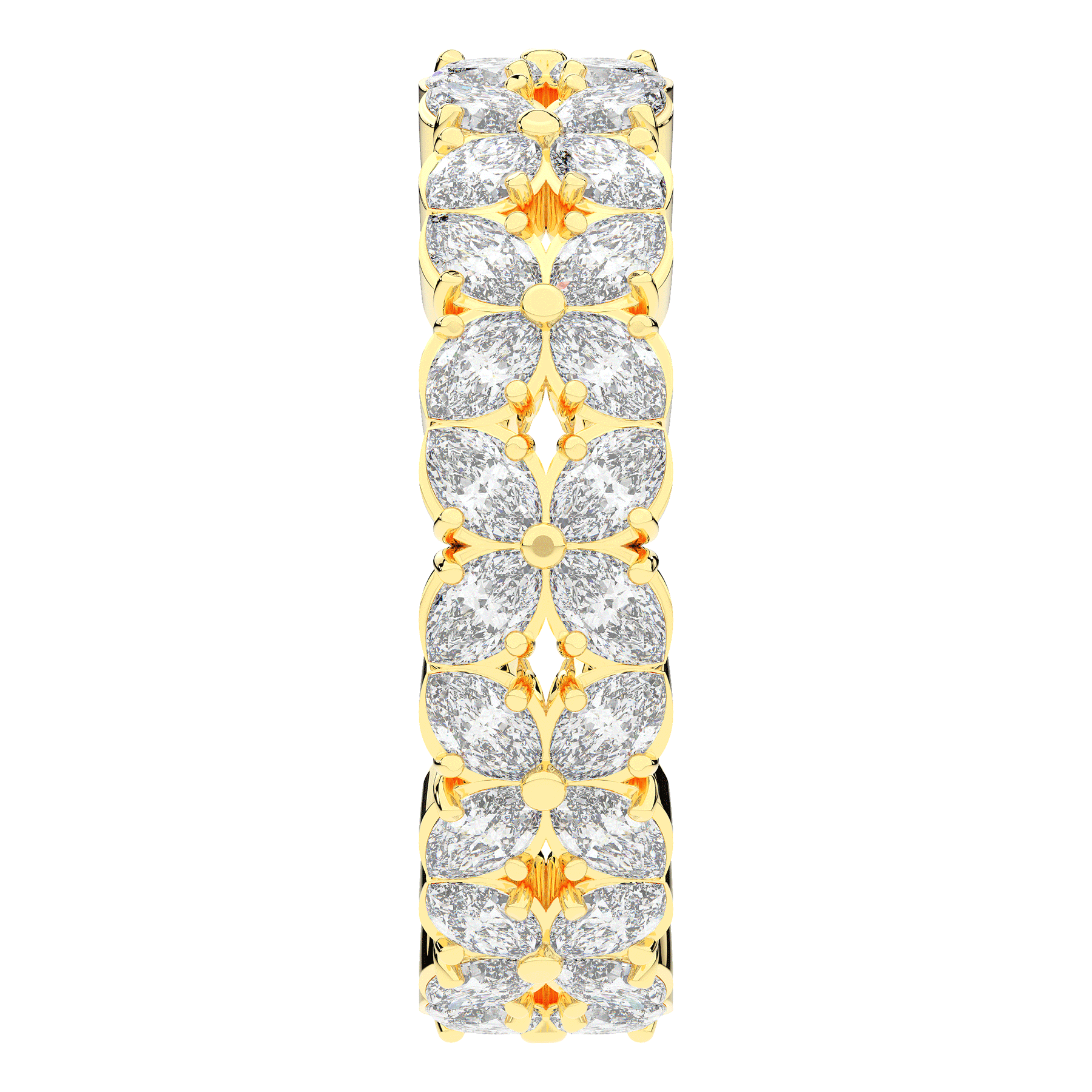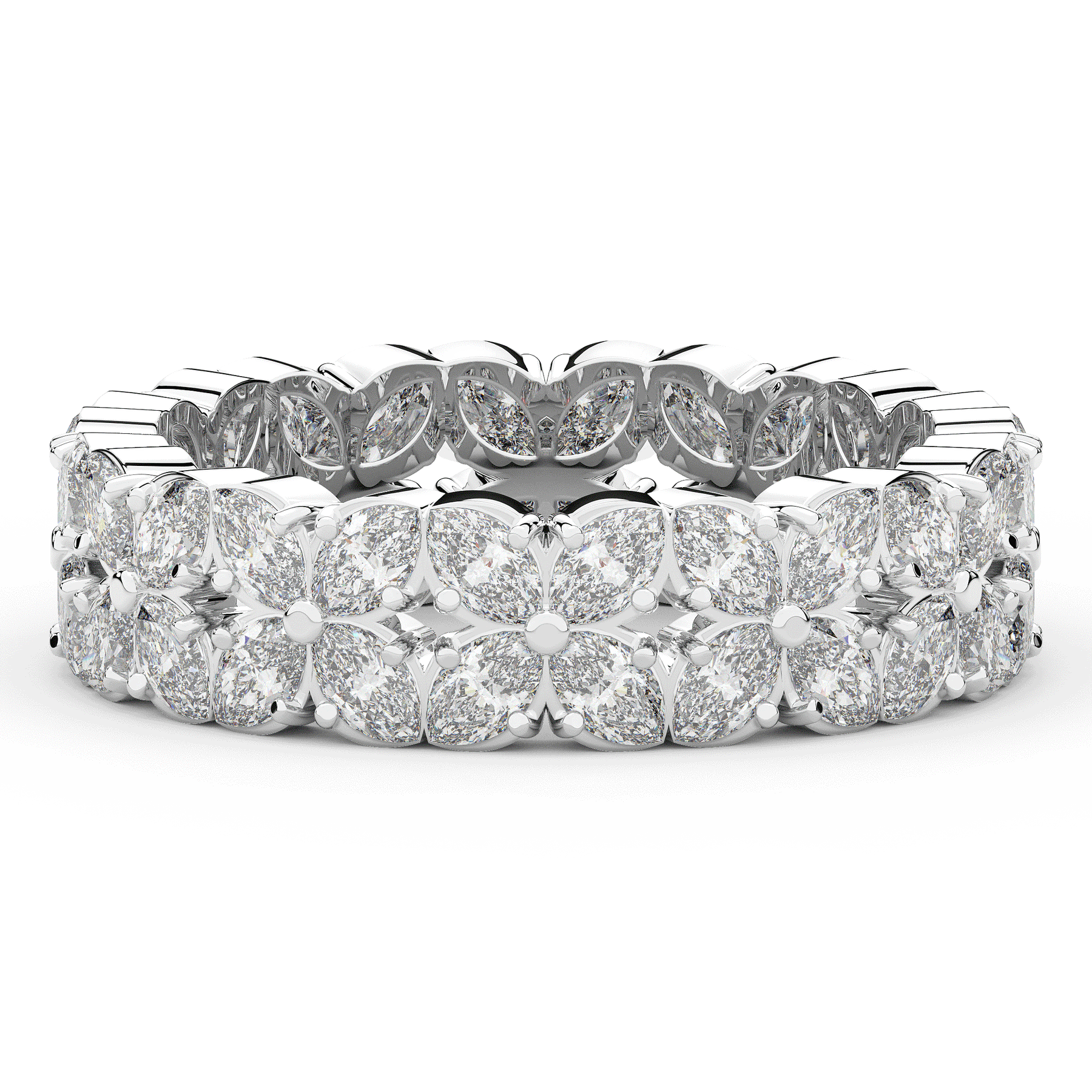 This stunning ring features large, bright marquise lab diamonds set around the whole band in a flower petal eternity style. This ring is available in 14k white, yellow or rose gold, 18k yellow gold, as well as platinum.