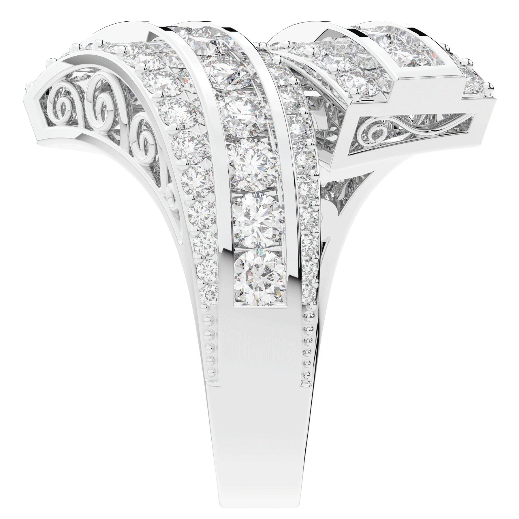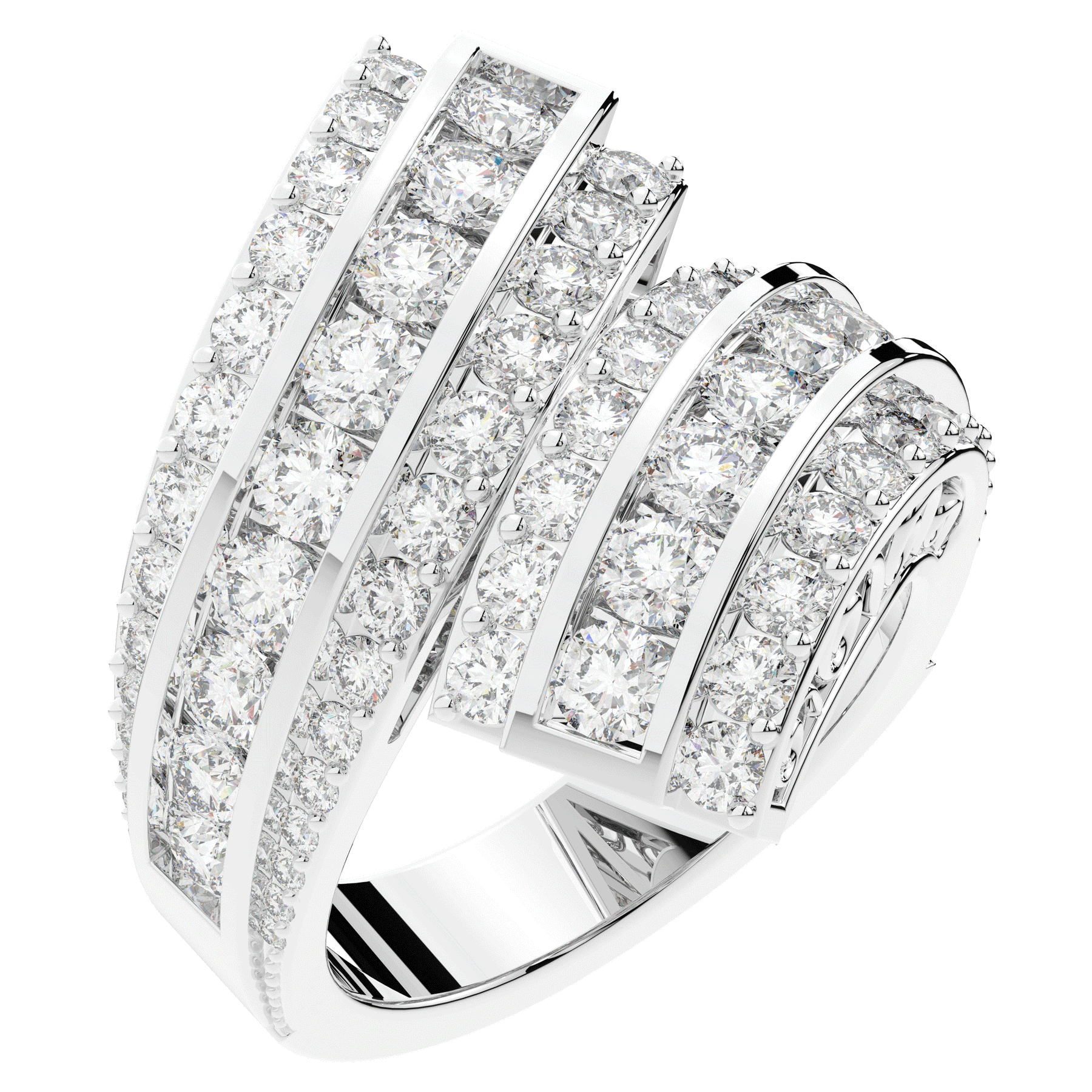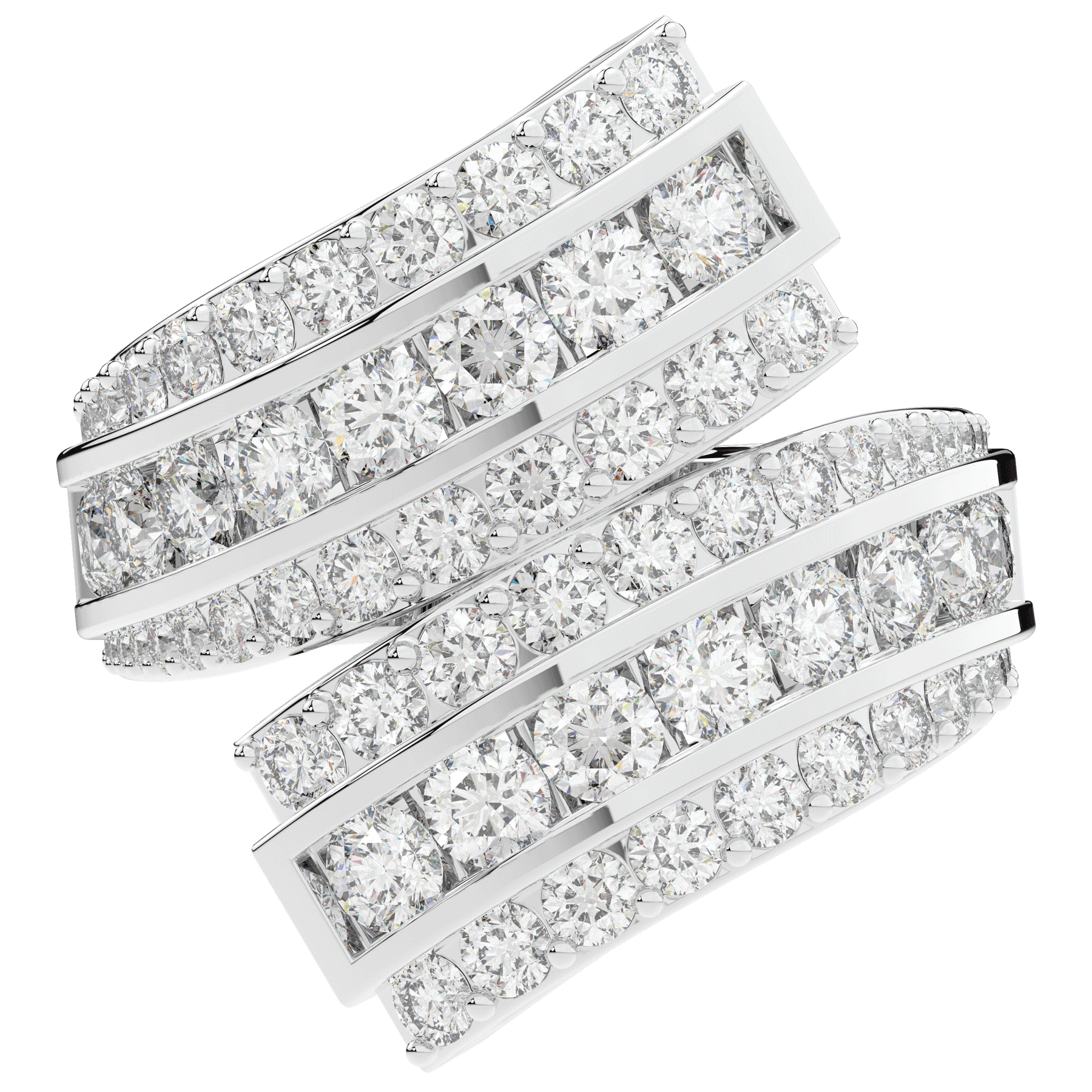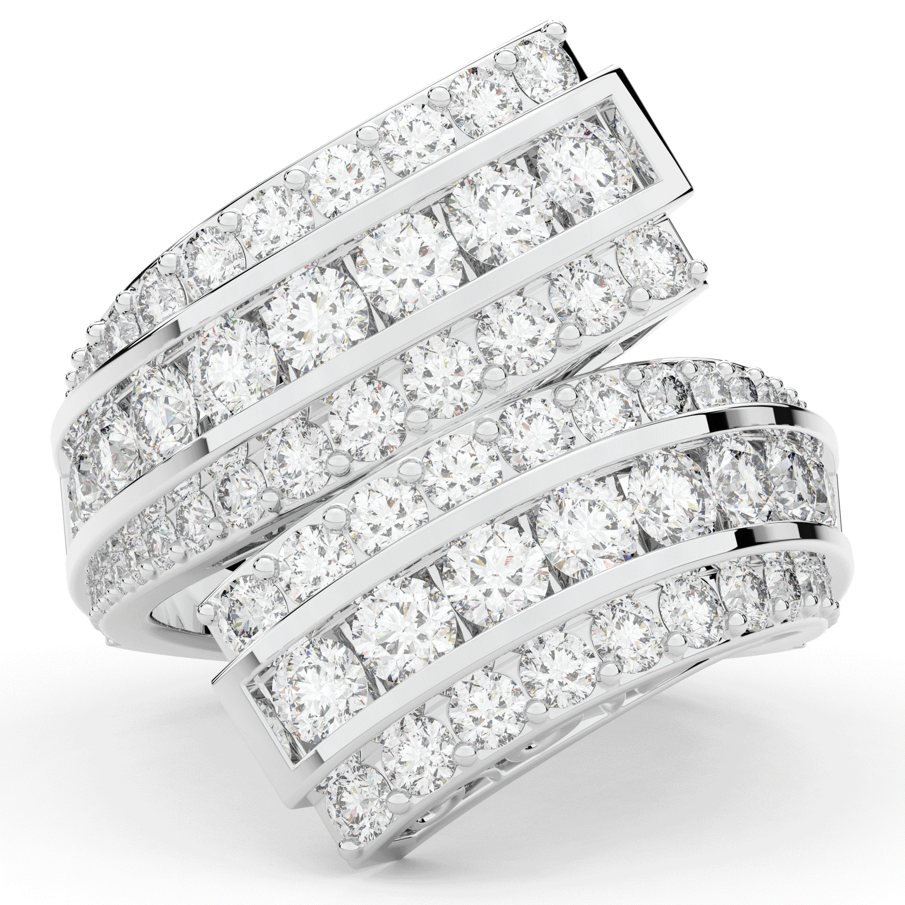 This stunning wedding band features a twisted bypass design with a center channel of large round lab grown diamonds flanked by smaller tapering round lab grown diamonds on each side. This ring is available in 14k white, yellow or rose gold, 18k yellow gold, as well as platinum.