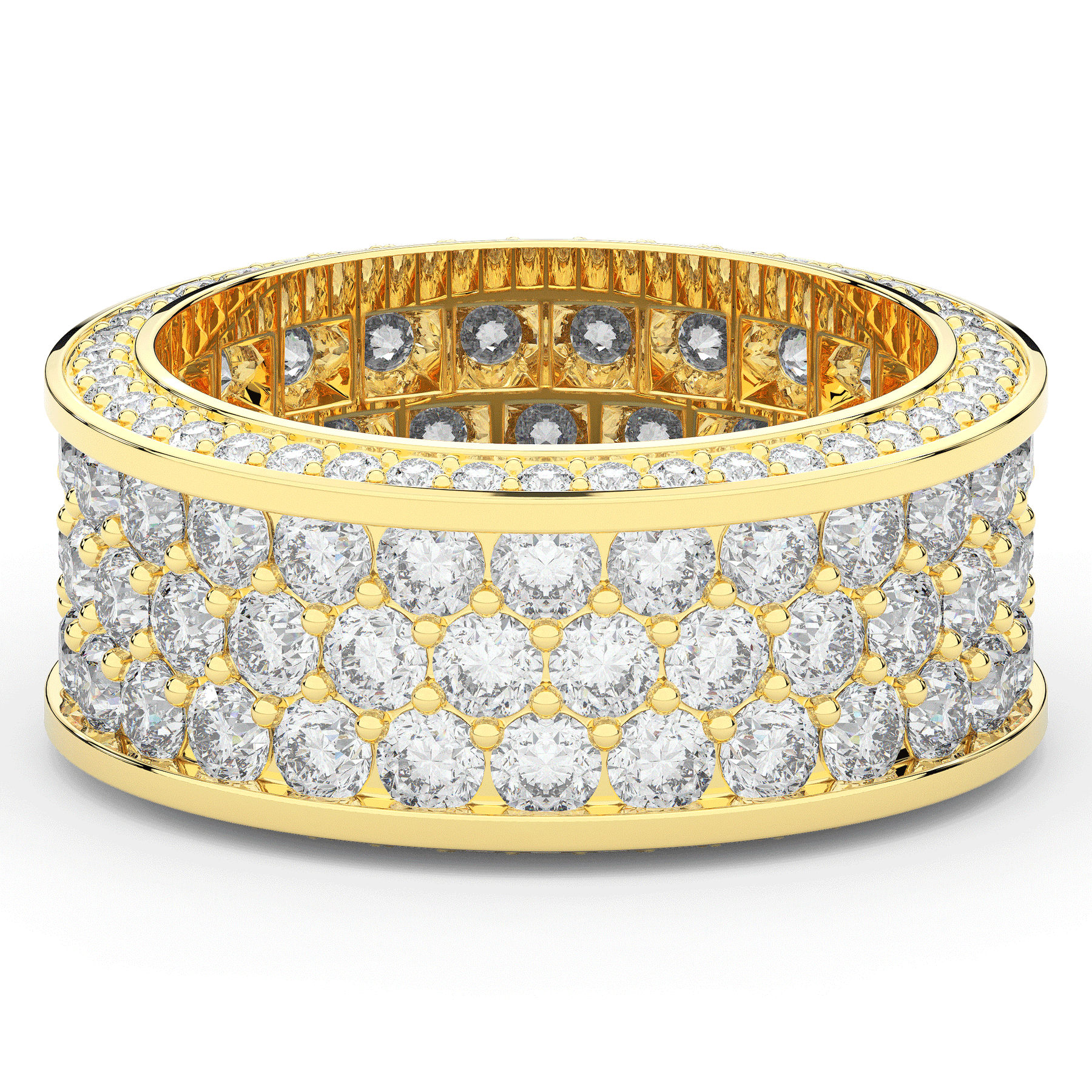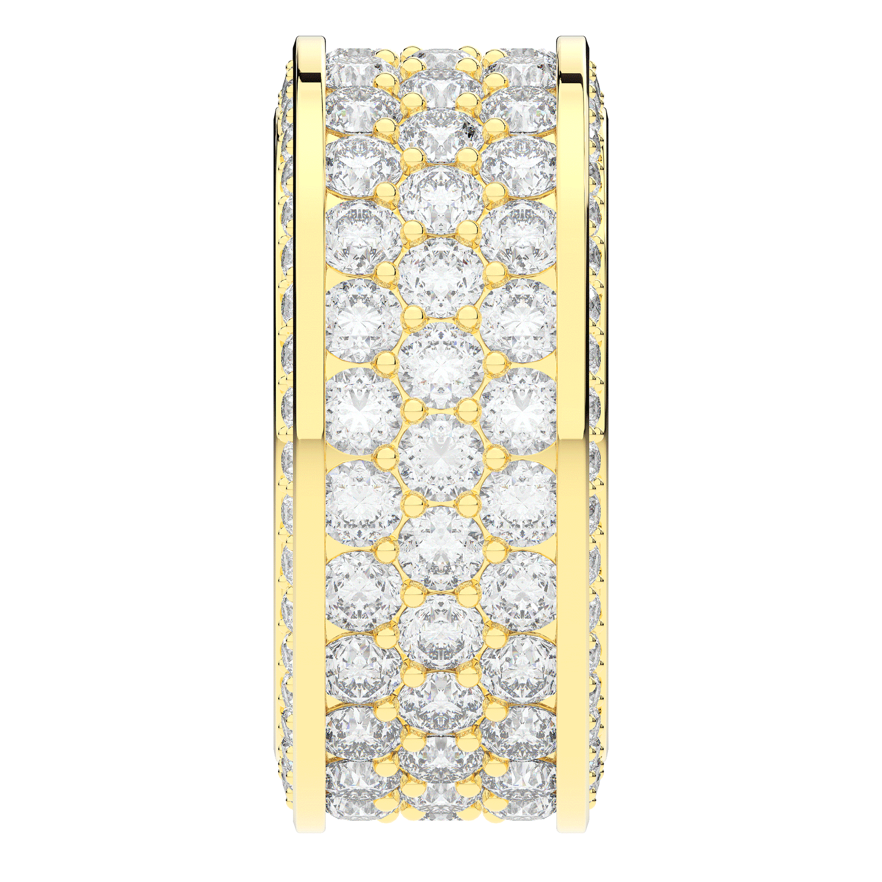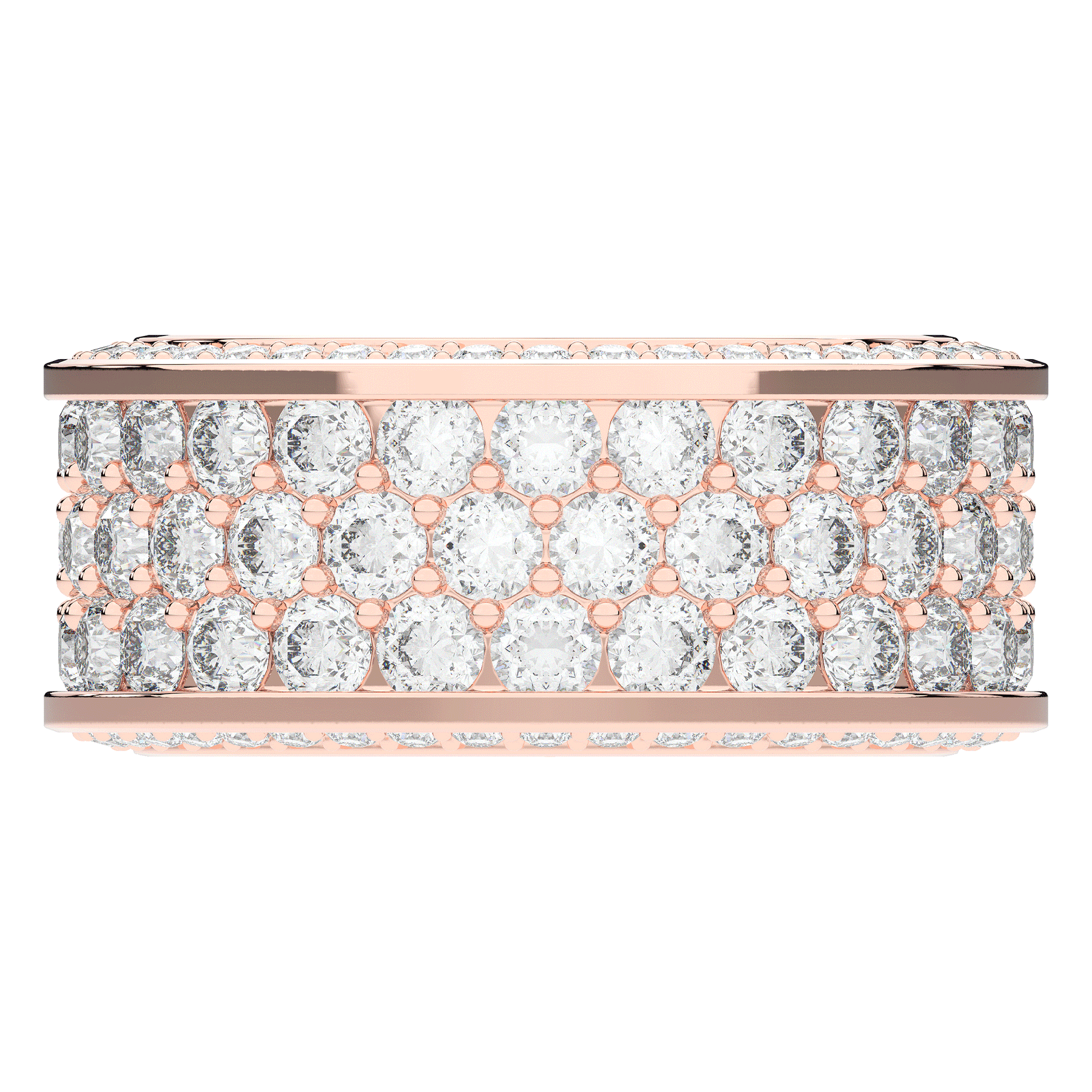 This stunning ring features 3 rows of bright lab grown round diamonds in the center as well as round lab diamonds on both the front and back of this eternity ring. This ring is available in 14k white, yellow or rose gold, 18k yellow gold, as well as platinum.