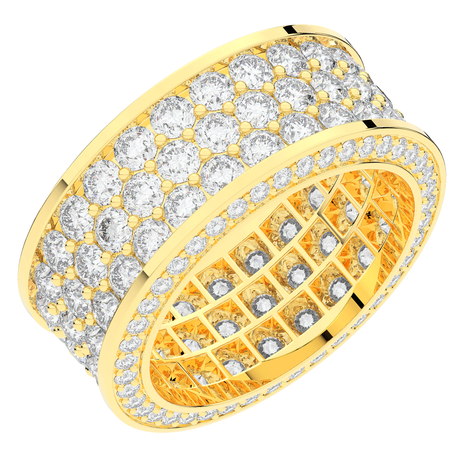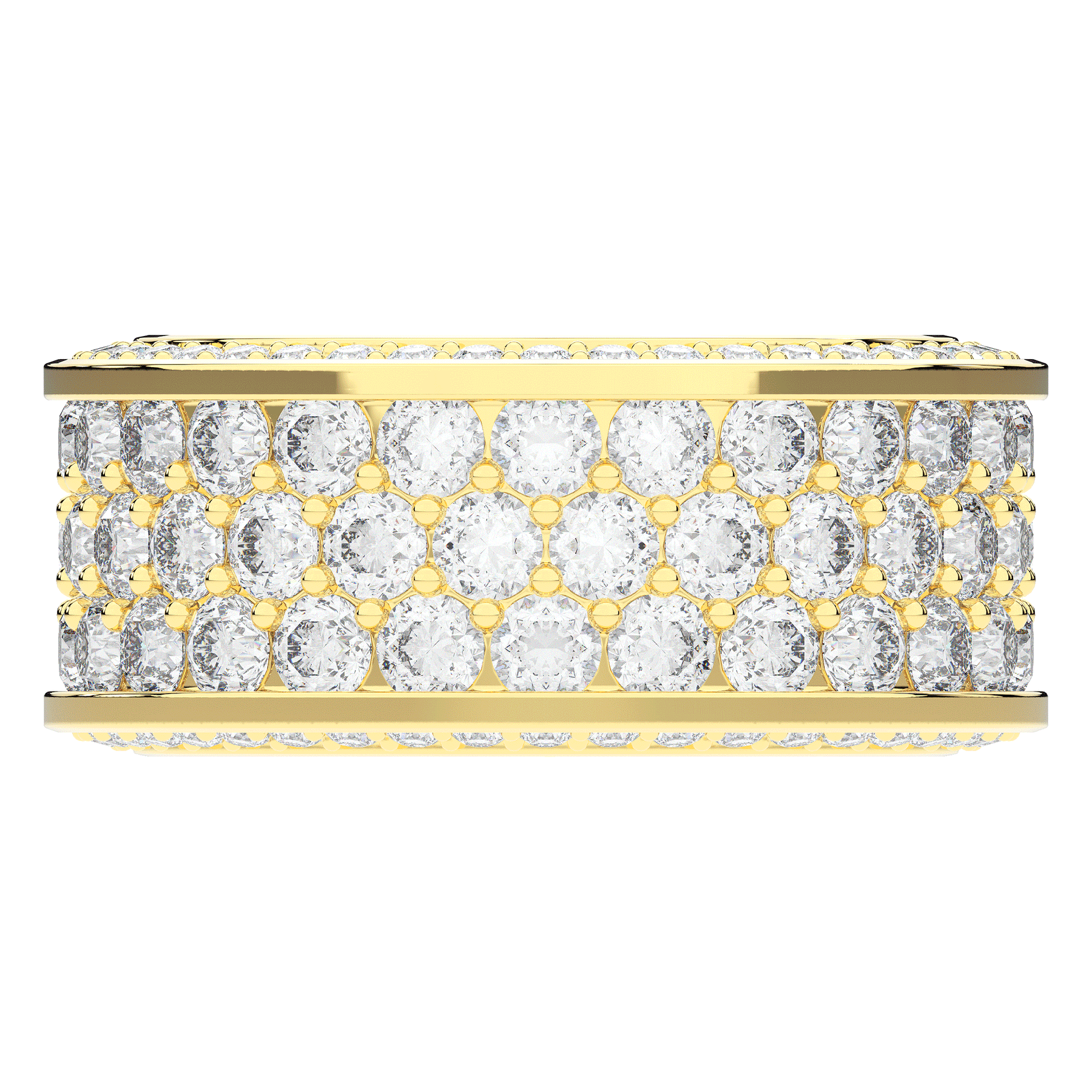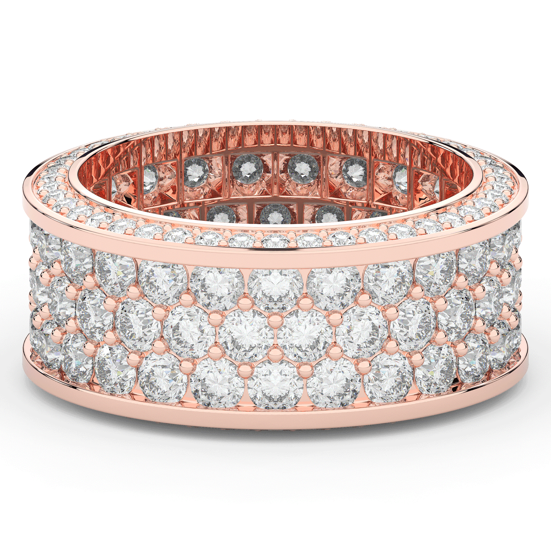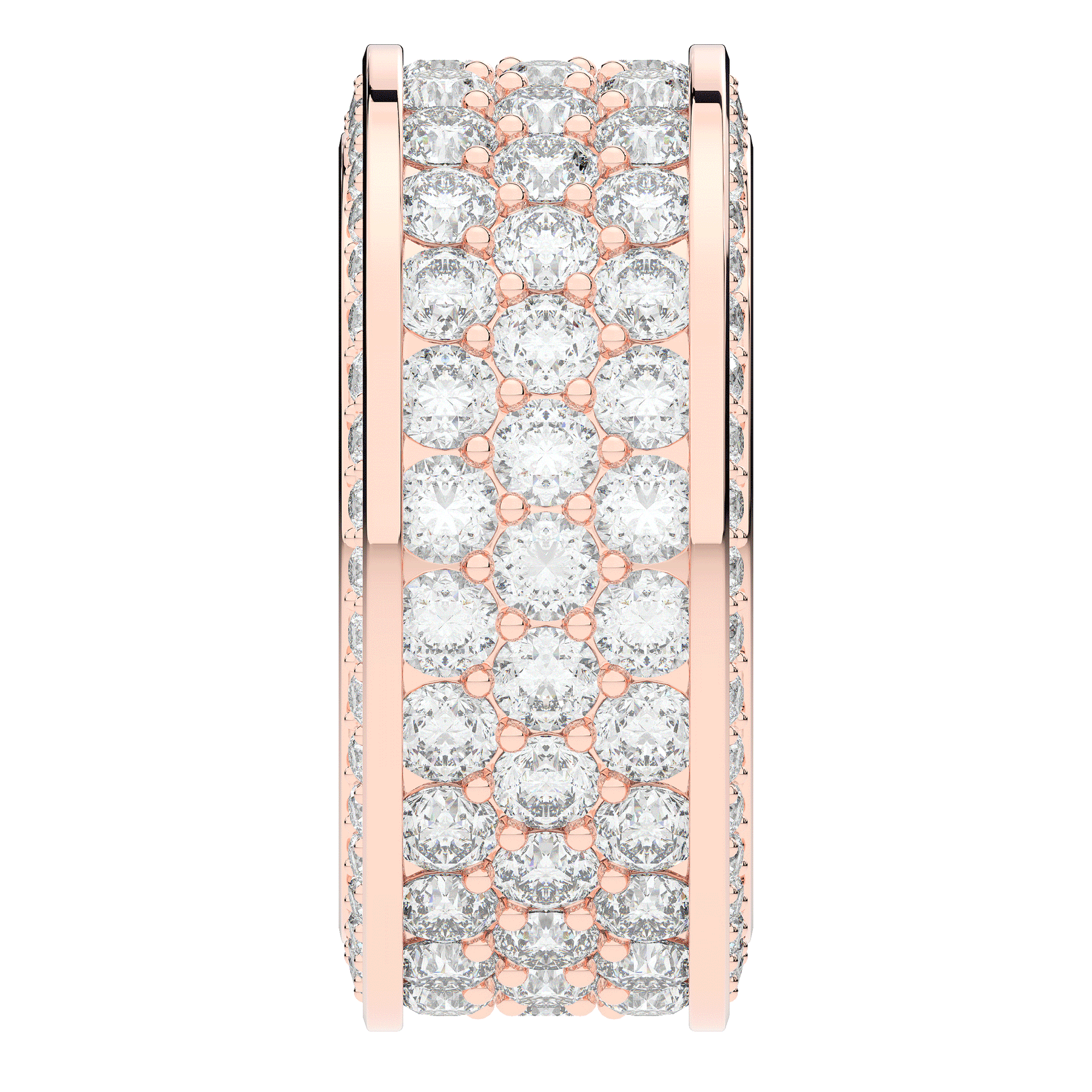 This stunning ring features 3 rows of bright lab grown round diamonds in the center as well as round lab diamonds on both the front and back of this eternity ring. This ring is available in 14k white, yellow or rose gold, 18k yellow gold, as well as platinum.