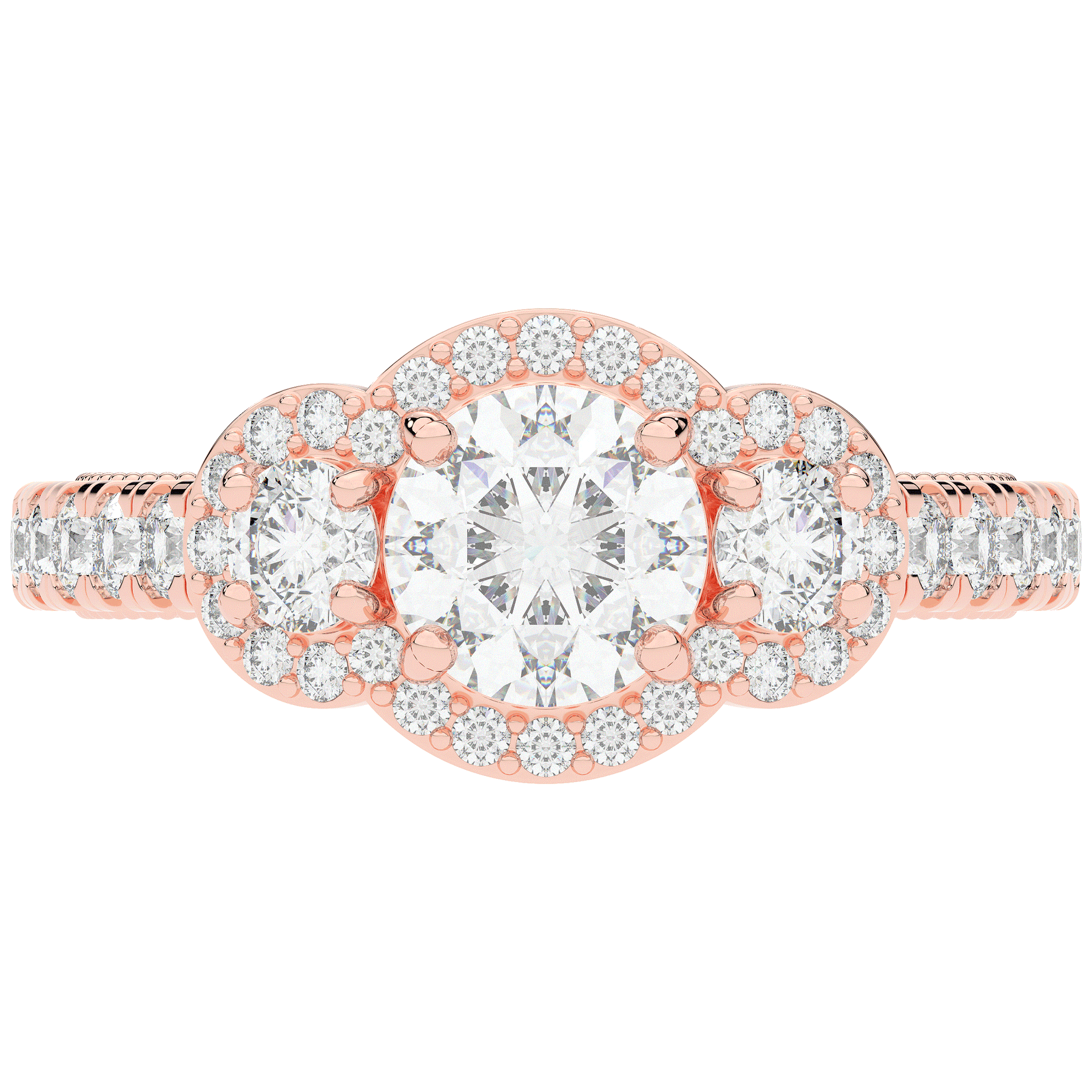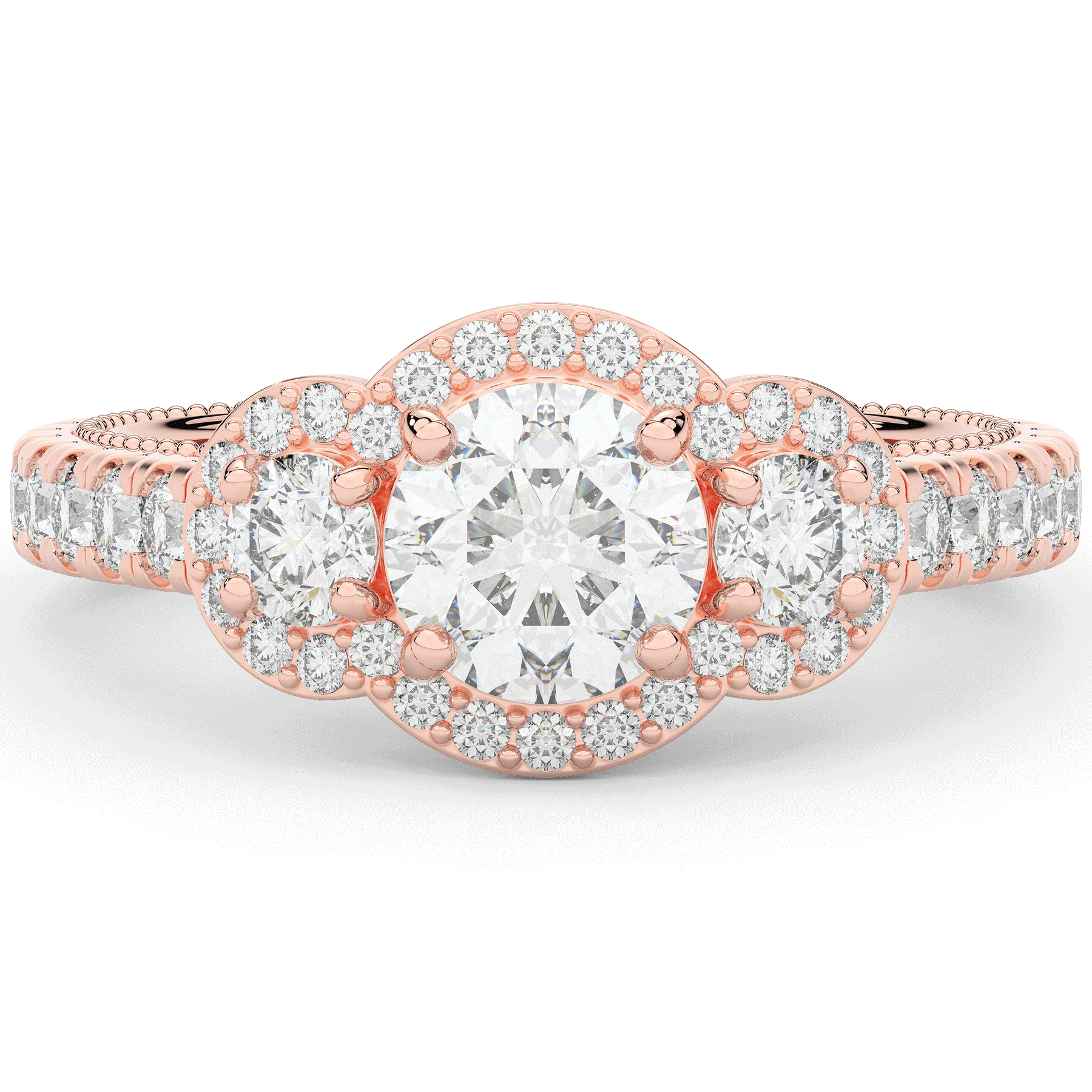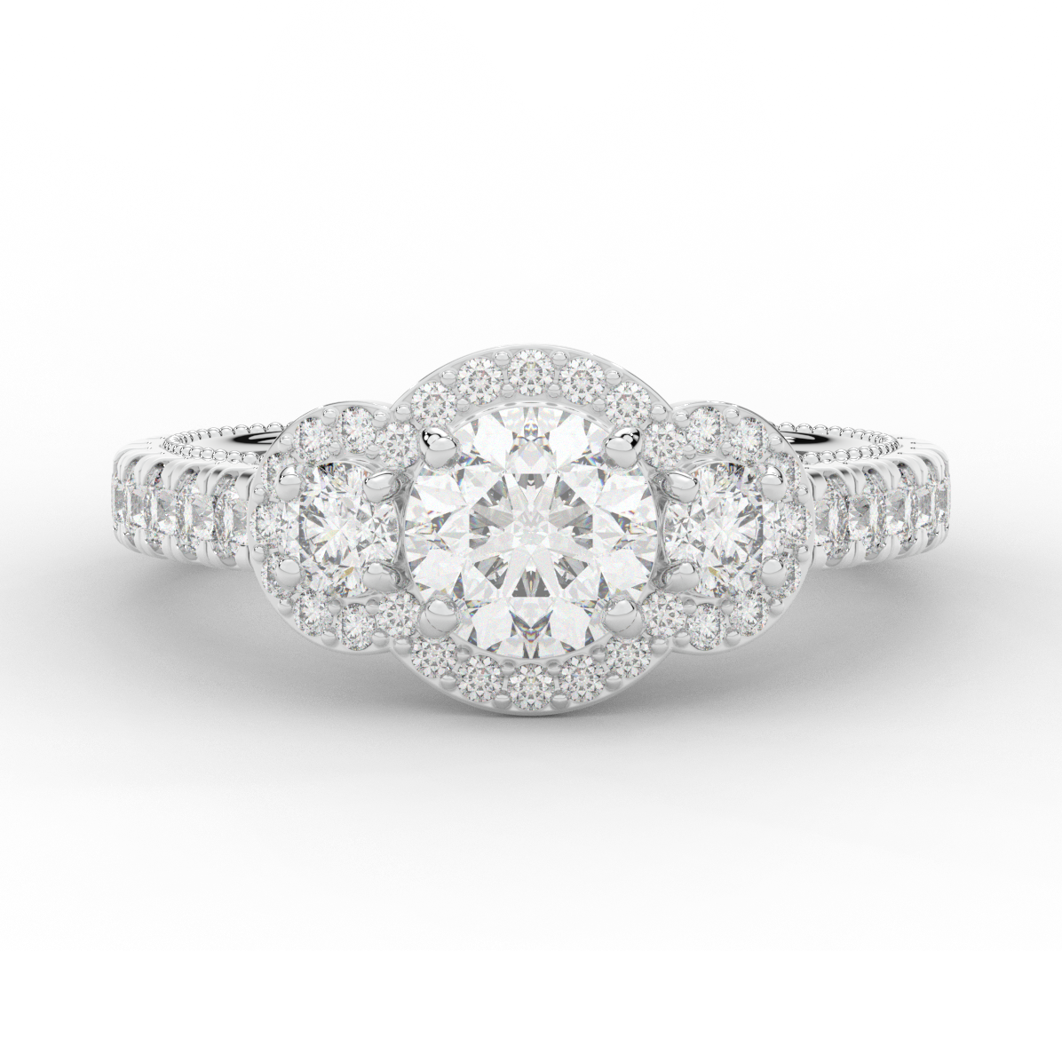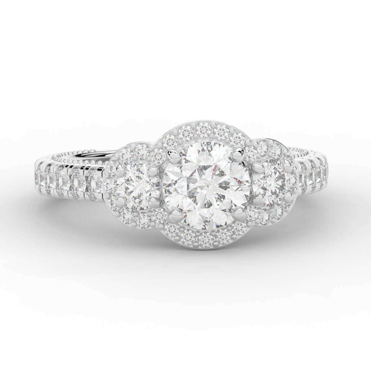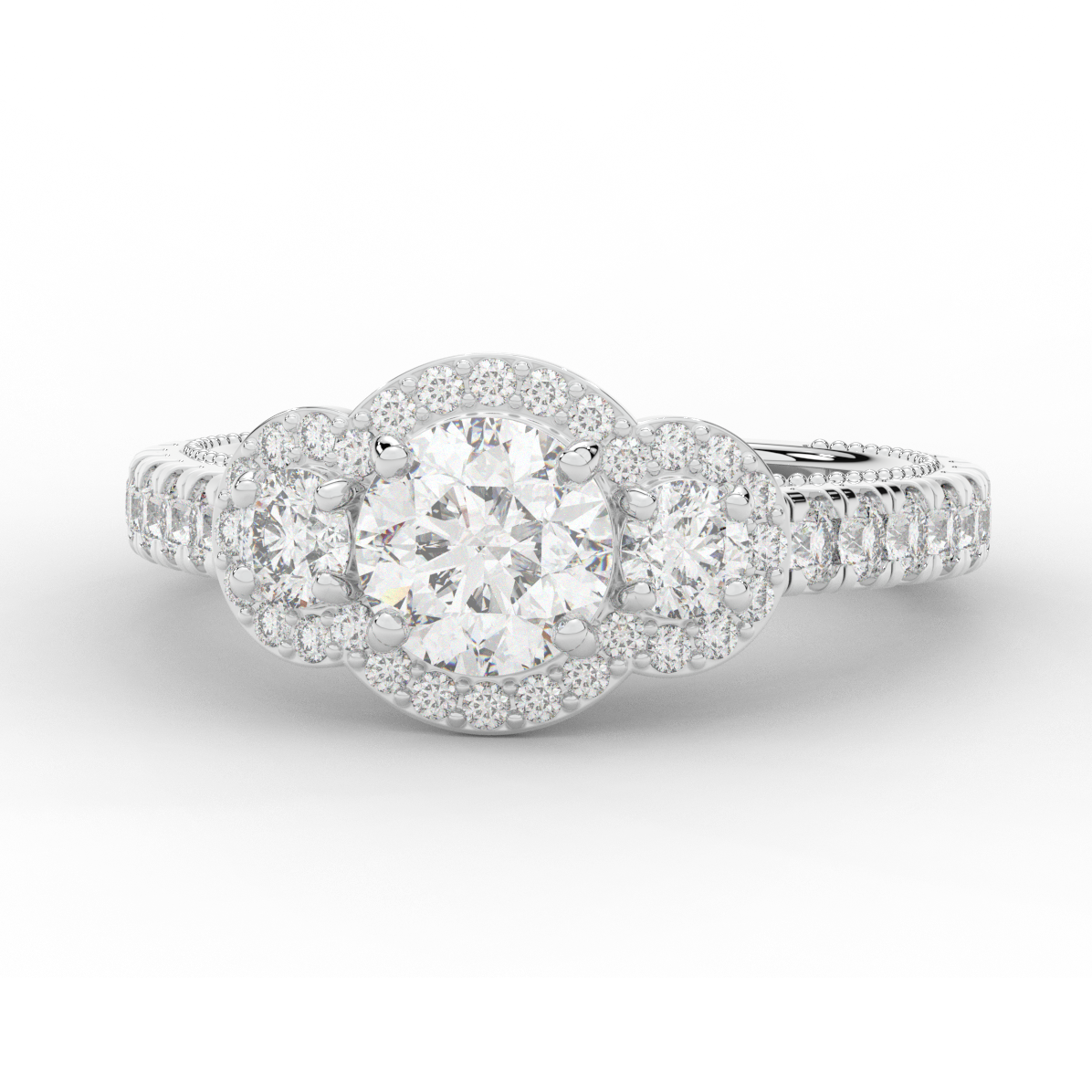 This stunning ring features 3 round lab diamonds in halos, set above a round lab diamond accented cathedral band, with 2 peekaboo lab diamonds set into the stylized bridge. This ring is available in 14k white, yellow or rose gold, 18k yellow gold, as well as platinum.
