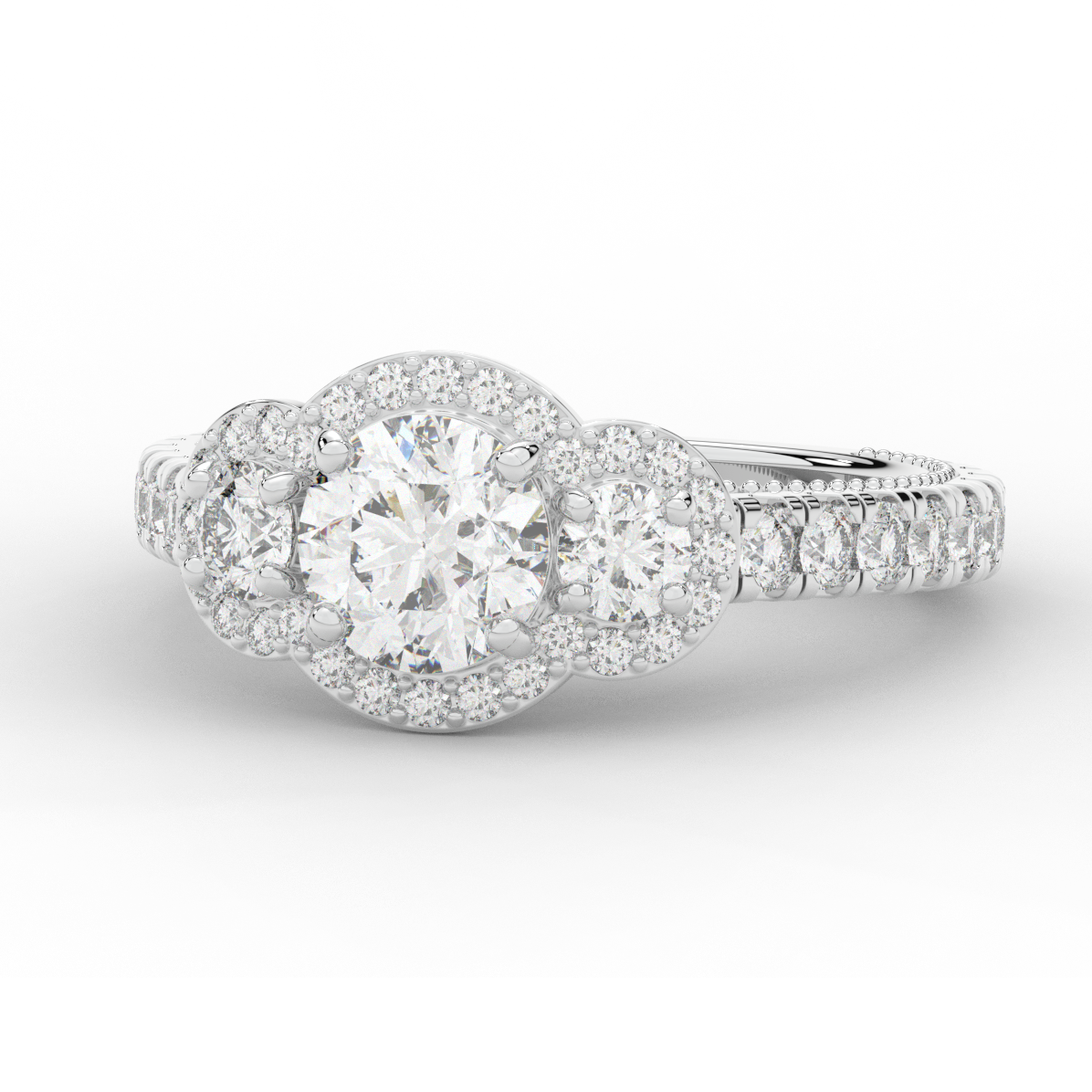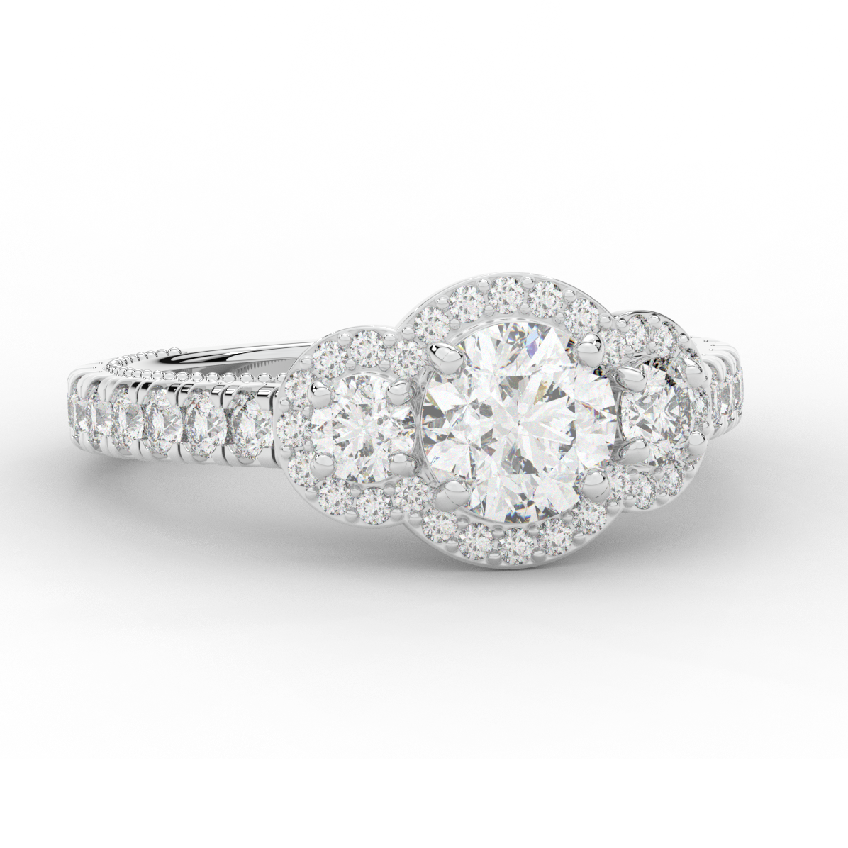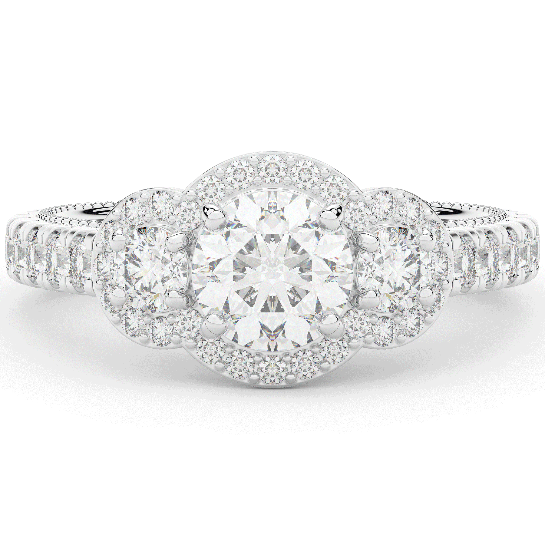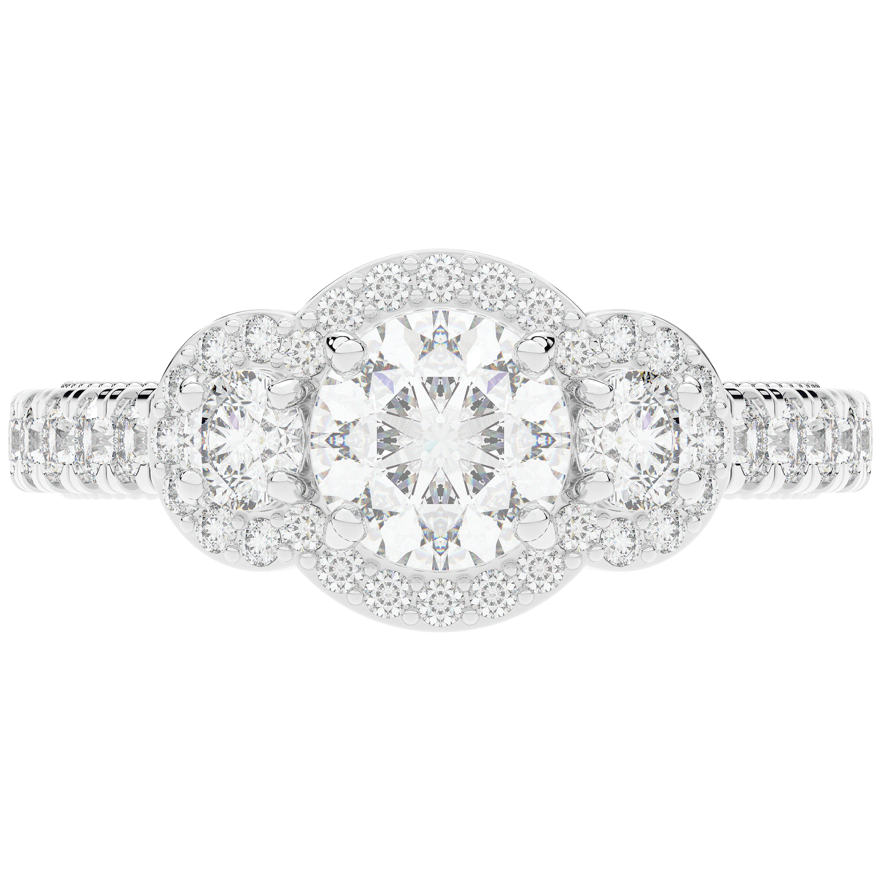This stunning ring features 3 round lab diamonds in halos, set above a round lab diamond accented cathedral band, with 2 peekaboo lab diamonds set into the stylized bridge. This ring is available in 14k white, yellow or rose gold, 18k yellow gold, as well as platinum.
