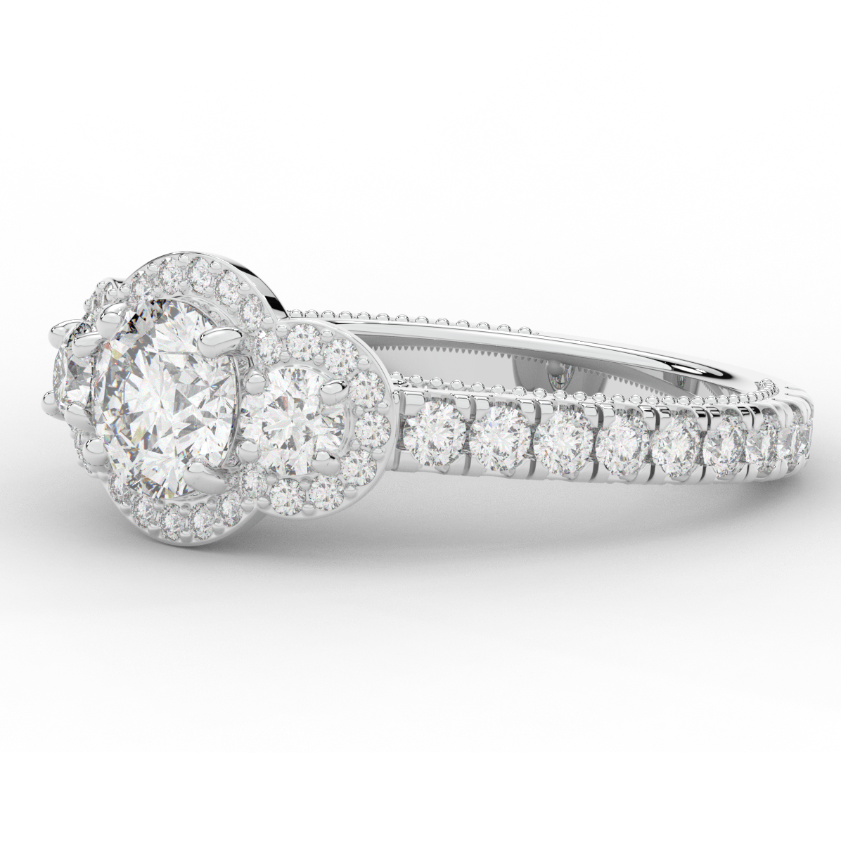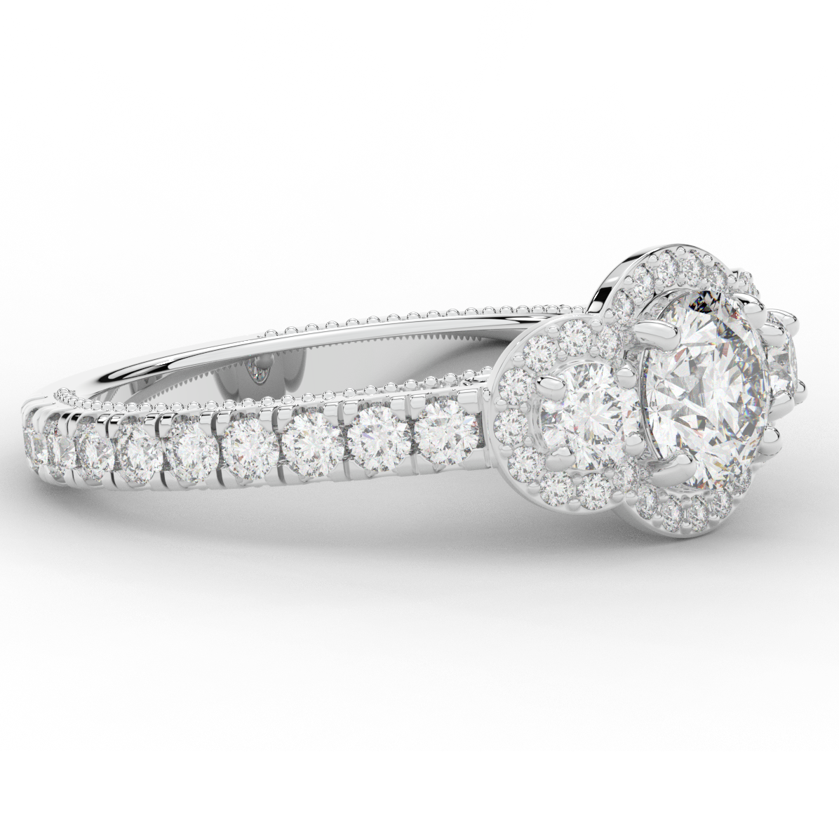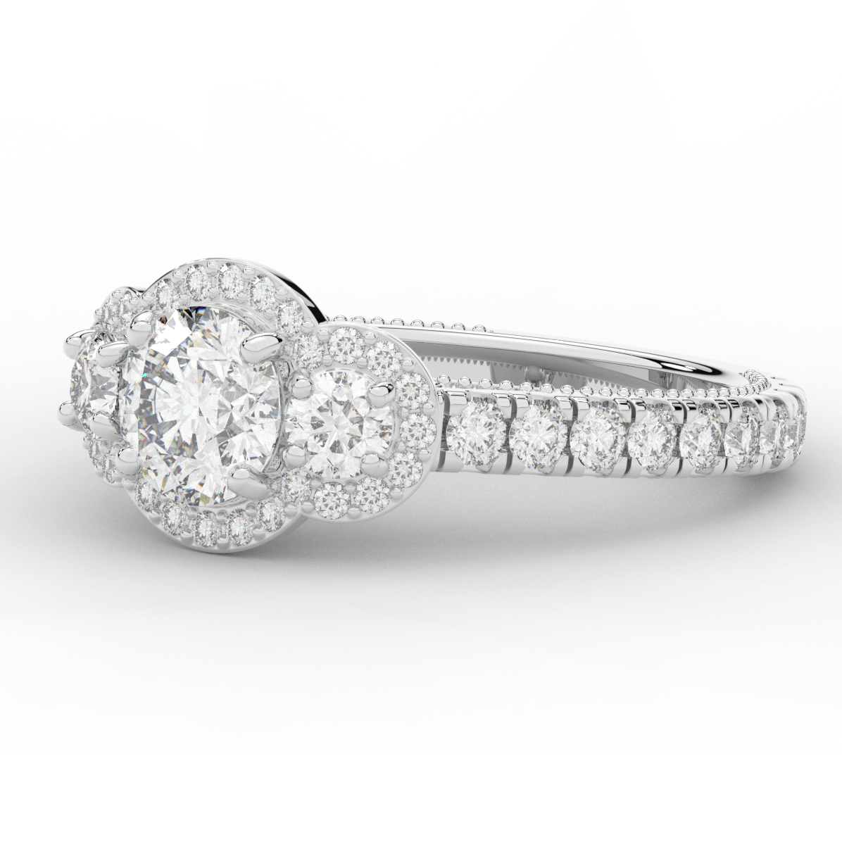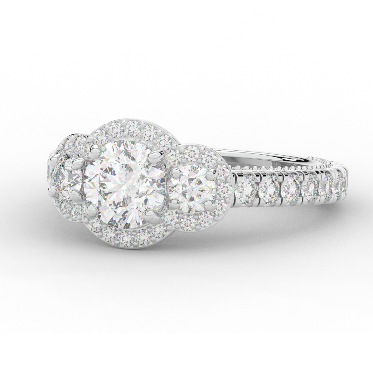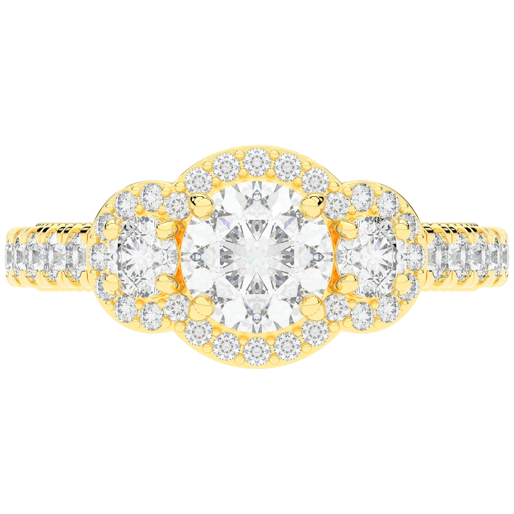 This stunning ring features 3 round lab diamonds in halos, set above a round lab diamond accented cathedral band, with 2 peekaboo lab diamonds set into the stylized bridge. This ring is available in 14k white, yellow or rose gold, 18k yellow gold, as well as platinum.