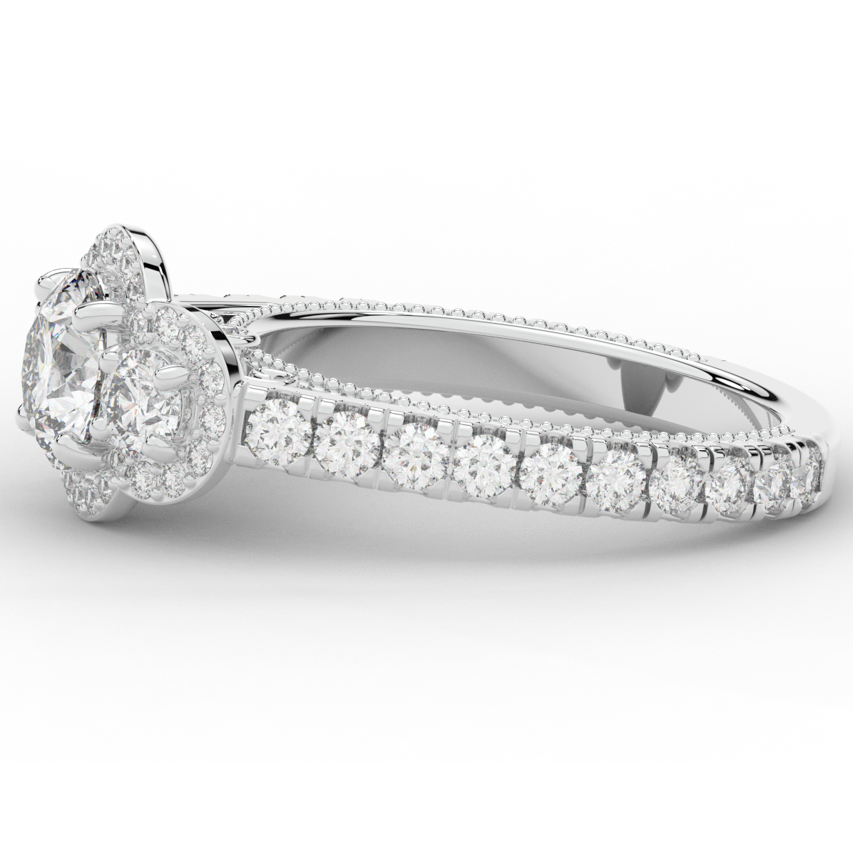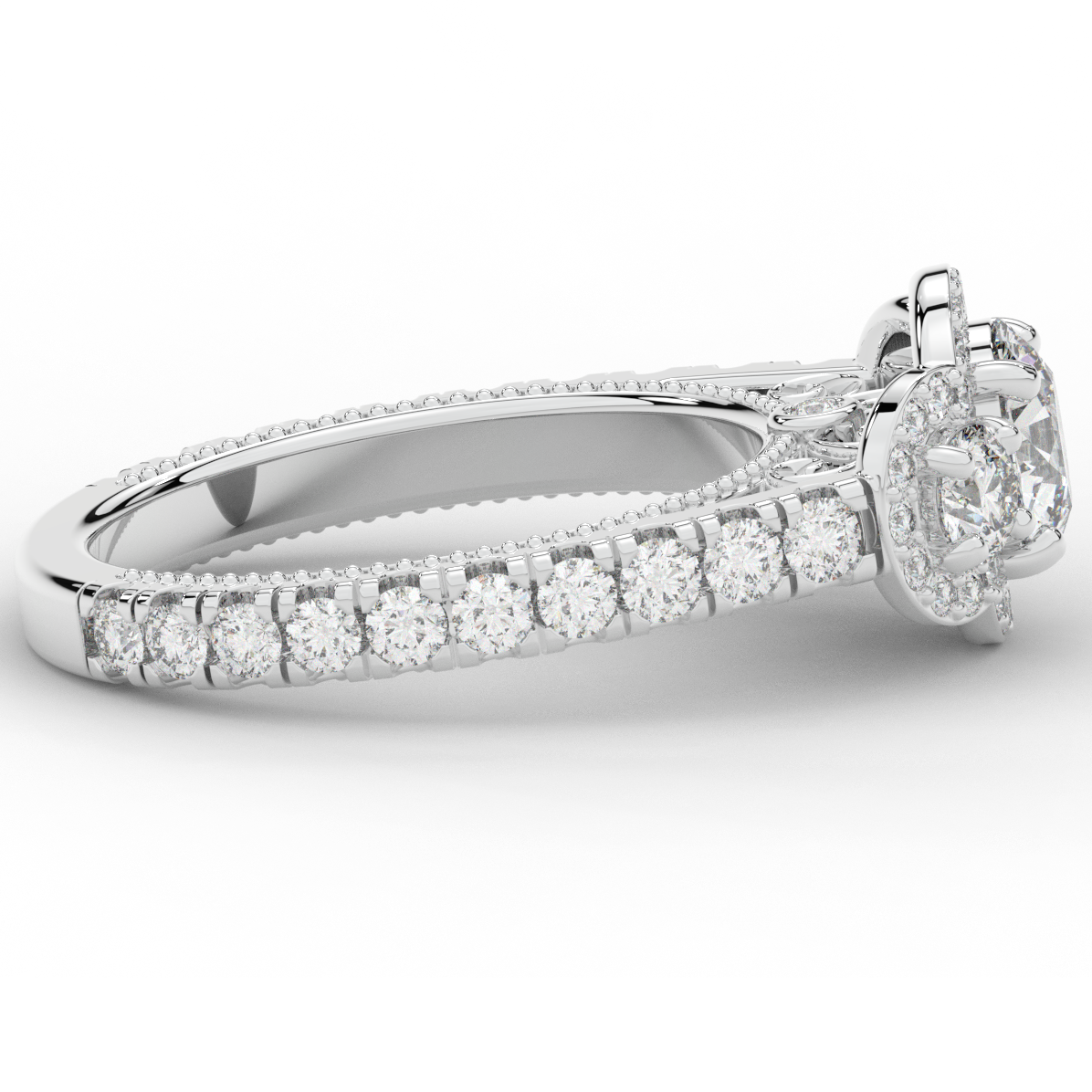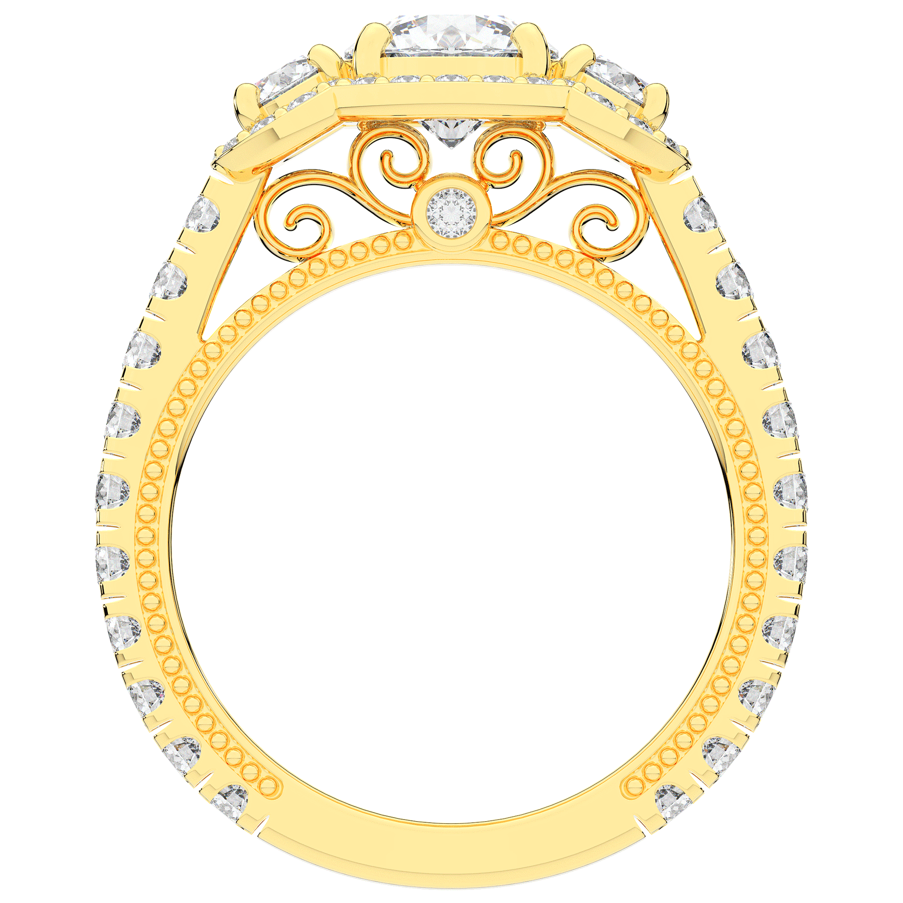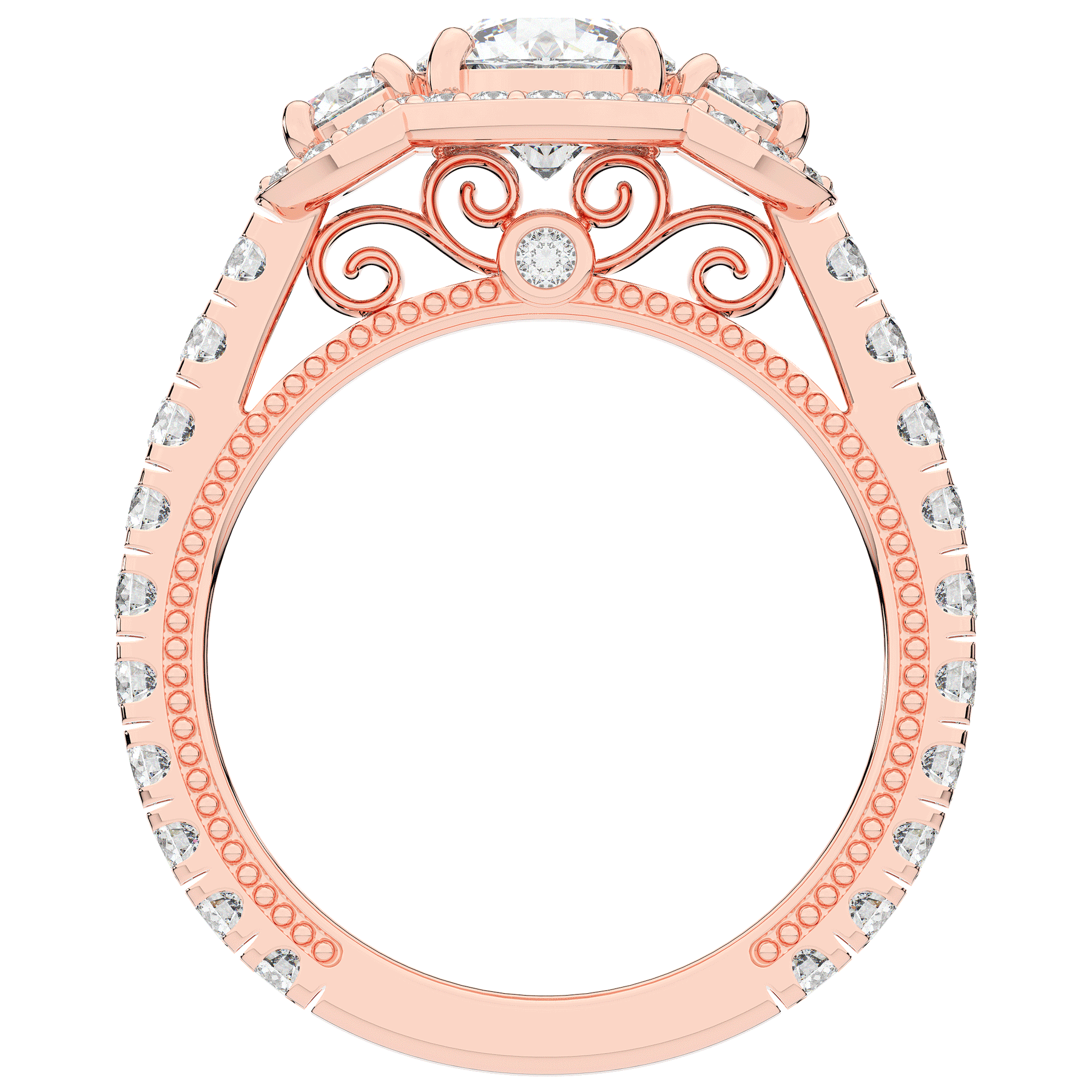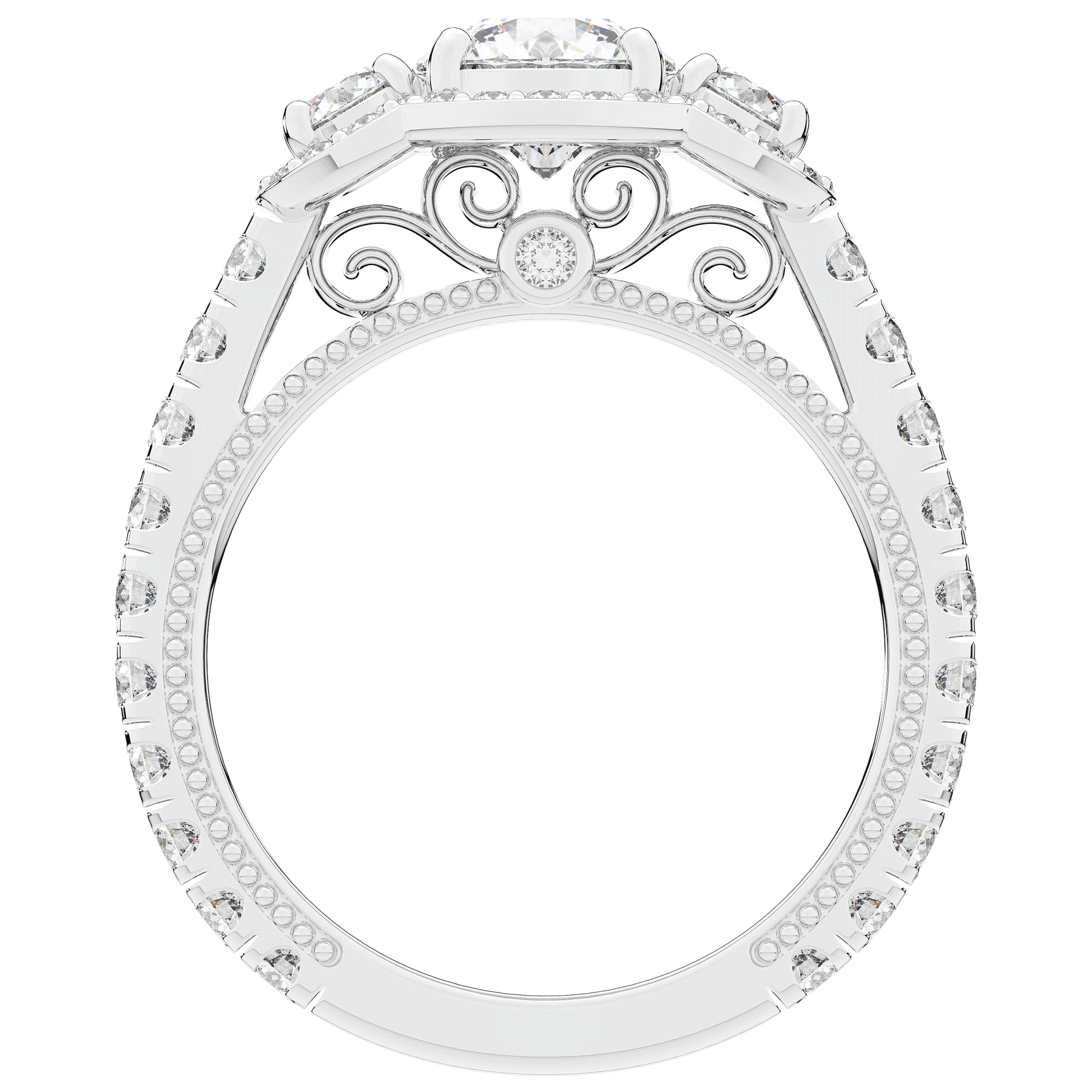 This stunning ring features 3 round lab diamonds in halos, set above a round lab diamond accented cathedral band, with 2 peekaboo lab diamonds set into the stylized bridge. This ring is available in 14k white, yellow or rose gold, 18k yellow gold, as well as platinum.