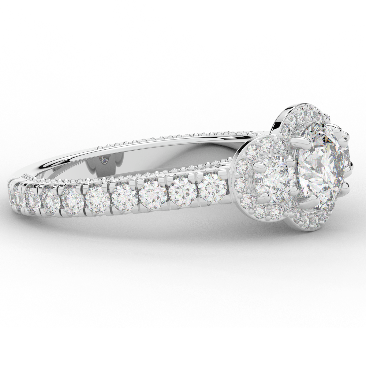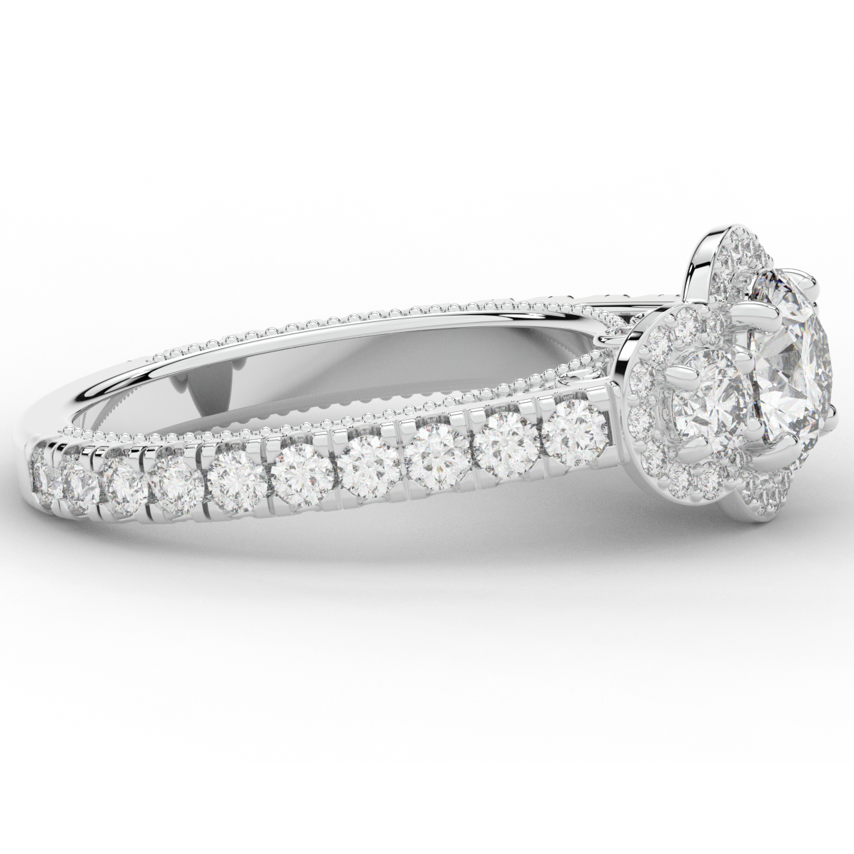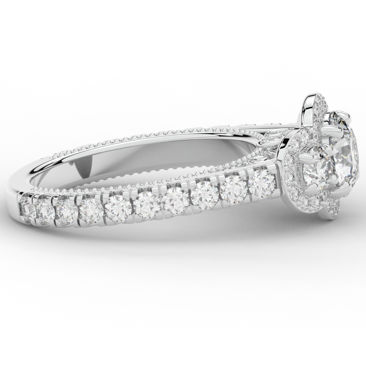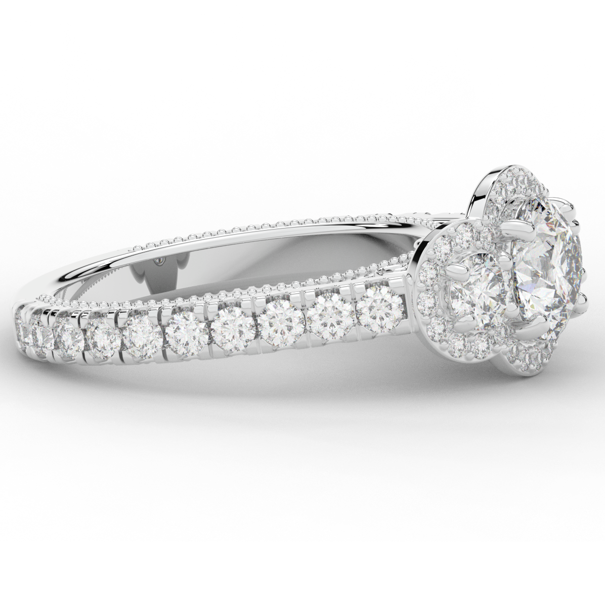 This stunning ring features 3 round lab diamonds in halos, set above a round lab diamond accented cathedral band, with 2 peekaboo lab diamonds set into the stylized bridge. This ring is available in 14k white, yellow or rose gold, 18k yellow gold, as well as platinum.