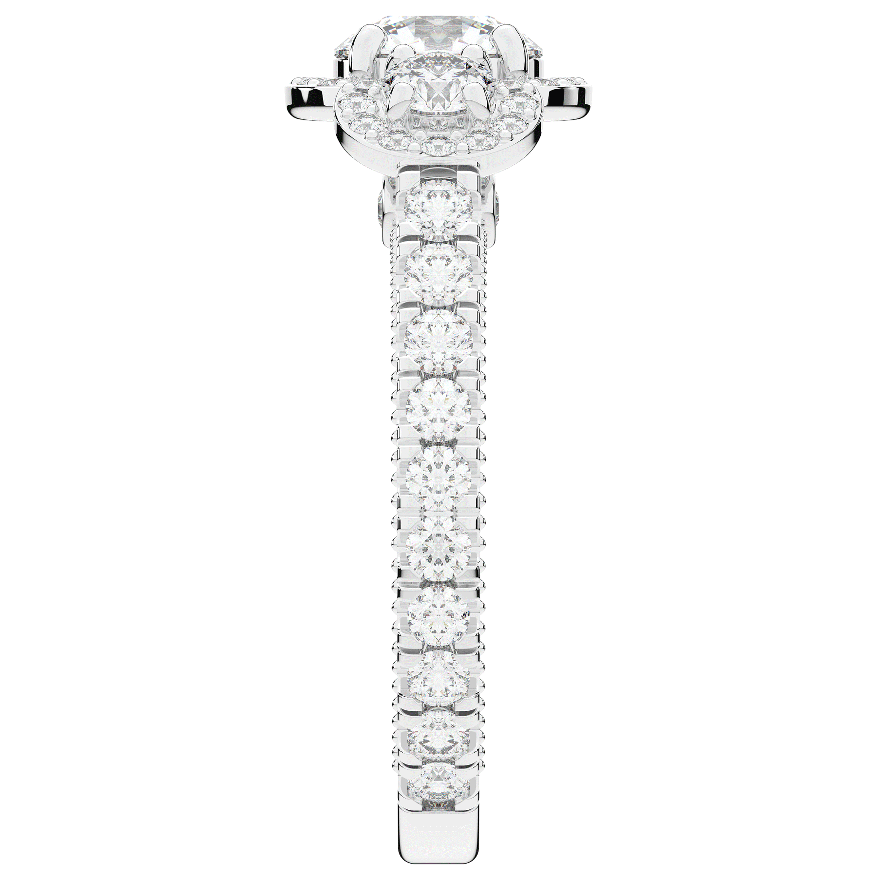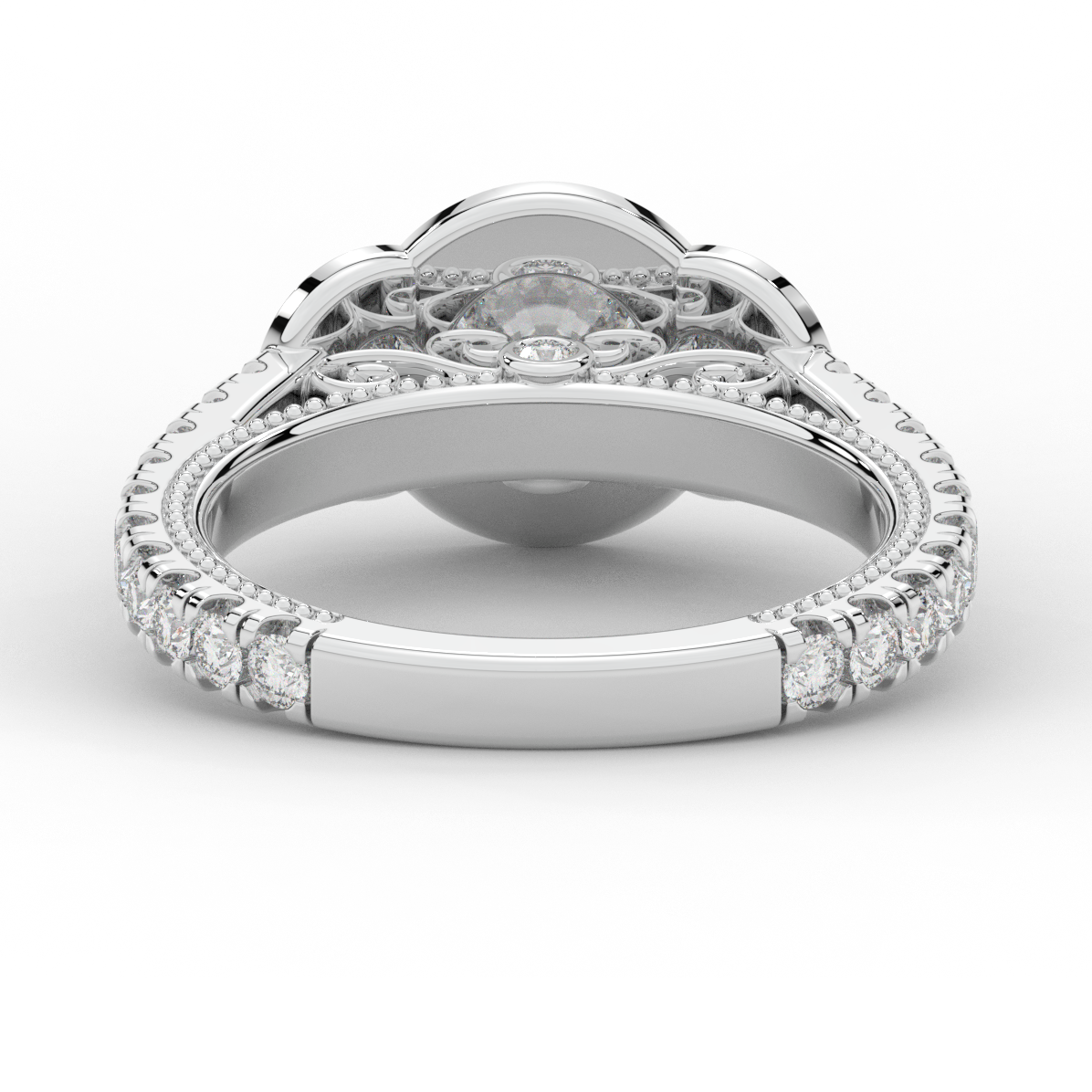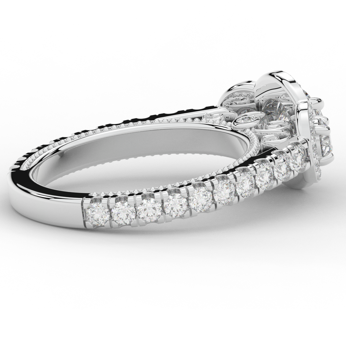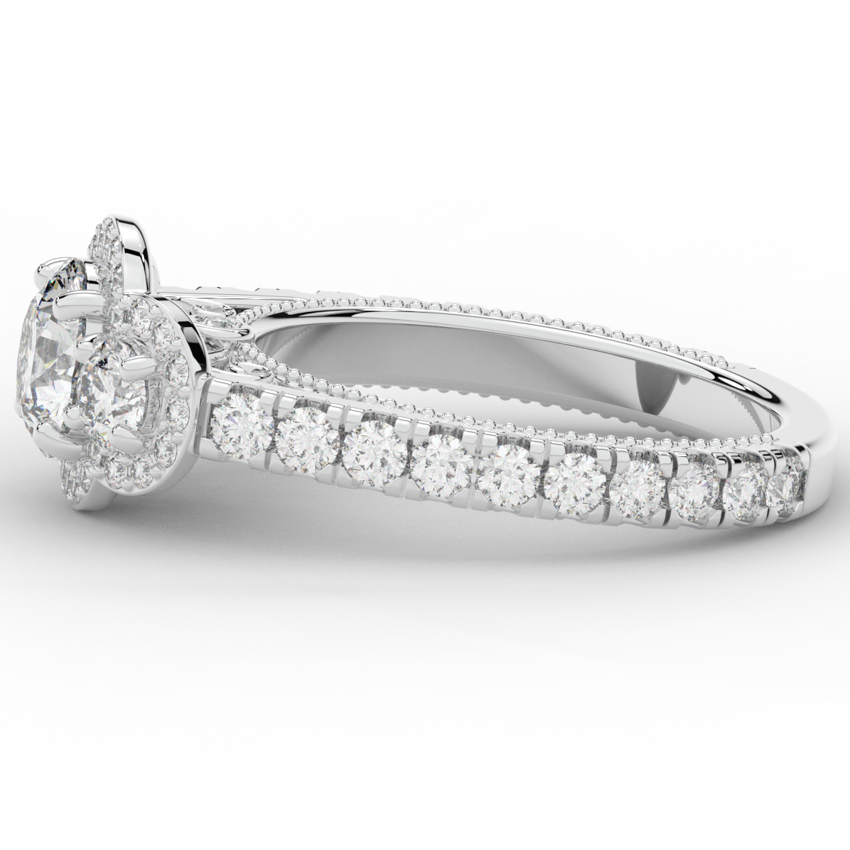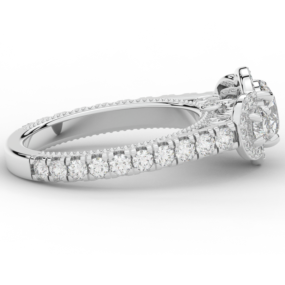 This stunning ring features 3 round lab diamonds in halos, set above a round lab diamond accented cathedral band, with 2 peekaboo lab diamonds set into the stylized bridge. This ring is available in 14k white, yellow or rose gold, 18k yellow gold, as well as platinum.